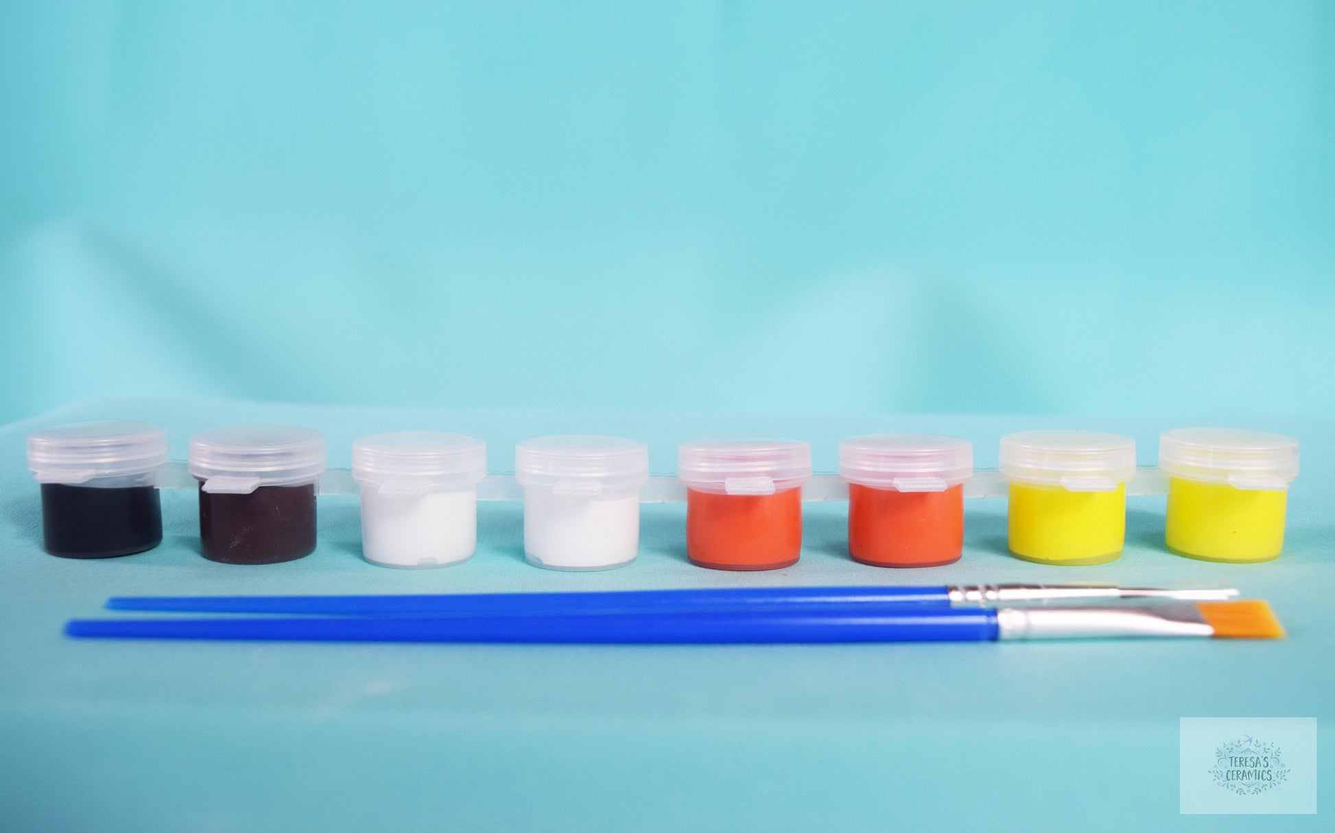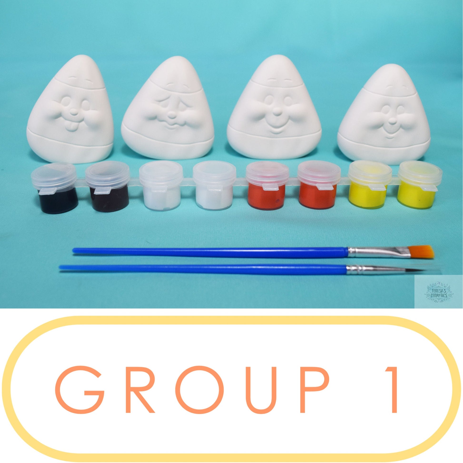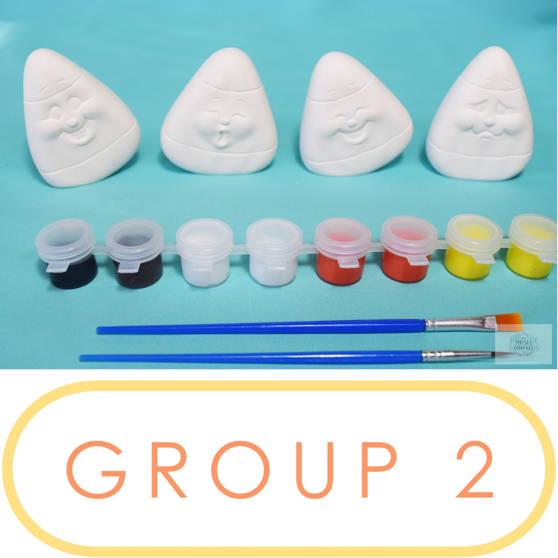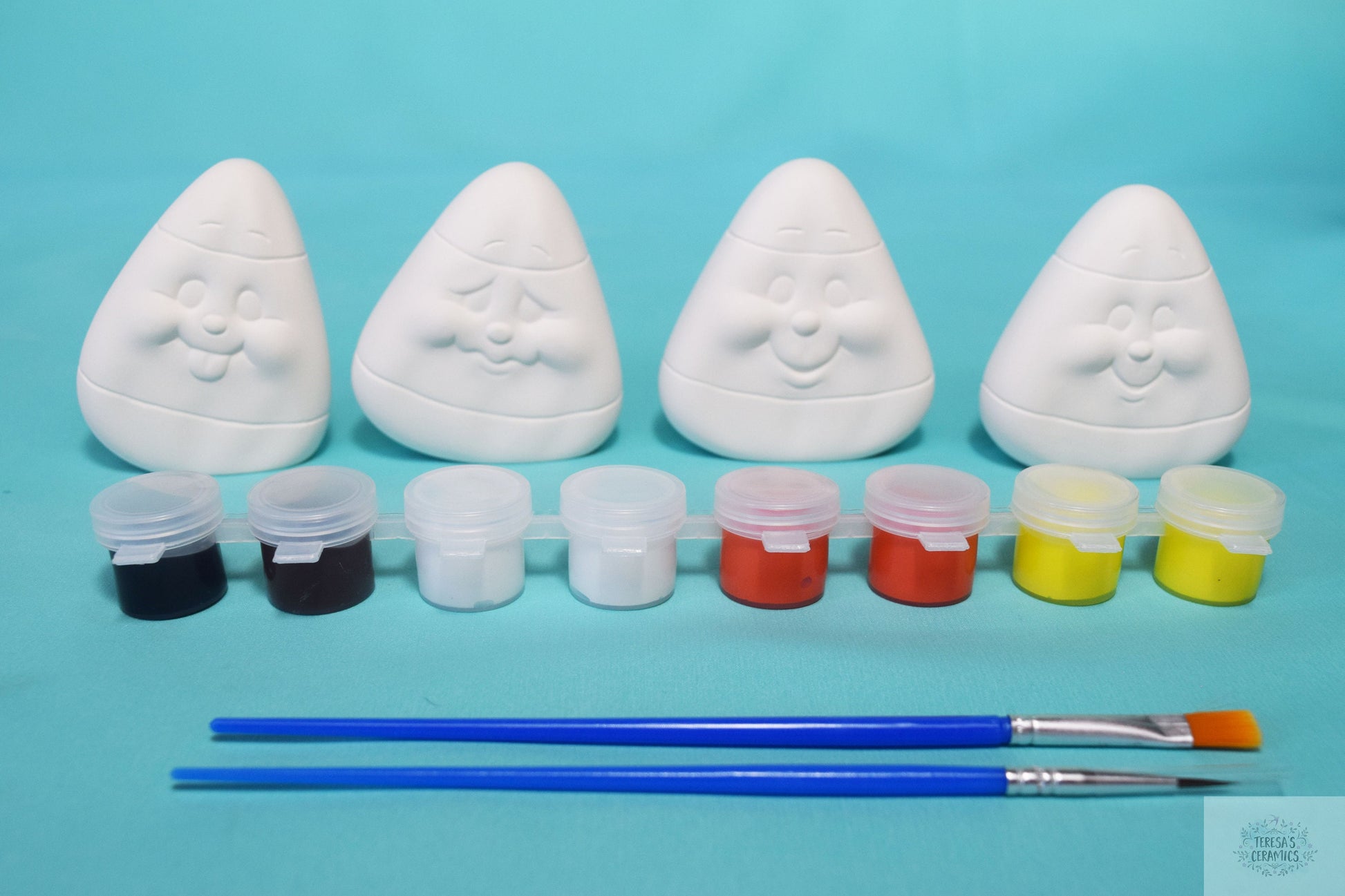 Your candy corn kit comes with 8 paint pods and two paint brushes. The paint has: orange, yellow, white and black colors to make the perfect candy corn faces. Paint brushes included is a flat brush for base coating the ceramic and a fine tip brush for precision painting such as eyes.