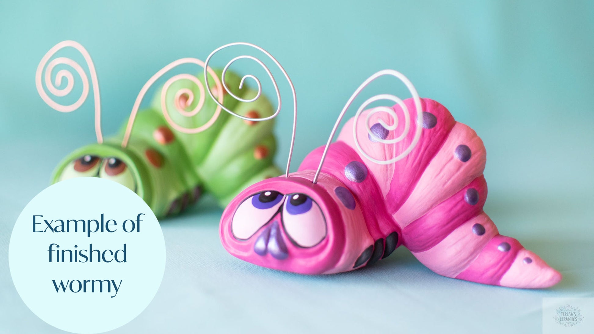 Wormy is shipped as bisque, you can easily paint him using any acrylic paint. He is a great paint project for a beginner of any age.