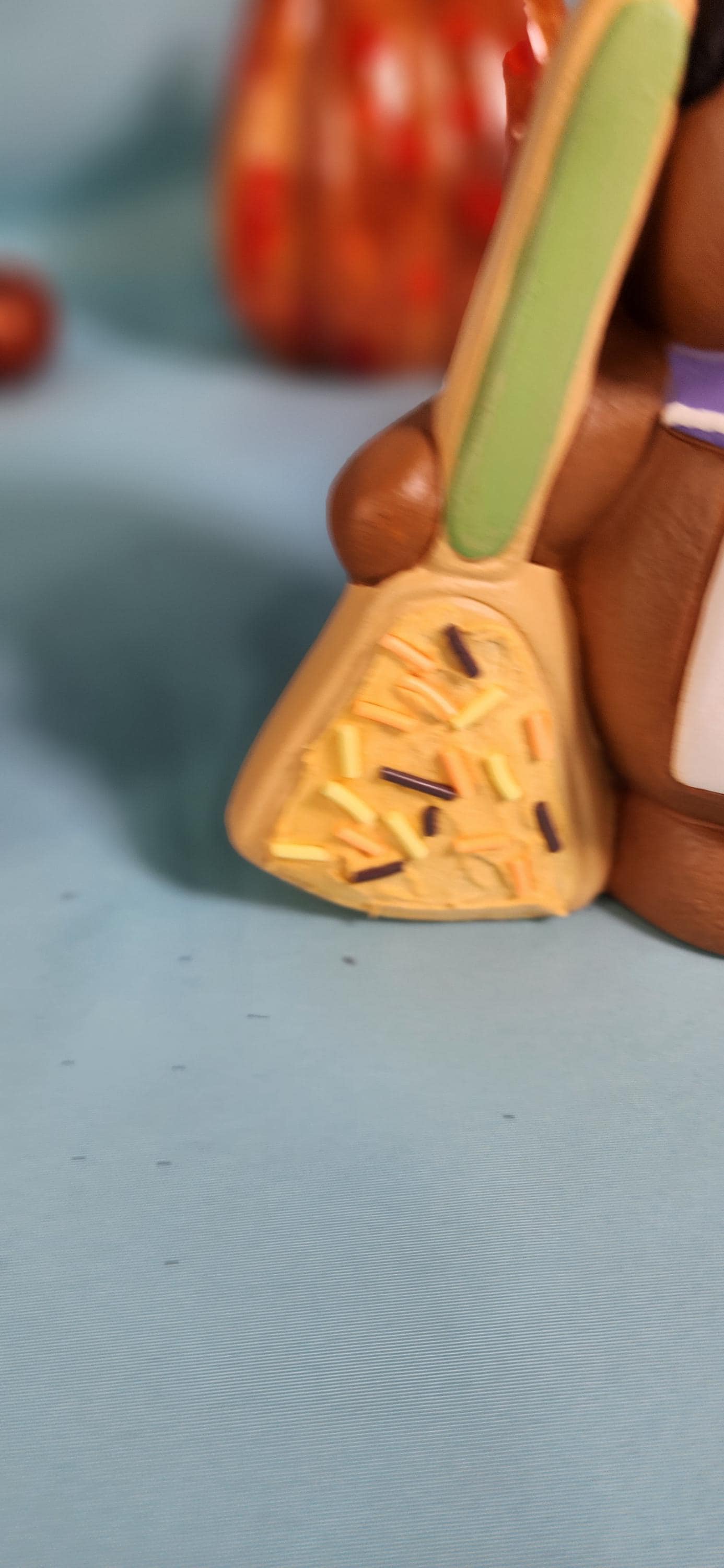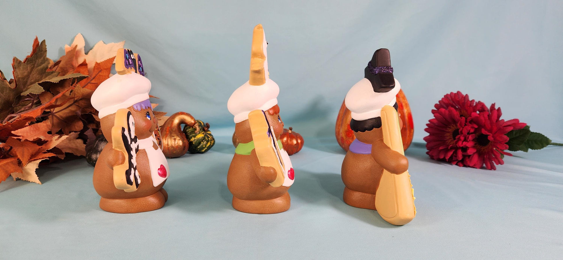 This spooky cute trio is ready to bake! These 3 little gingerbread goofs have gotten into the kitchen and they're making Halloween cookies! The amount of details on these guys is spectacular. They have hand pipes frosting, beautiful faux sprinkles, and the most darling little cookies. Pick these babies up and have the most adorable holiday decor!