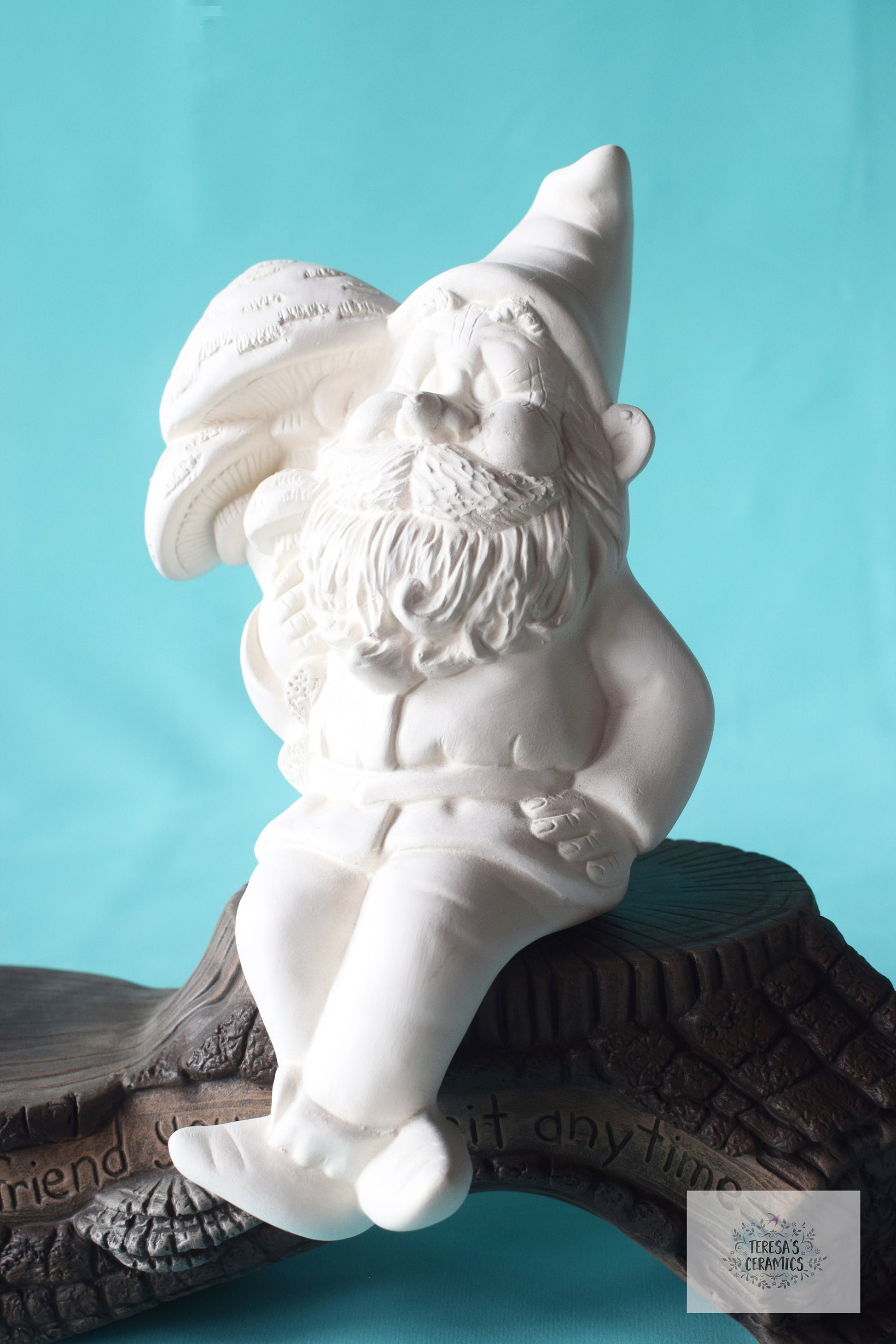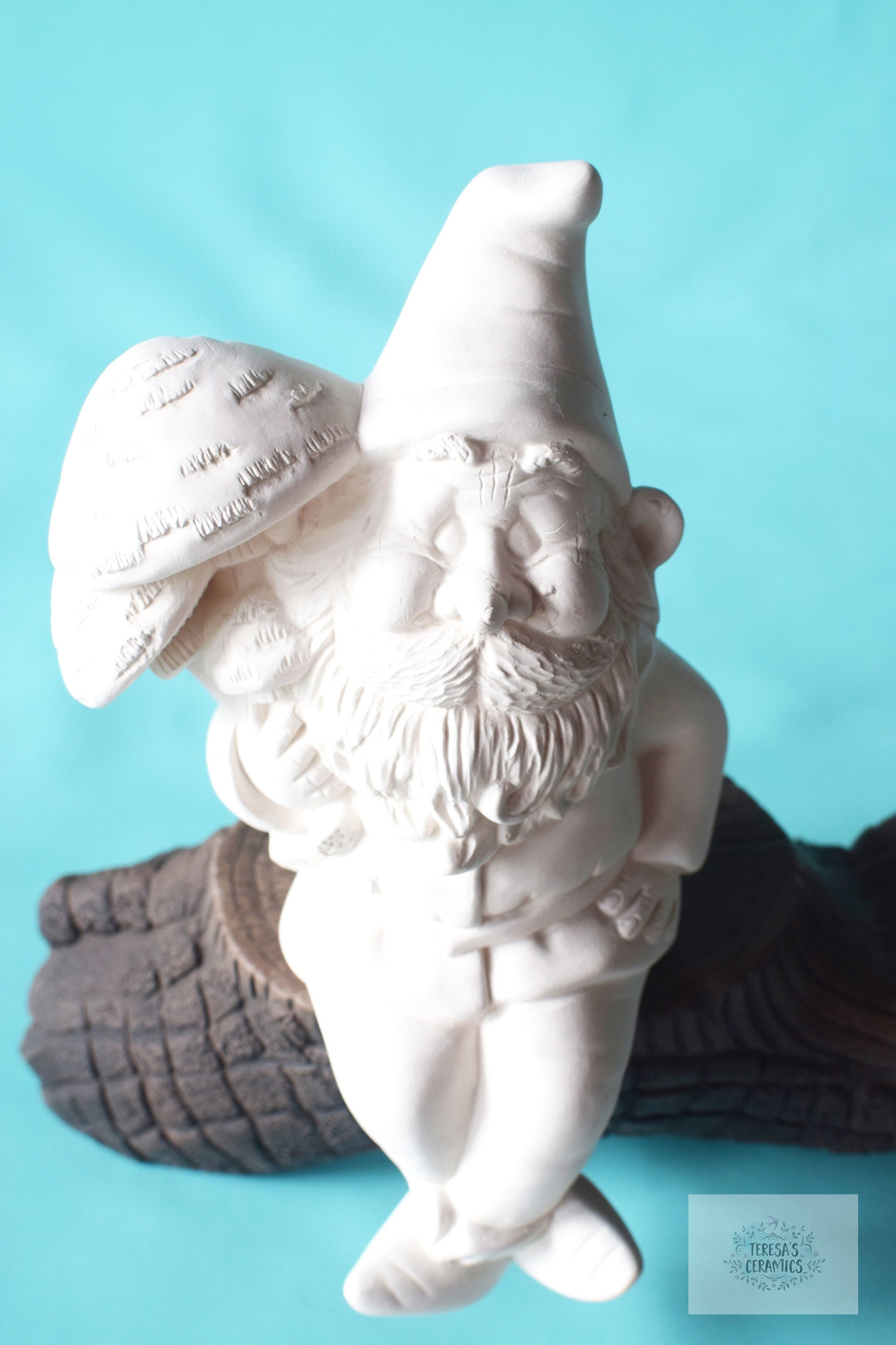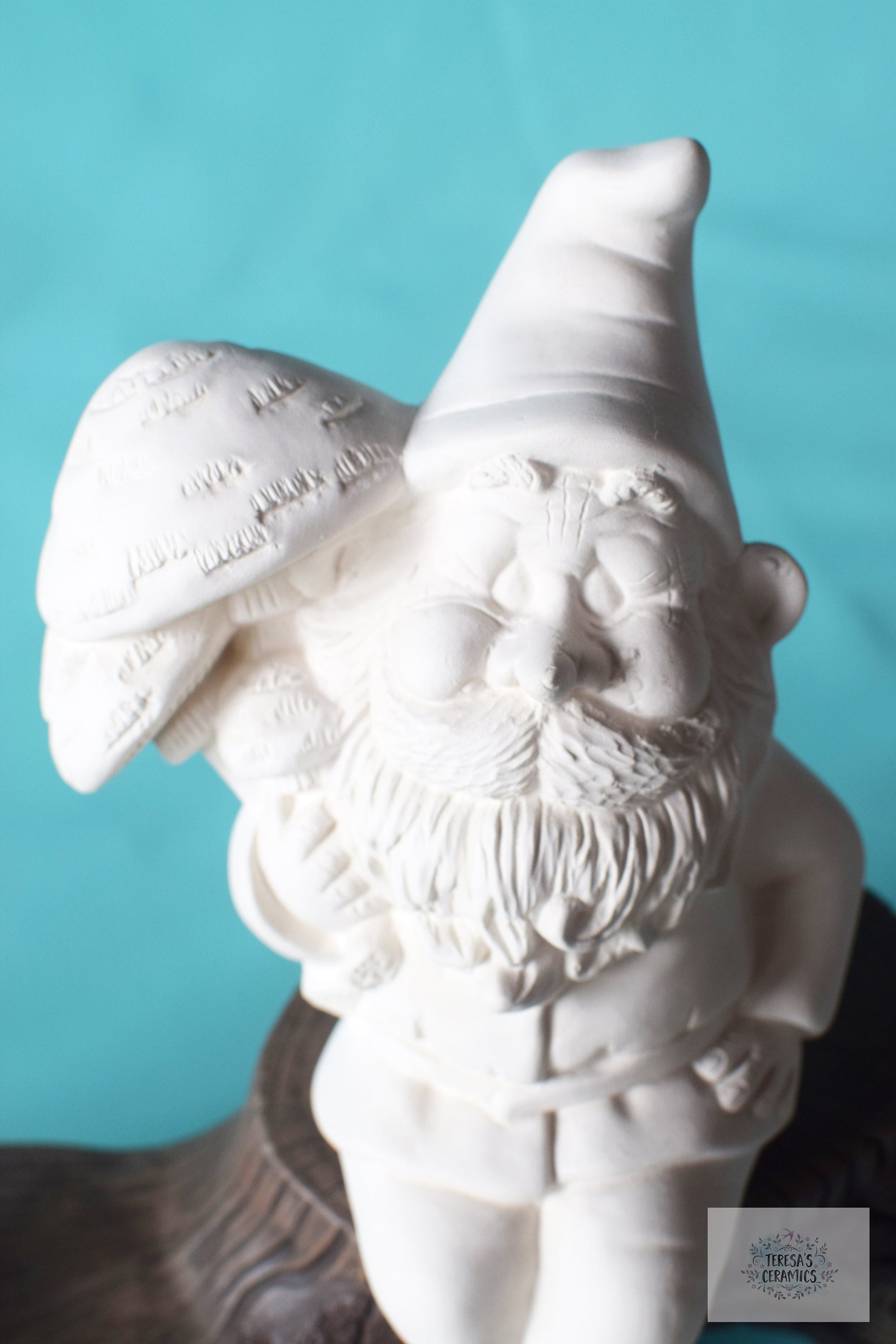 Mushroom gnome is handmade in my home studio, he is poured into a ceramic mold, dried and cleaned as greenware and fired in the kiln.