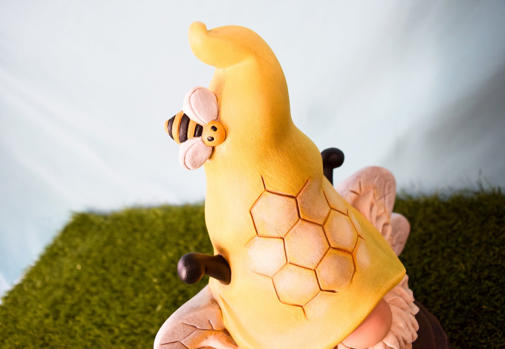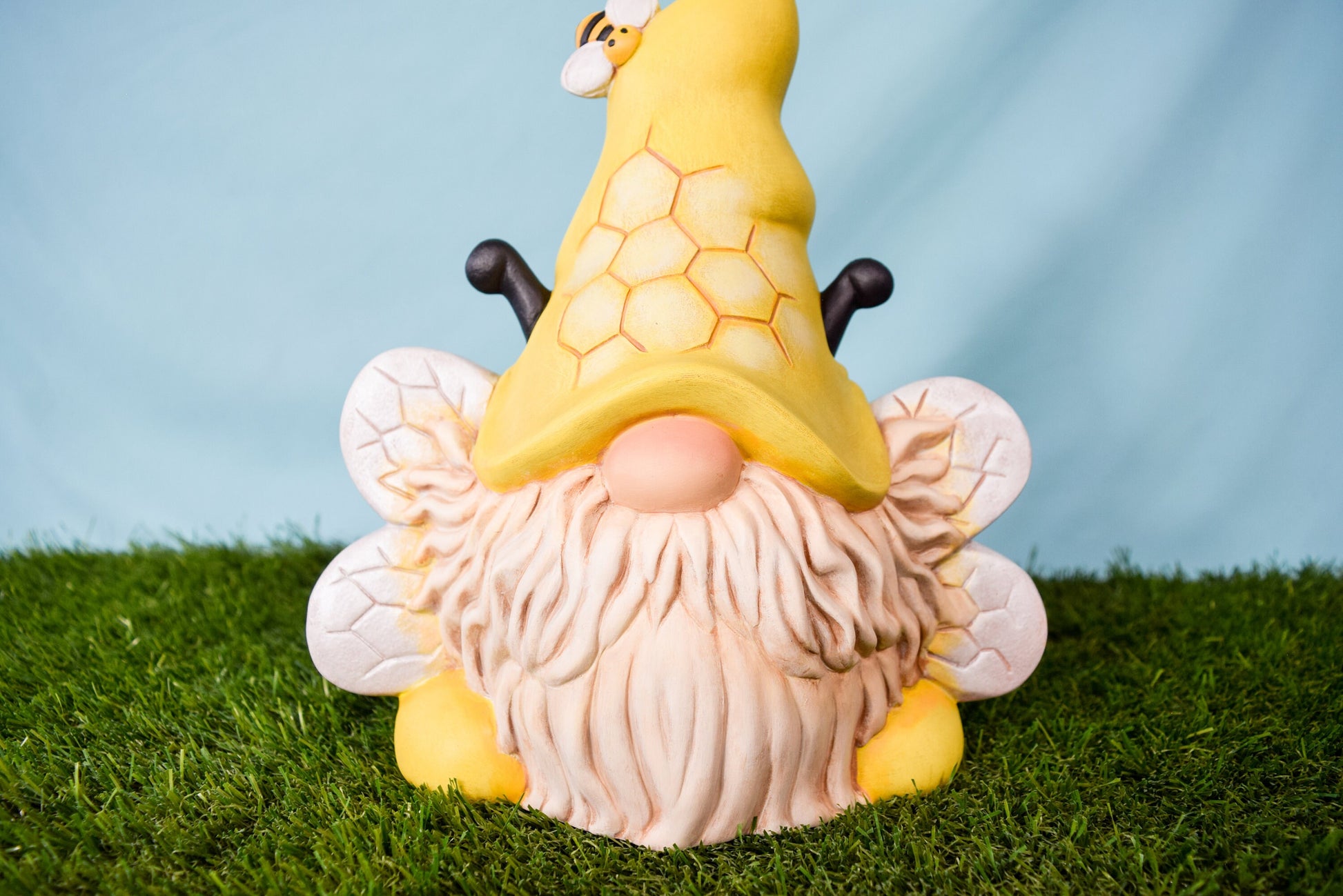 Each bumblebee gnome is handmade in my home studio using the slip casting method. Each ceramic is poured by hand, sets within a day, removed from the ceramic mold, cleaned and fired in the kiln. Once the gnome is fired it is removed after a day of cooling in the kiln, cleaned once more and painted by hand. Finally it is sealed with clear varnish.