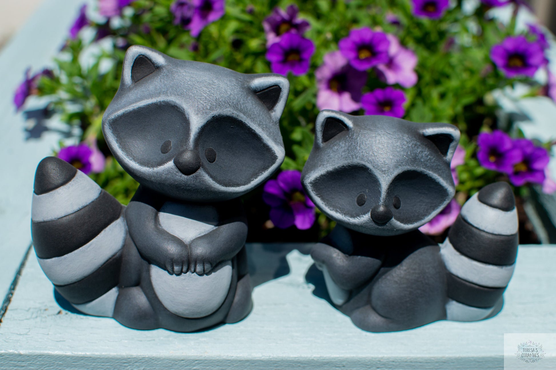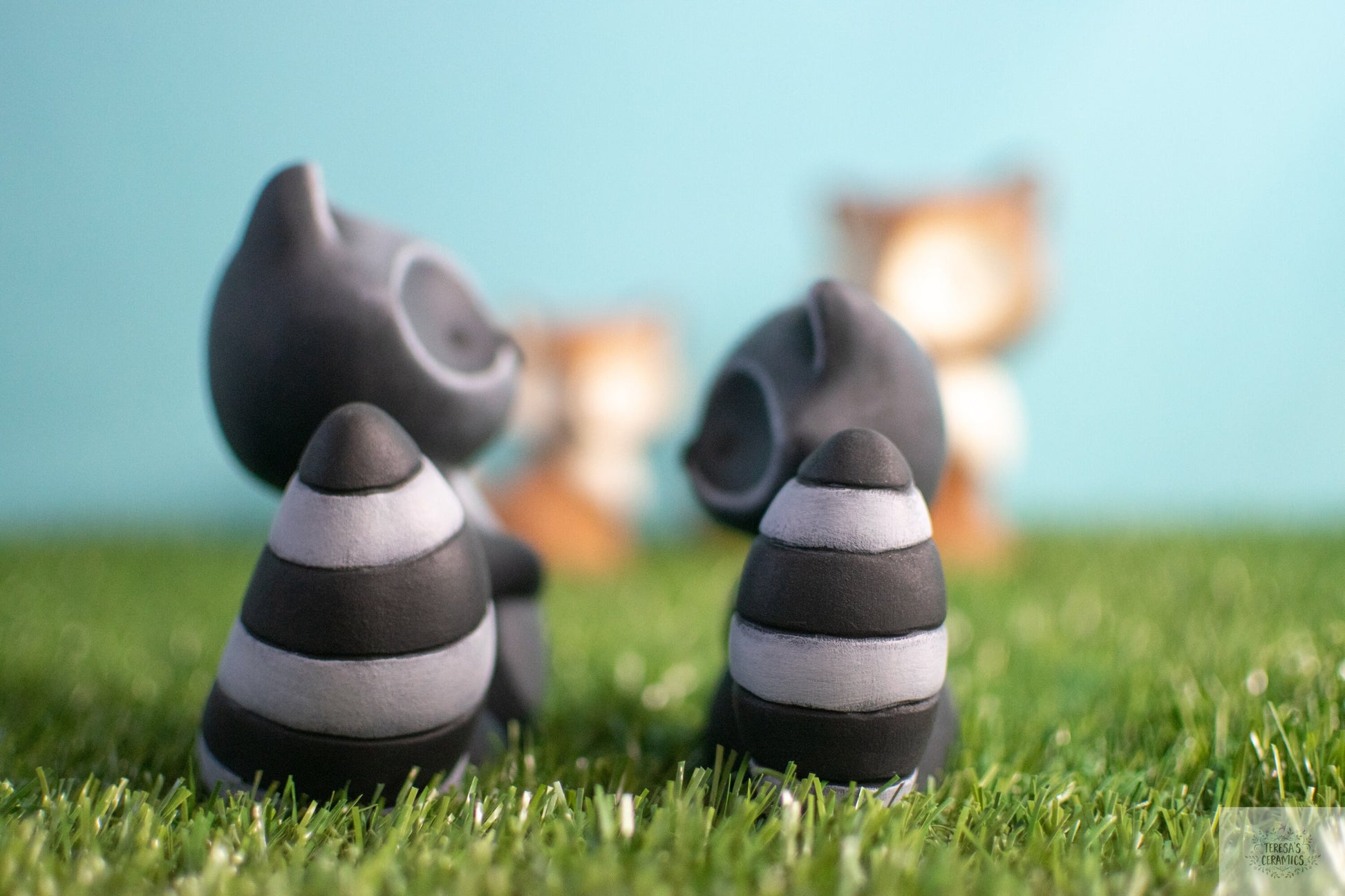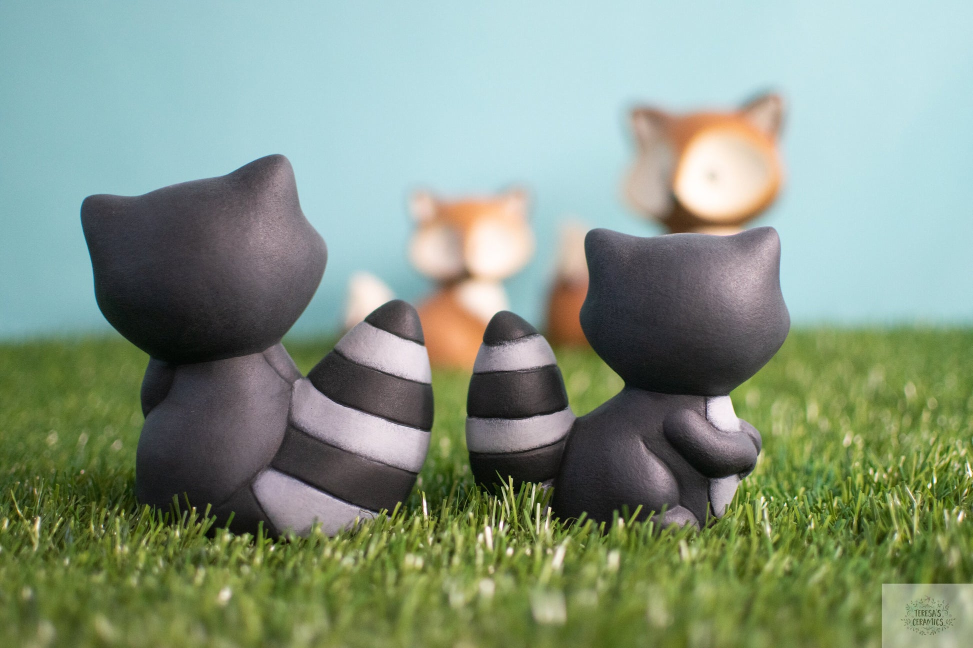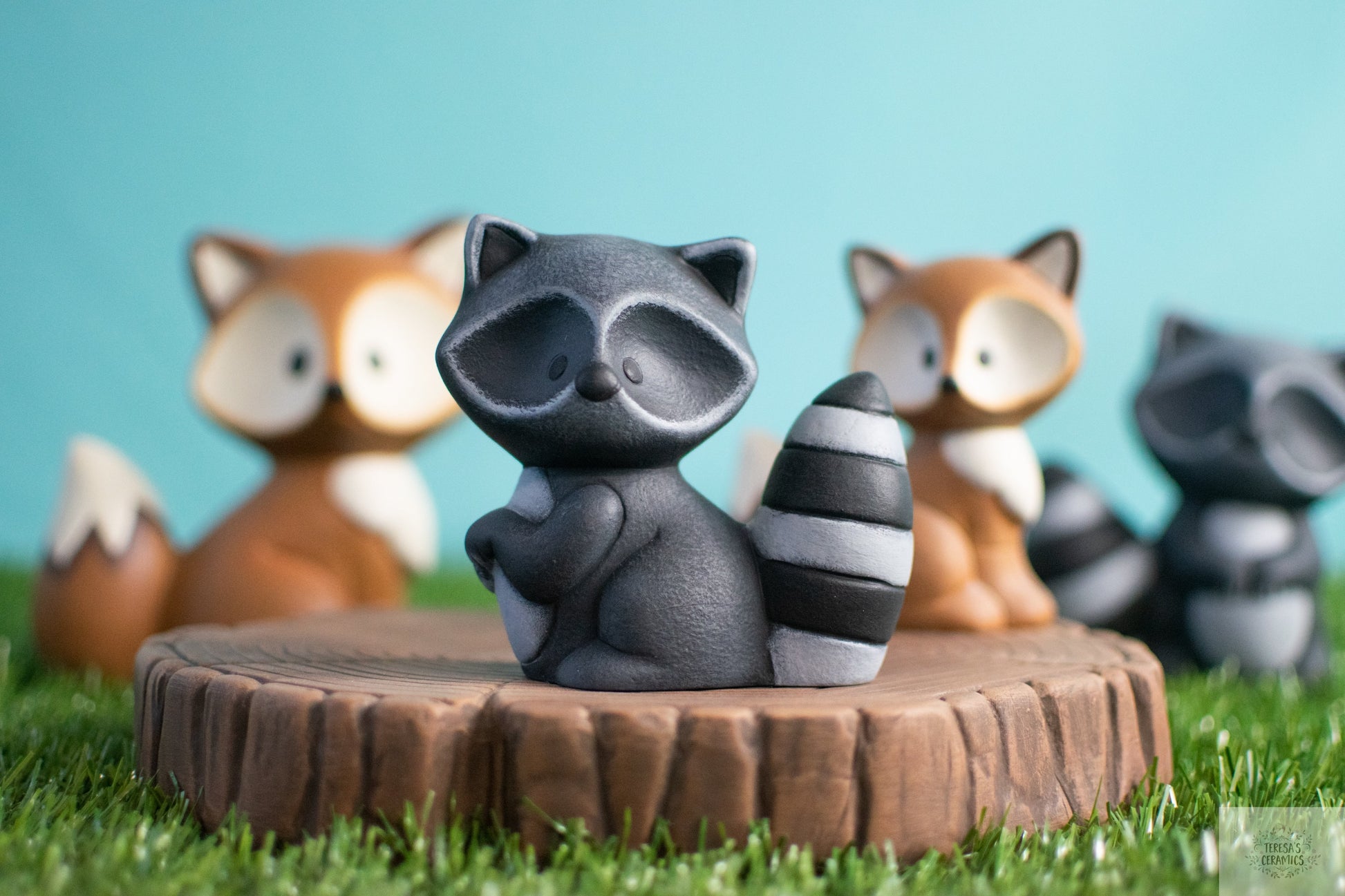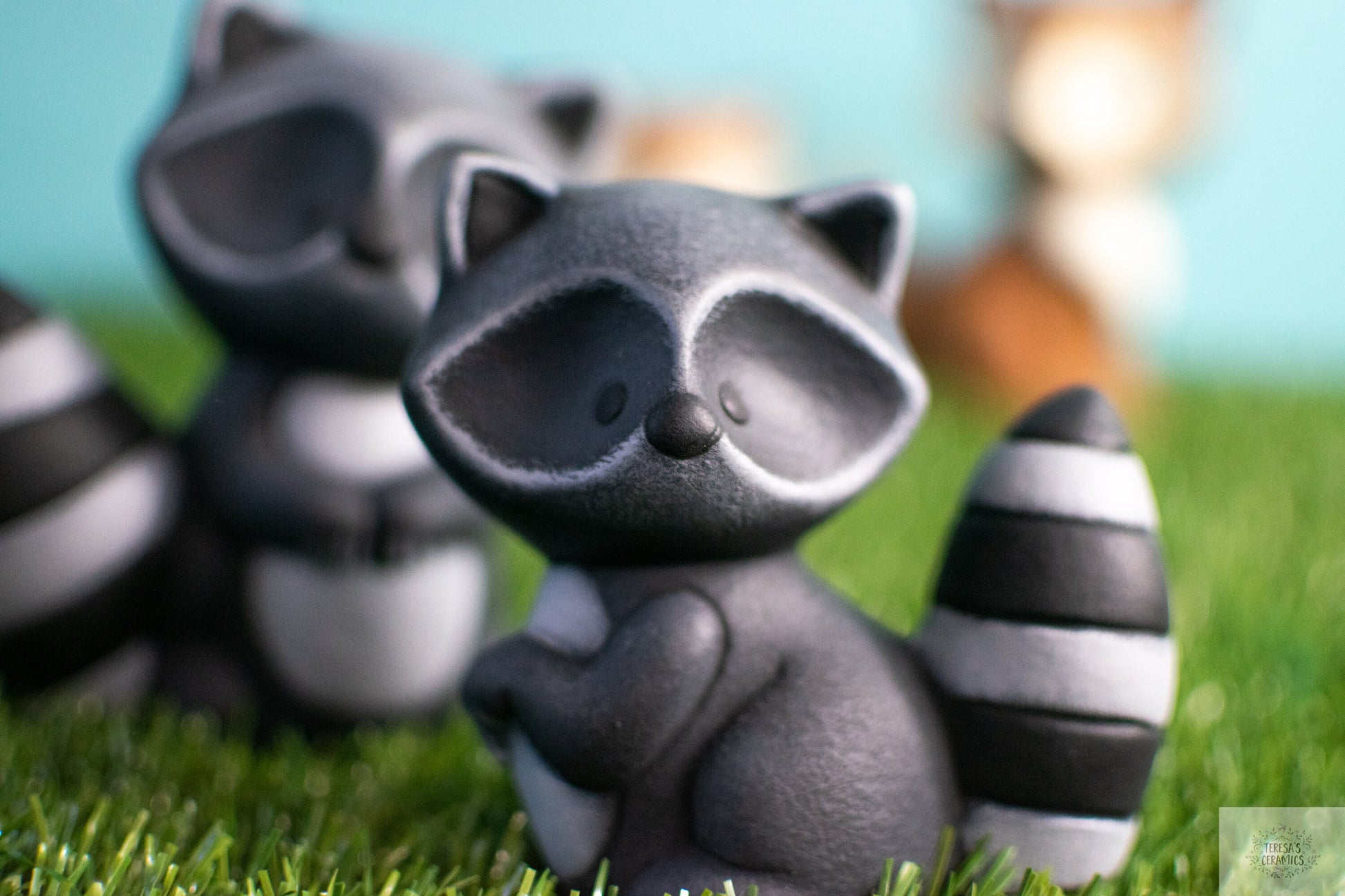 Each woodland critter is made in my ceramic studio using the slip-casting method. Every piece takes form using ceramic moulds. Once the piece is solid, it is removed as greenware. Every dried greenware is cleaned and fired in the kiln. Once the kiln has cooled for half of a day, they are removed and cleaned again. The coon then gets layers of acrylic paint, beginning with a base coat and finishing using the dry-brushing technique. These raccoons are sealed with a clear varnish to protect them from losing their color.