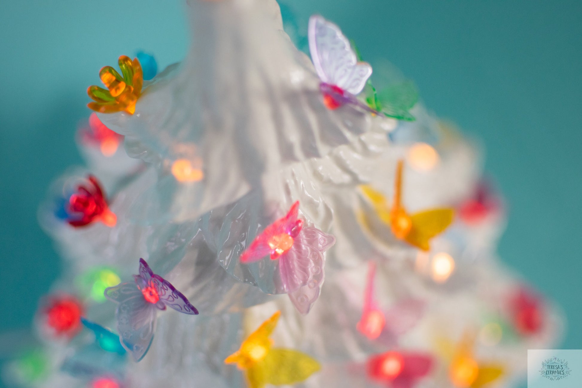 Handmade with a vintage mold, each tree is created using the slip casting method. Once casted, it is cleaned and fired in the kiln. Each tree must cool most of the day once it is fired. After cooling it is removed from the tree, cleaned once more and glazed three coats of white glaze. The glaze is dried and fired in the kiln once more. The last firing is done and the tree can be removed to decorate with butterfly bulbs!