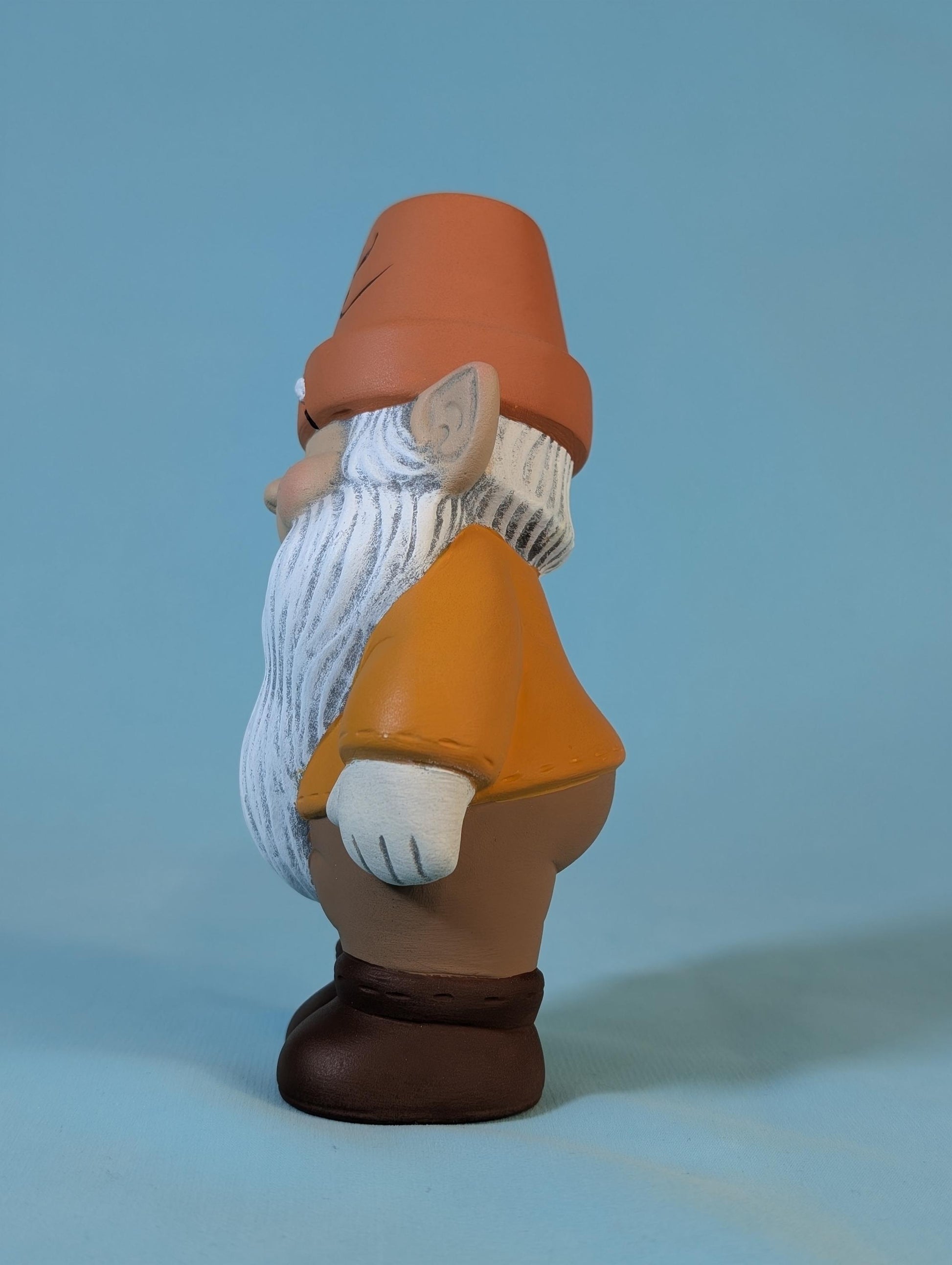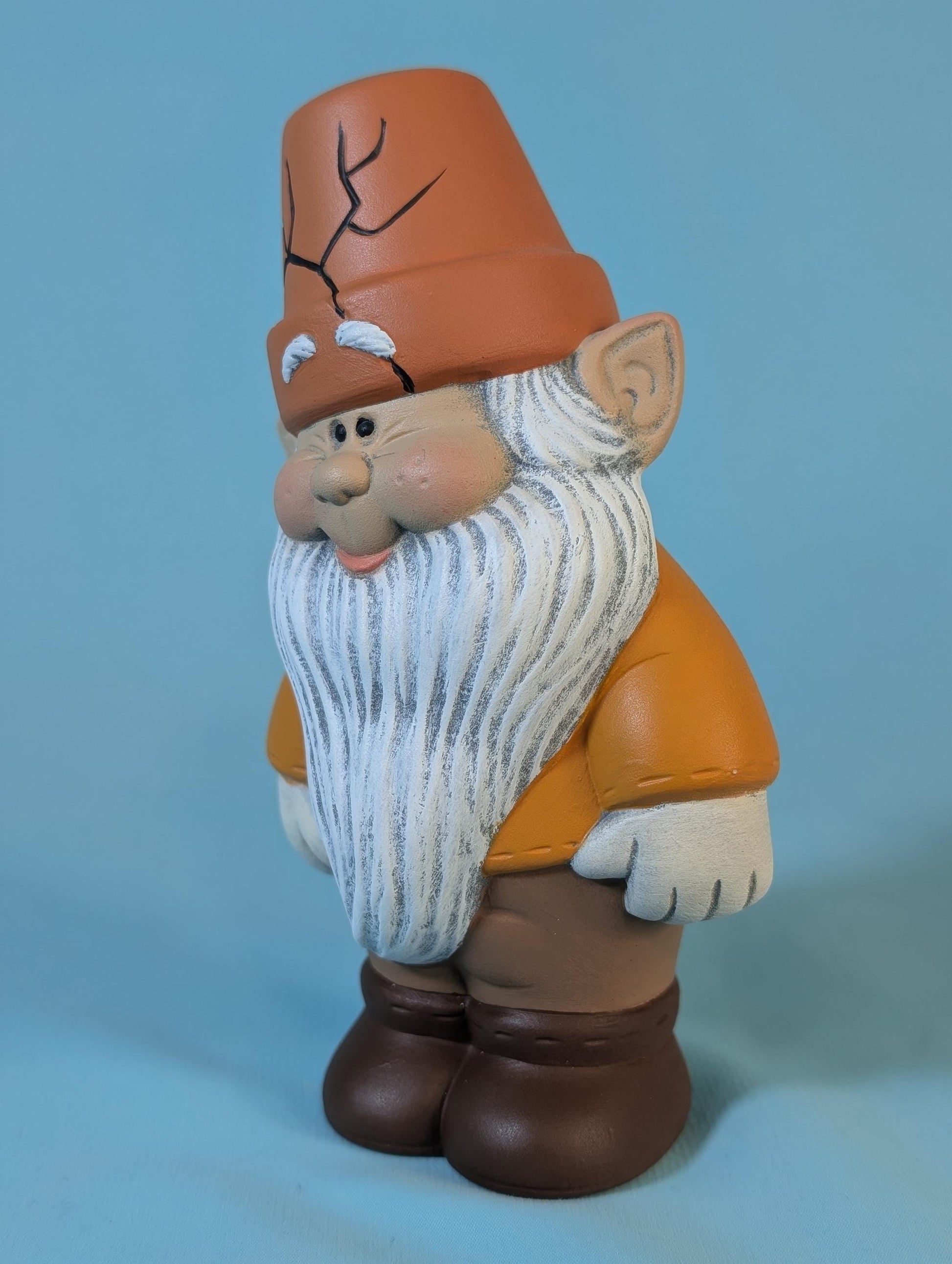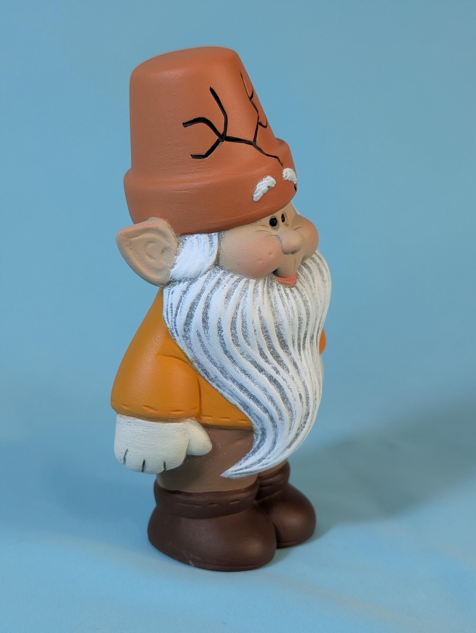 This gnome was slip cast in my studio and then after being cleaned up and completely dried, he was fired up in the kiln and then painted using acrylic paints and then finally sealed to protect him so that he can stay outside during all but the harshest weather.