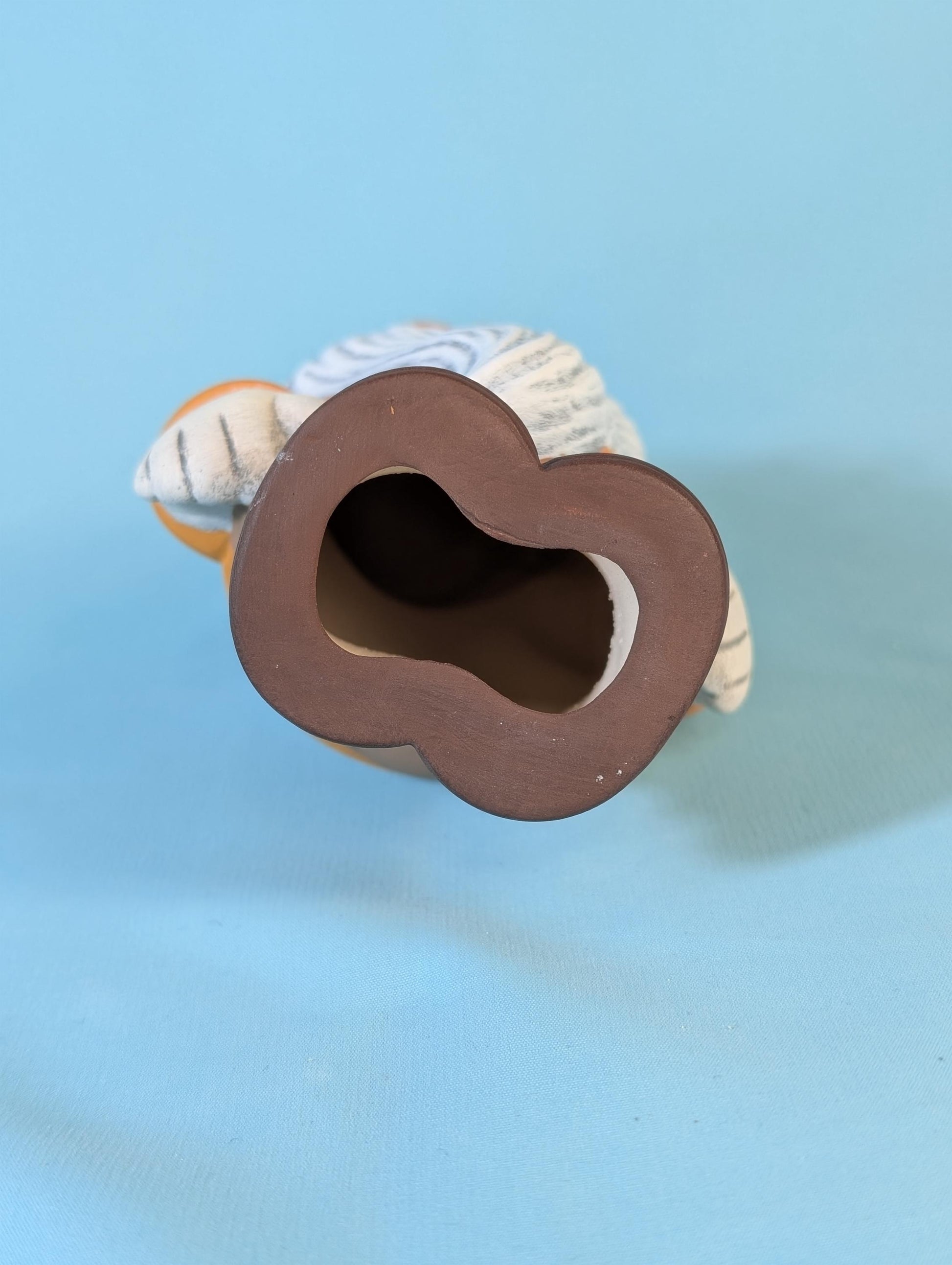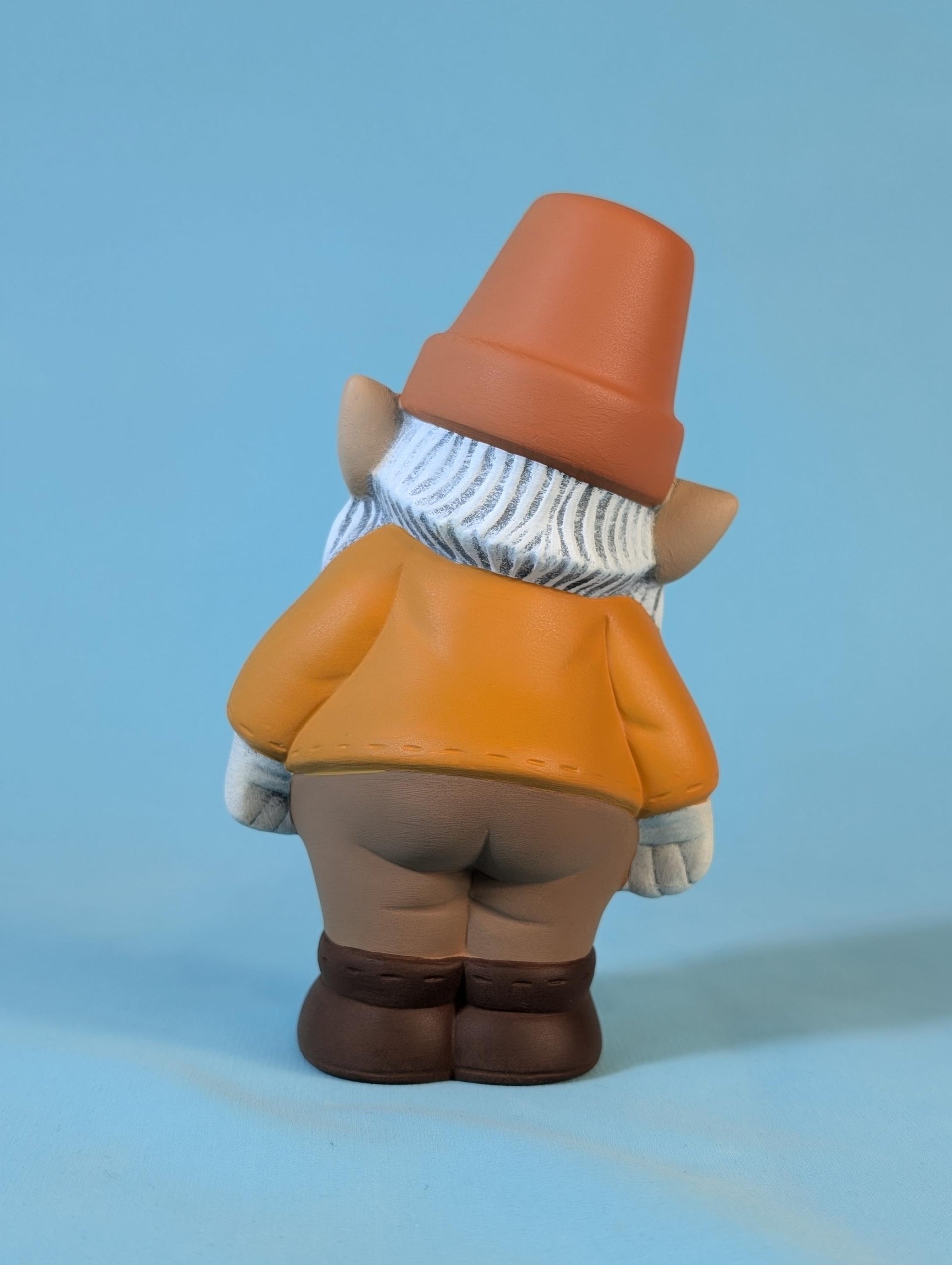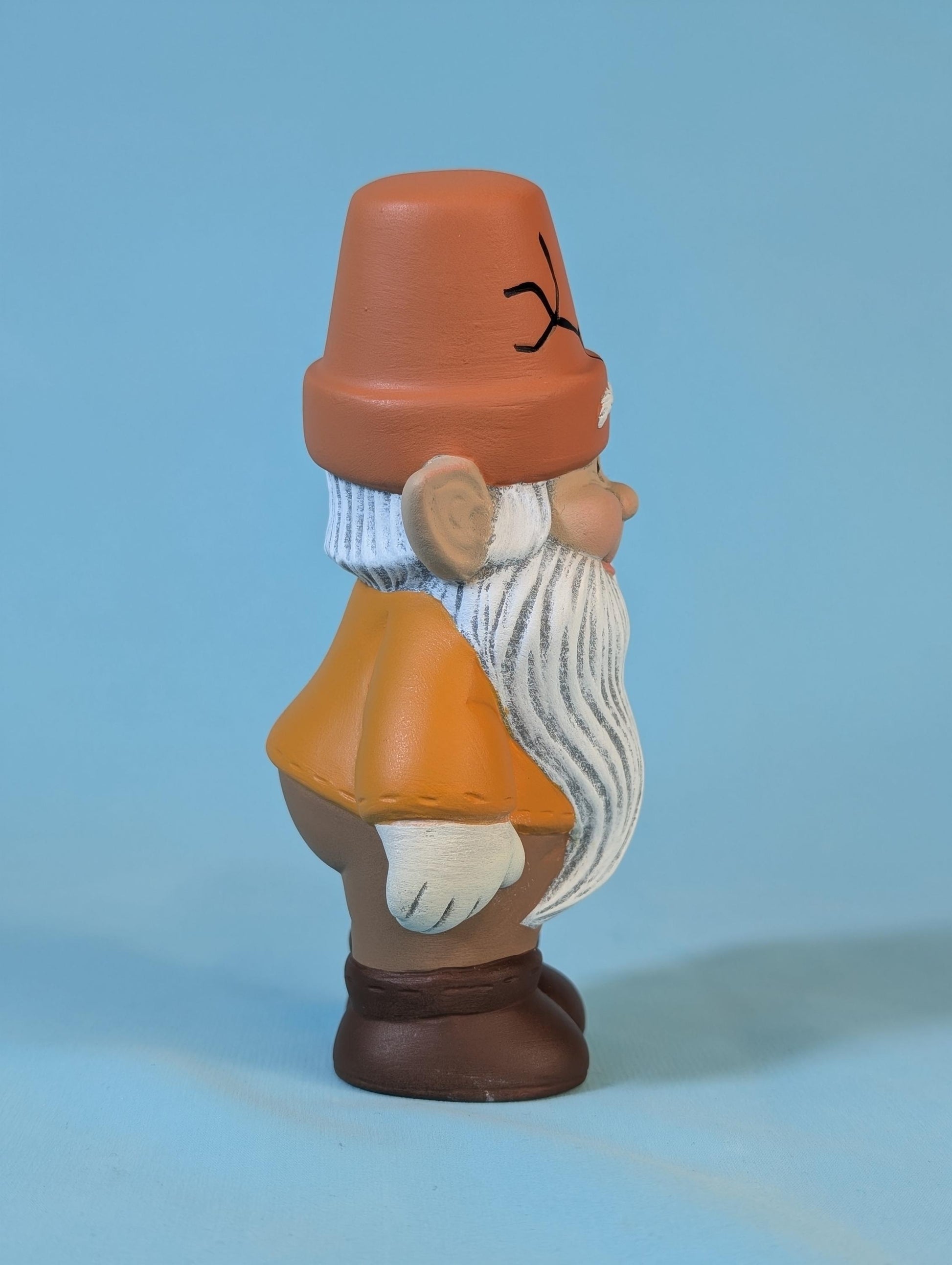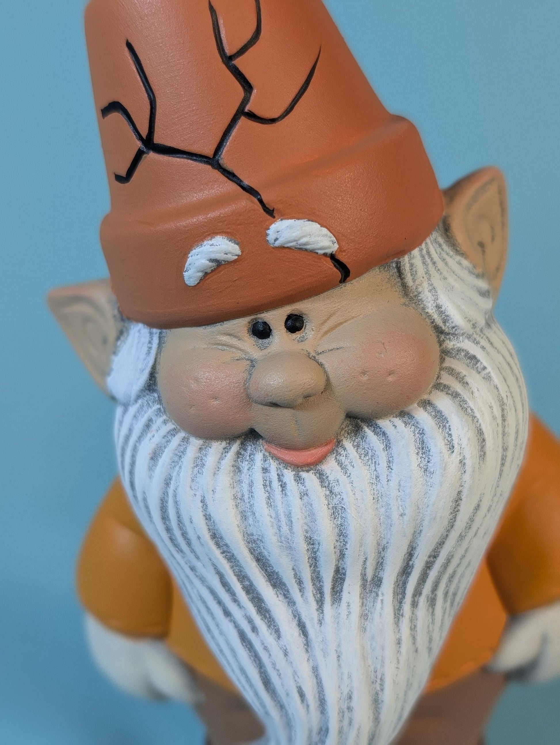 This gnome was slip cast in my studio and then after being cleaned up and completely dried, he was fired up in the kiln and then painted using acrylic paints and then finally sealed to protect him so that he can stay outside during all but the harshest weather.