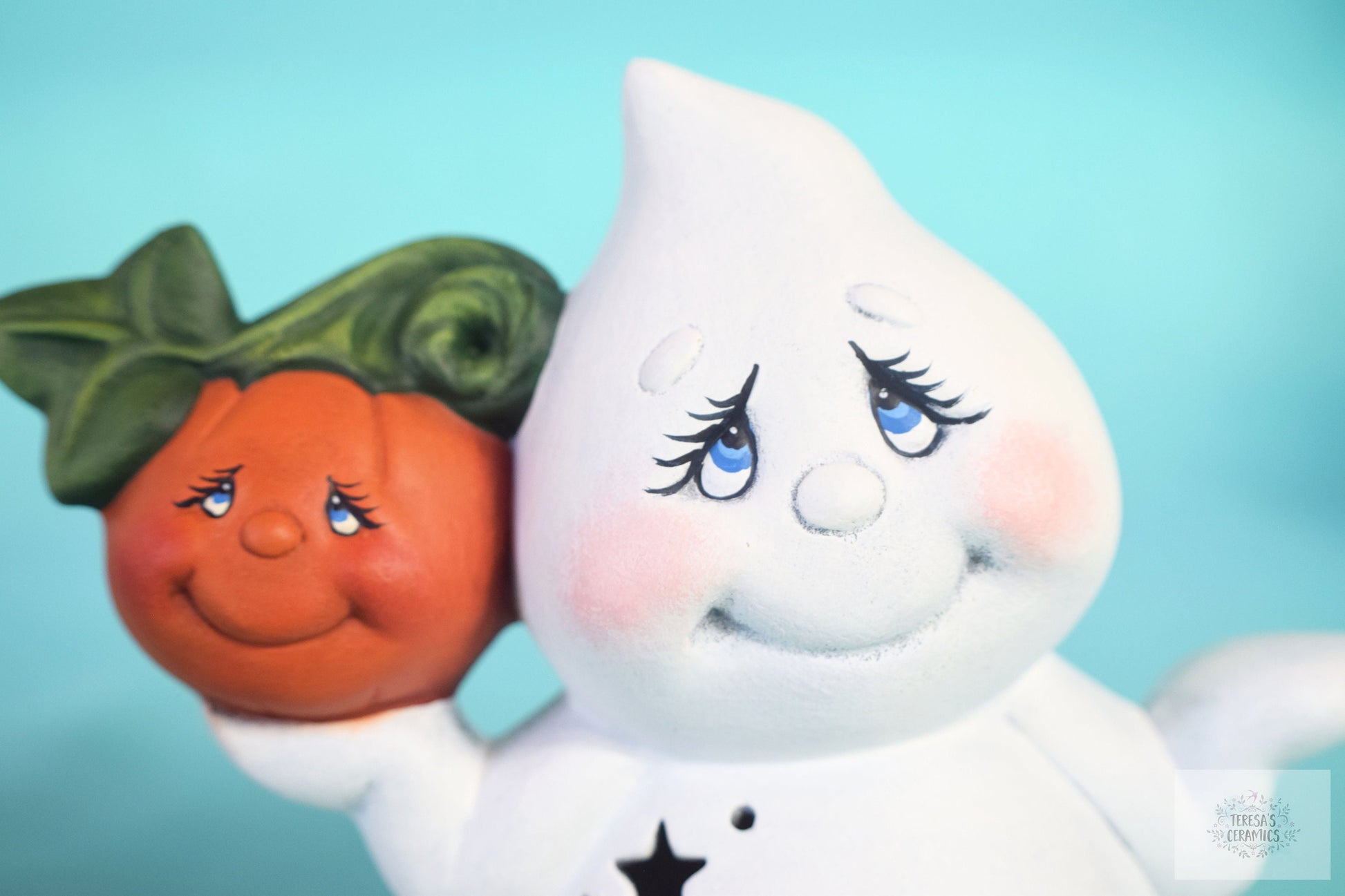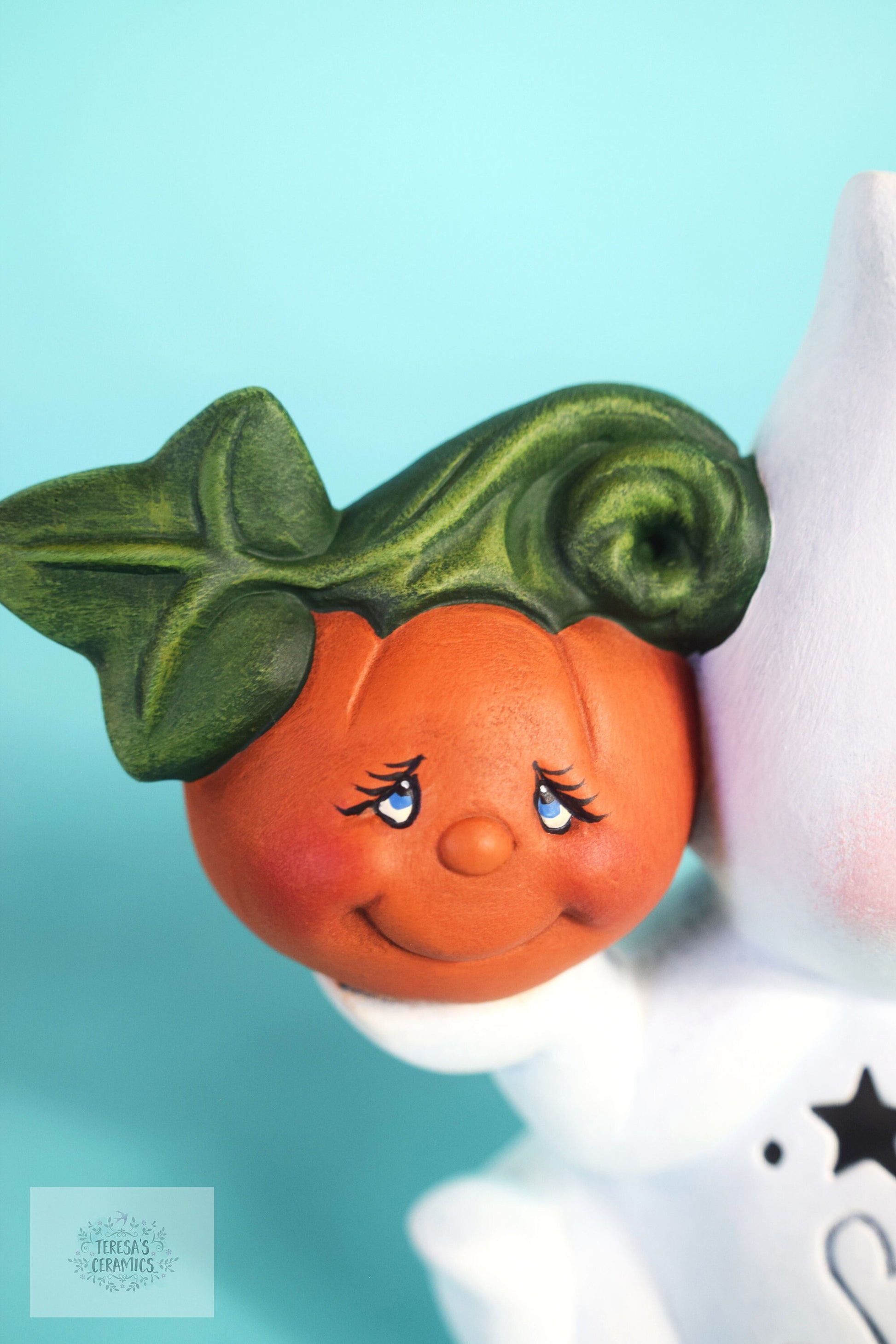 This cutie is then placed in the kiln and fired, turned to bisque and lastly hand painted ghost-white! Little pumpkin friend is painted a gorgeous orange and green.