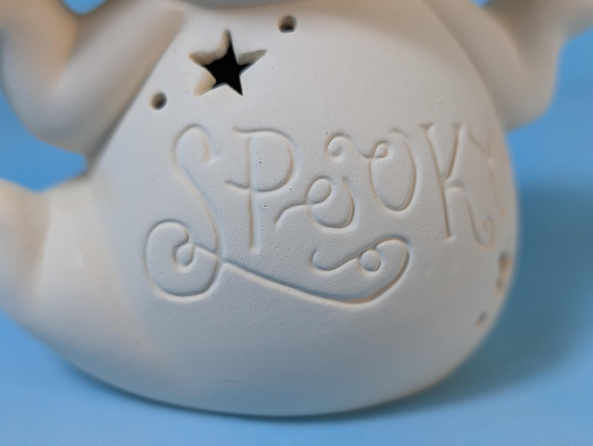 This ghost is handmade in my home studio, slip cast in a ceramic mold using premium ceramic slip. Once the ceramic has set, it is pulled from the mold and set to dry/clean. Each star is hand carved and the letters are hand stenciled in.