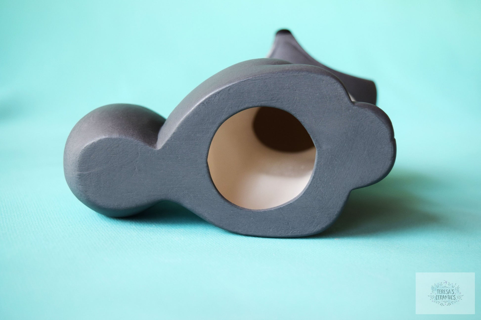 He was slip cast in my ceramic studio, fired in the kiln and then painted in nice modern colors.