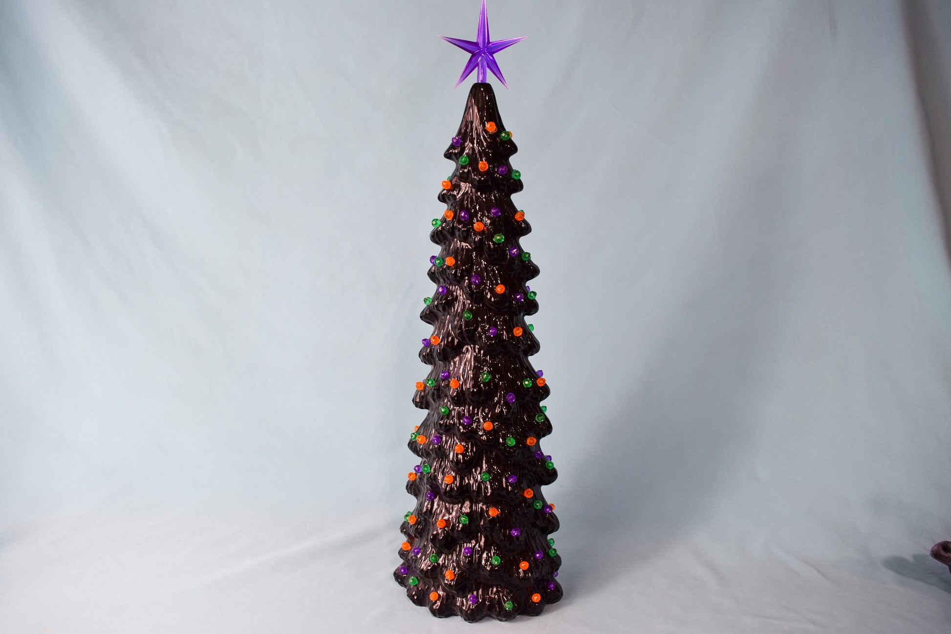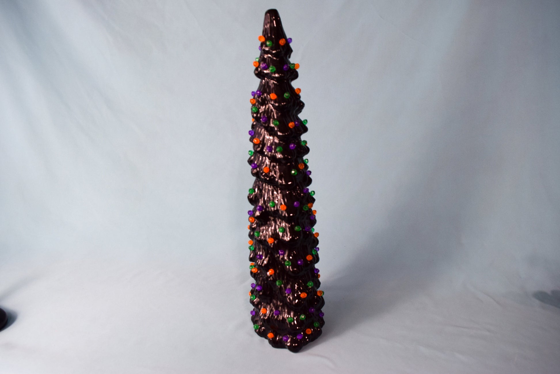 A black glazed tree with green, orange and purple lights. Simply spooky!
