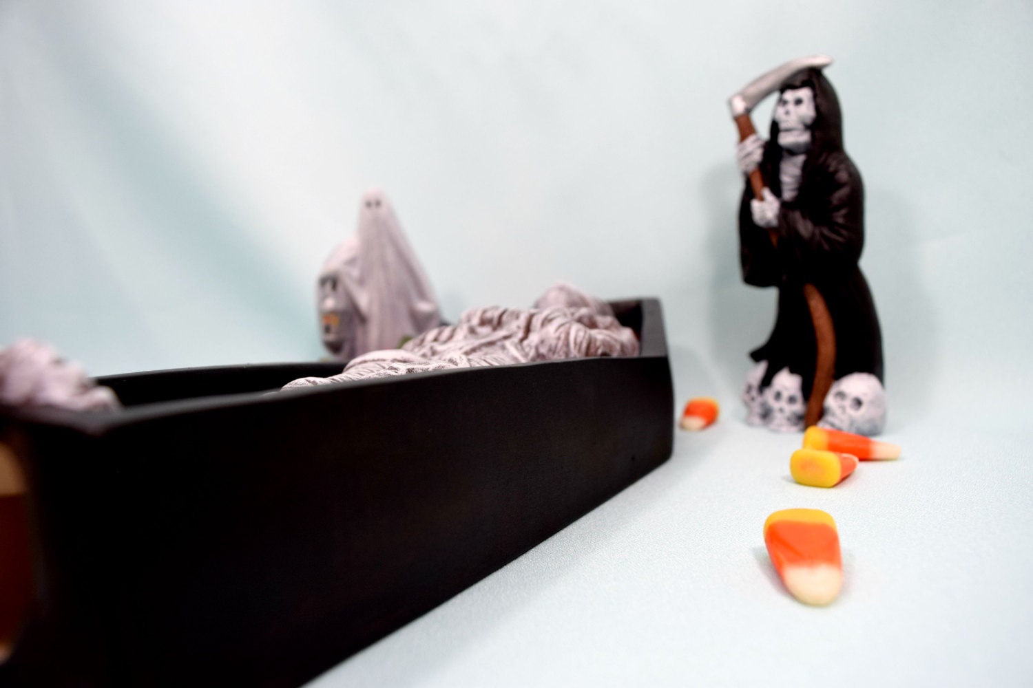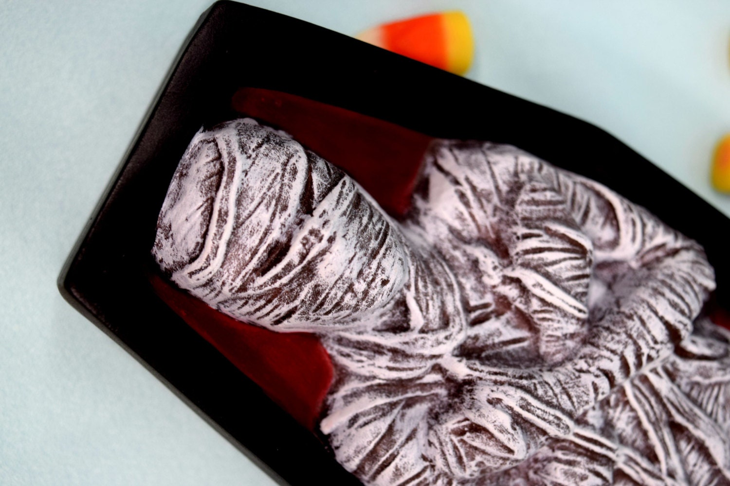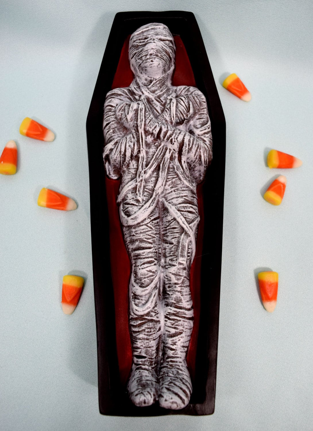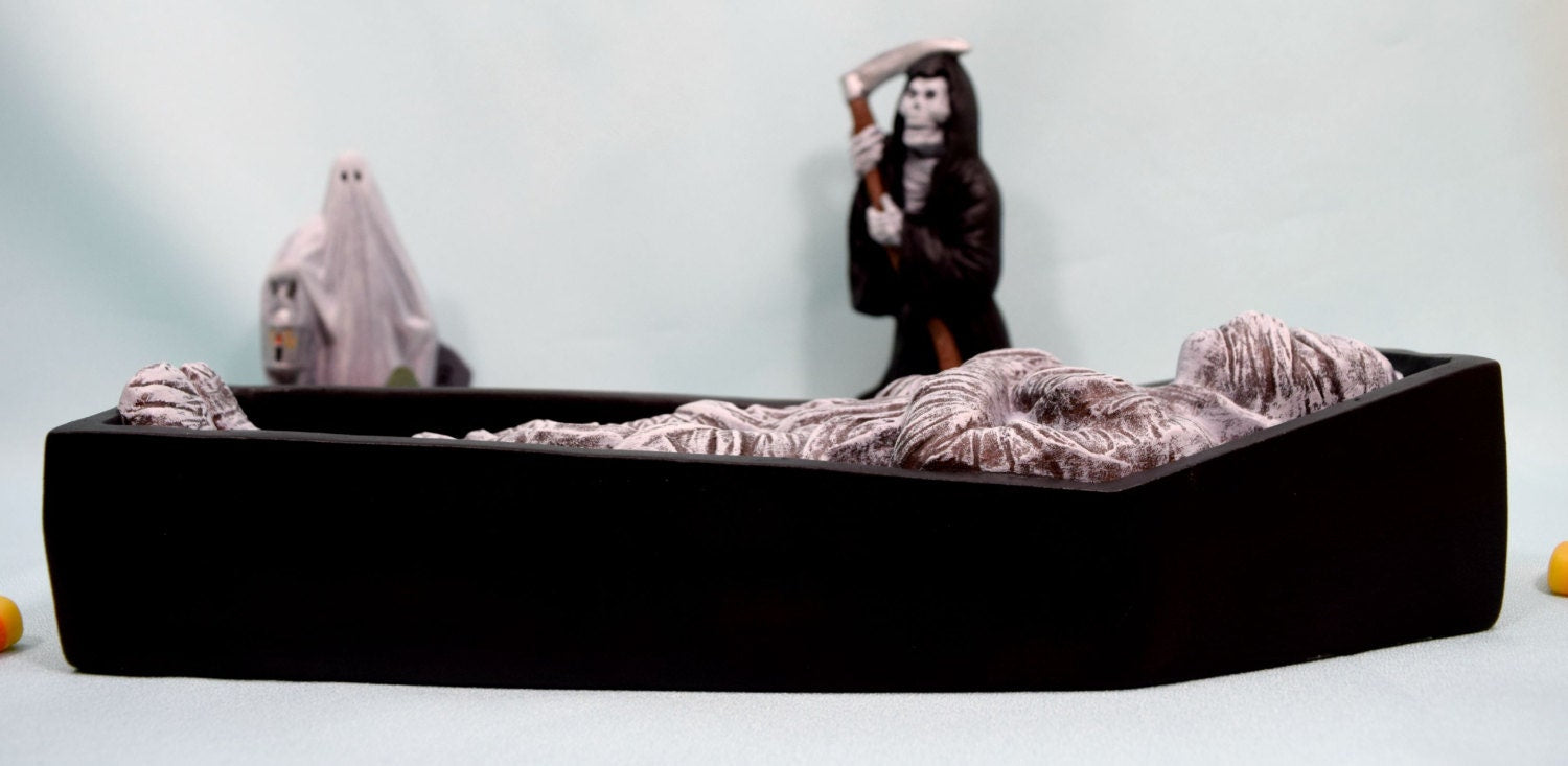 Length: 10 inches from base of coffin to above the Mummy's head