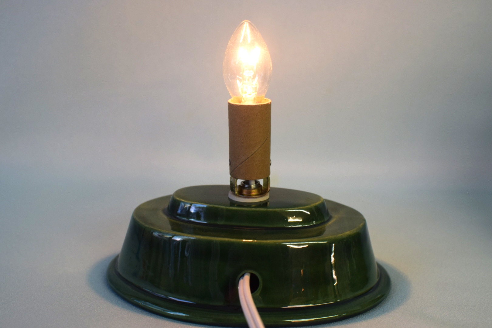 Each tree comes finished in a classic evergreen glaze, hand-glued multi color pin lights and a light bulb that lights via a two-prong plug.