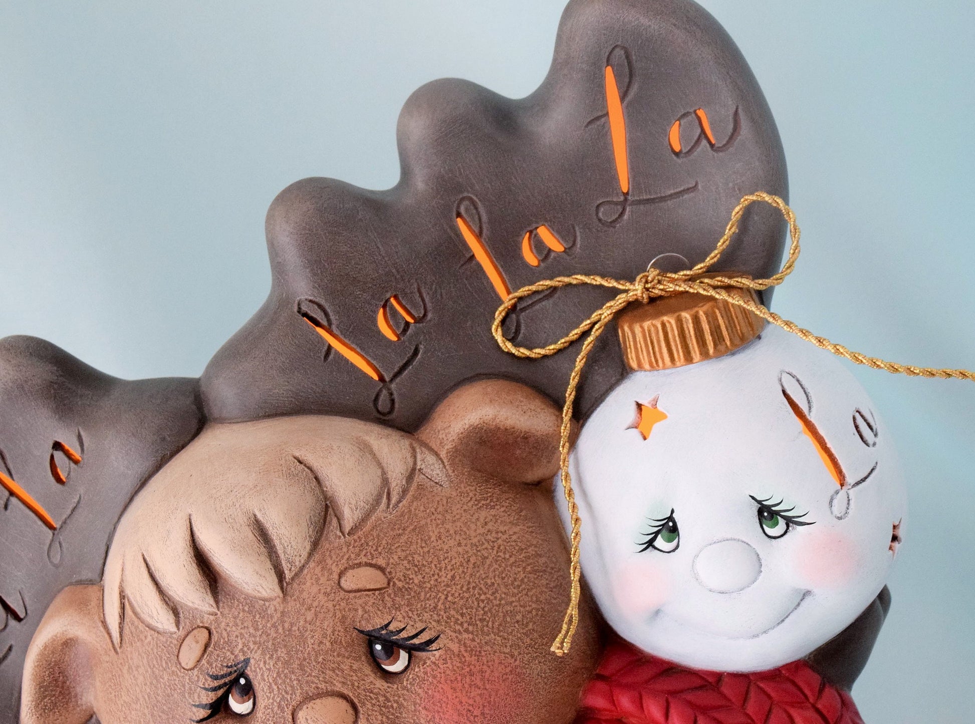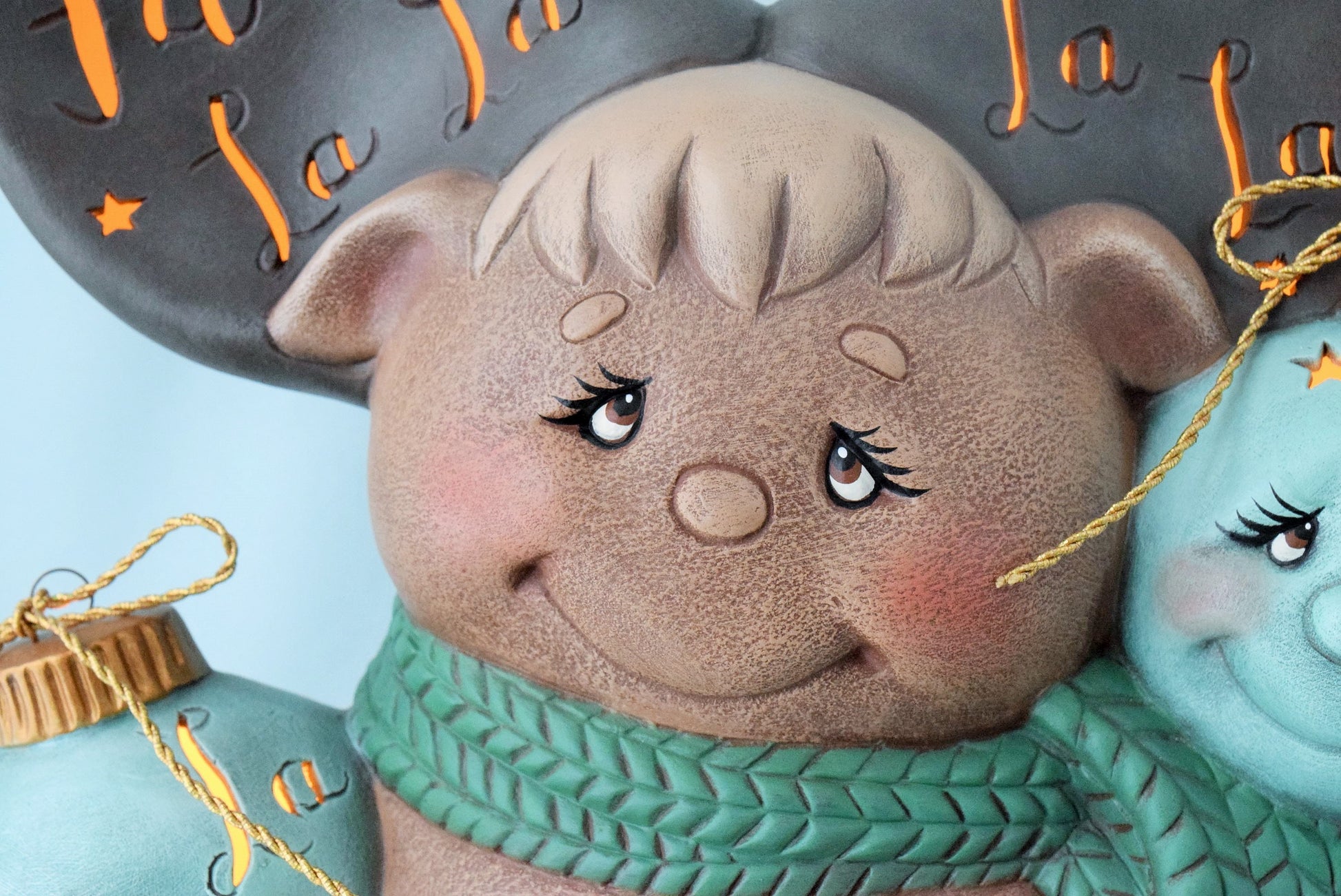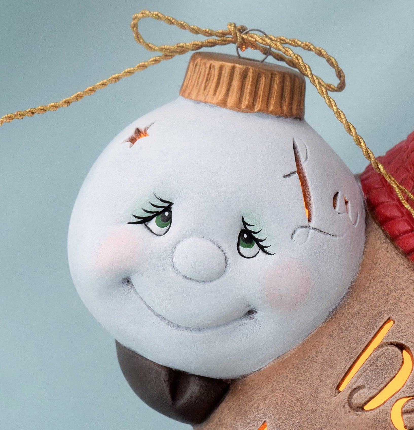 He's all bundled up toasty and warm, with a glow shining through the saying carved in his tummy and antlers.