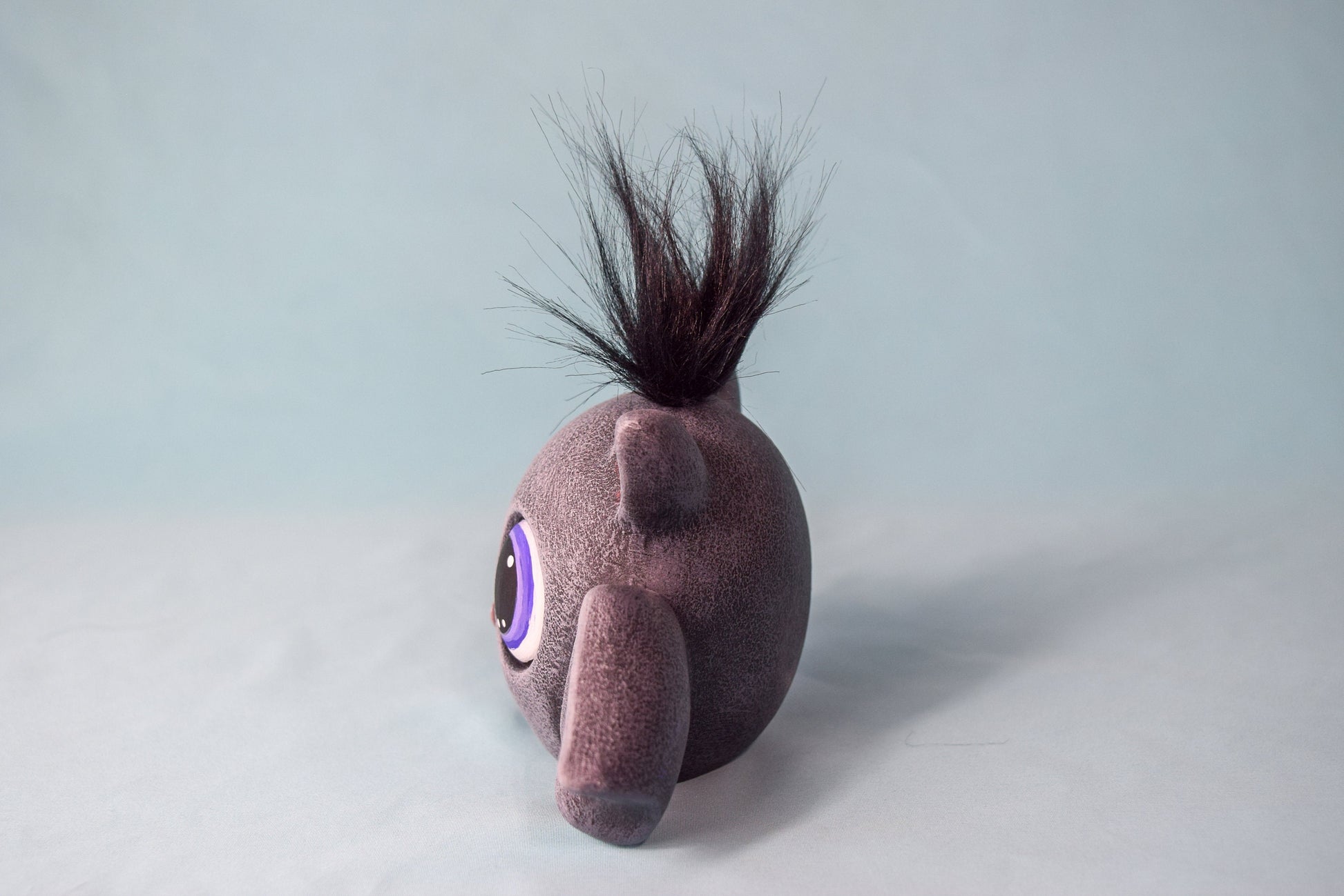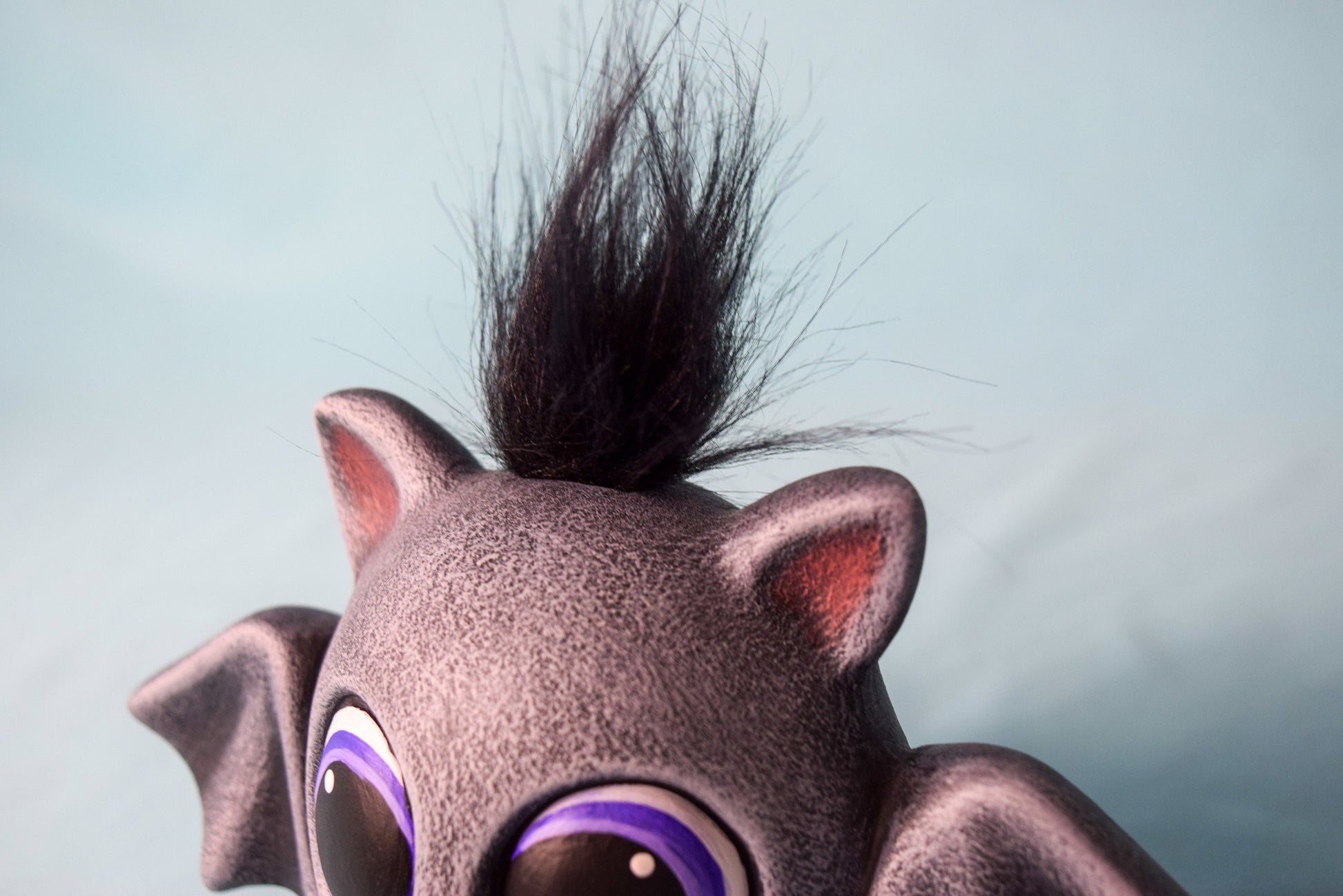 This cute little Halloween treasure has hair! And he's so funky! He really does have an unassuming sassy attitude. This is the medium size of this bat and he will fit in with any of your Halloween decor and get people talking! He really is a darling, and he's going to make you happy!