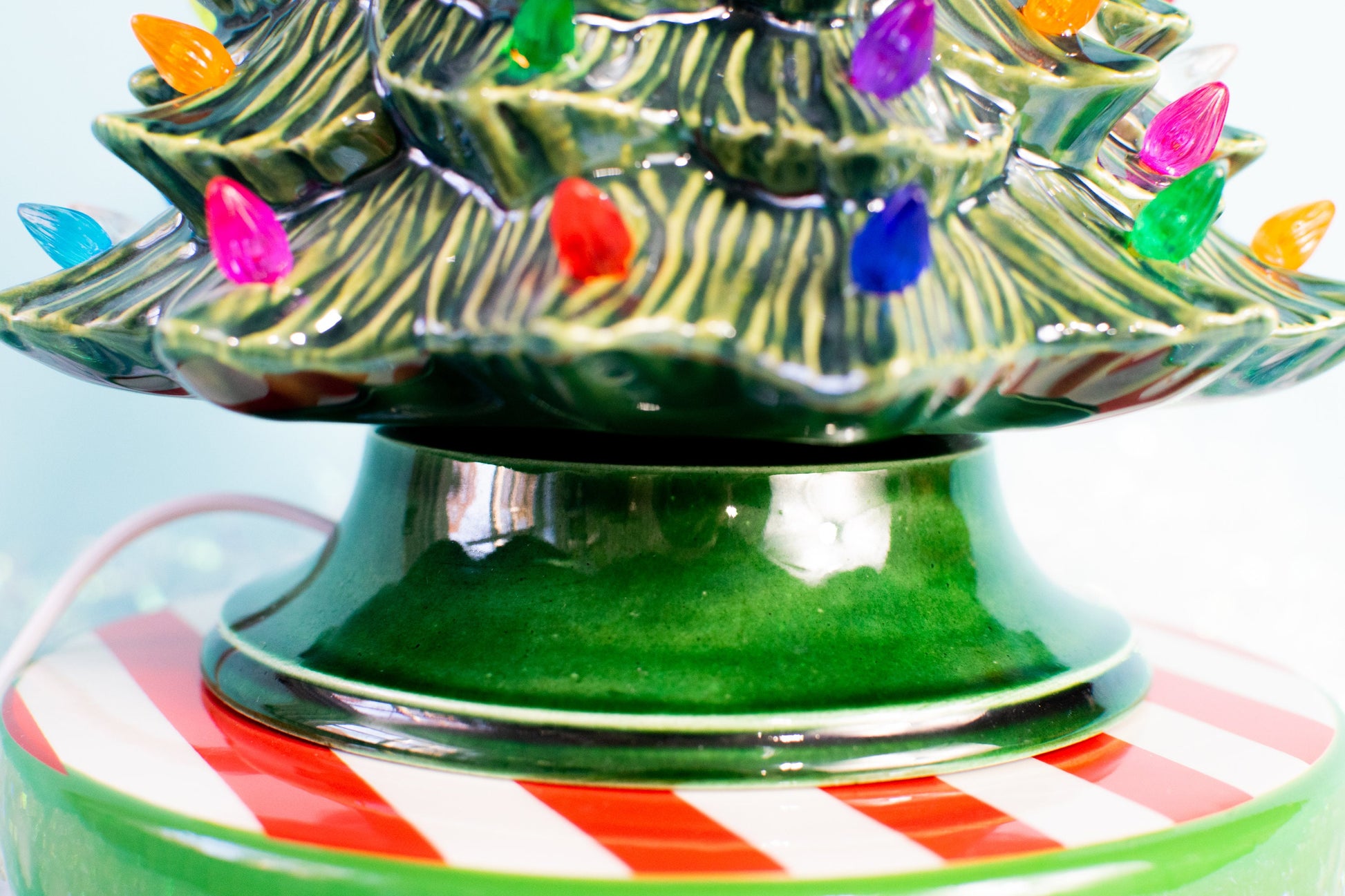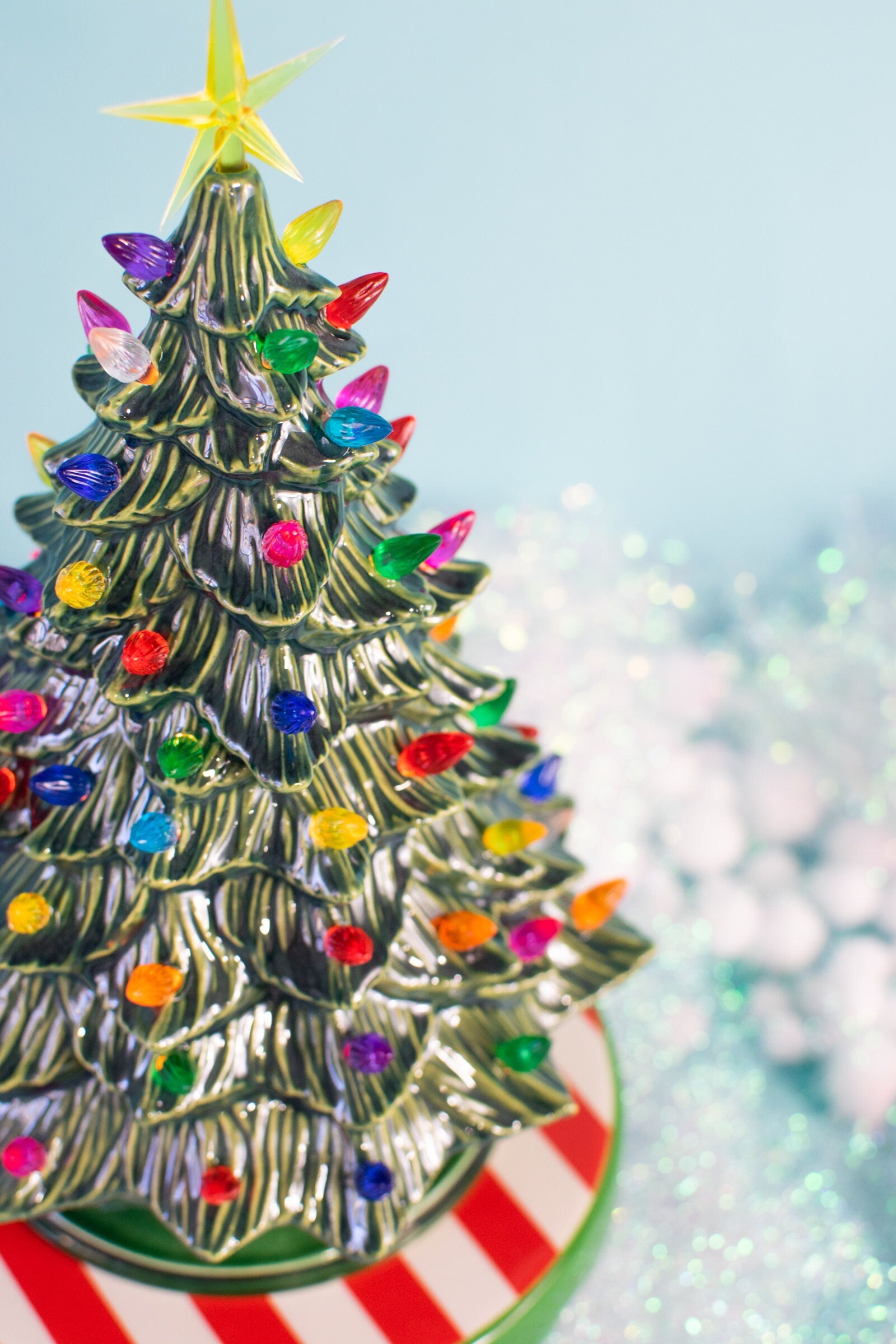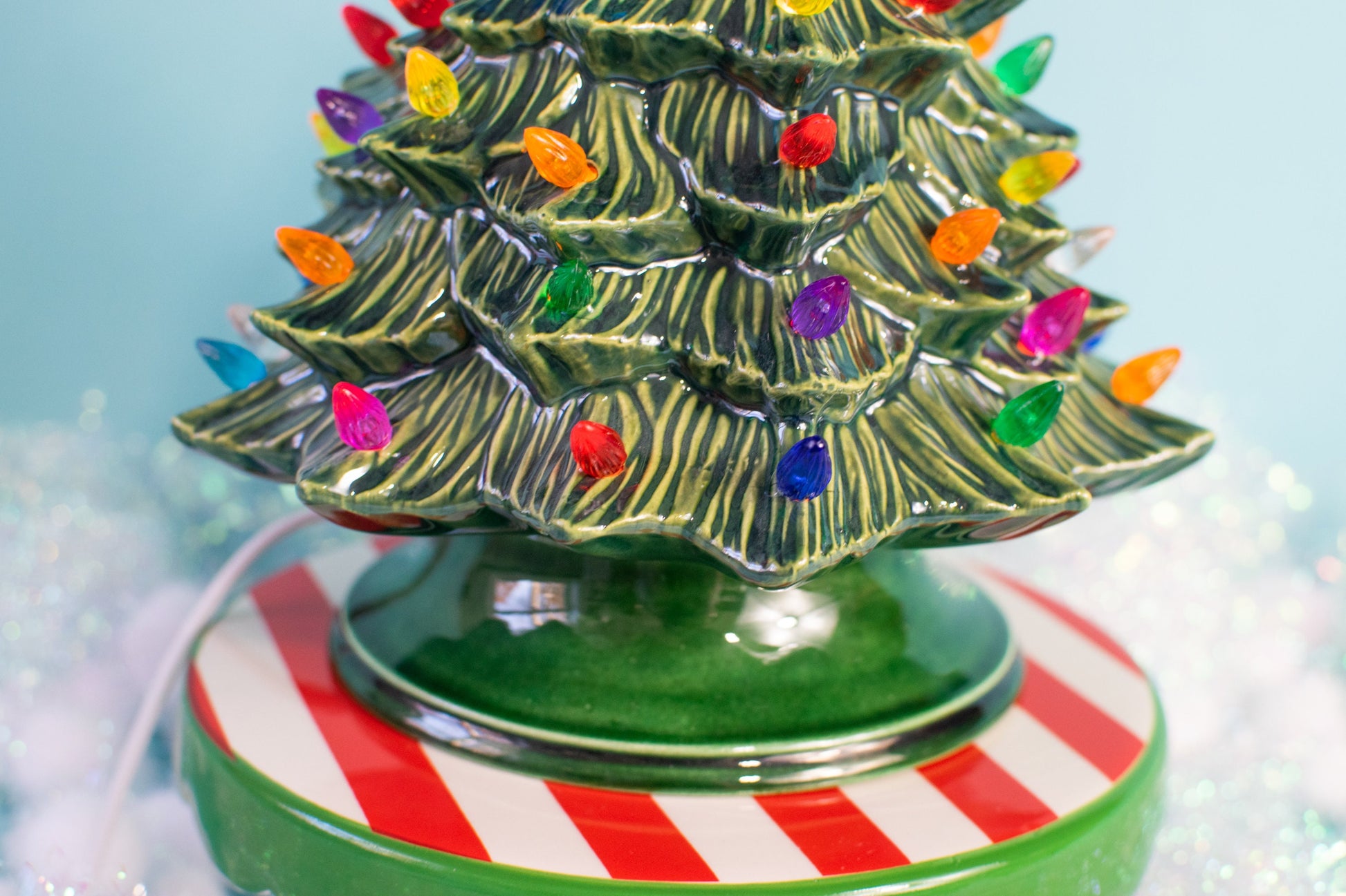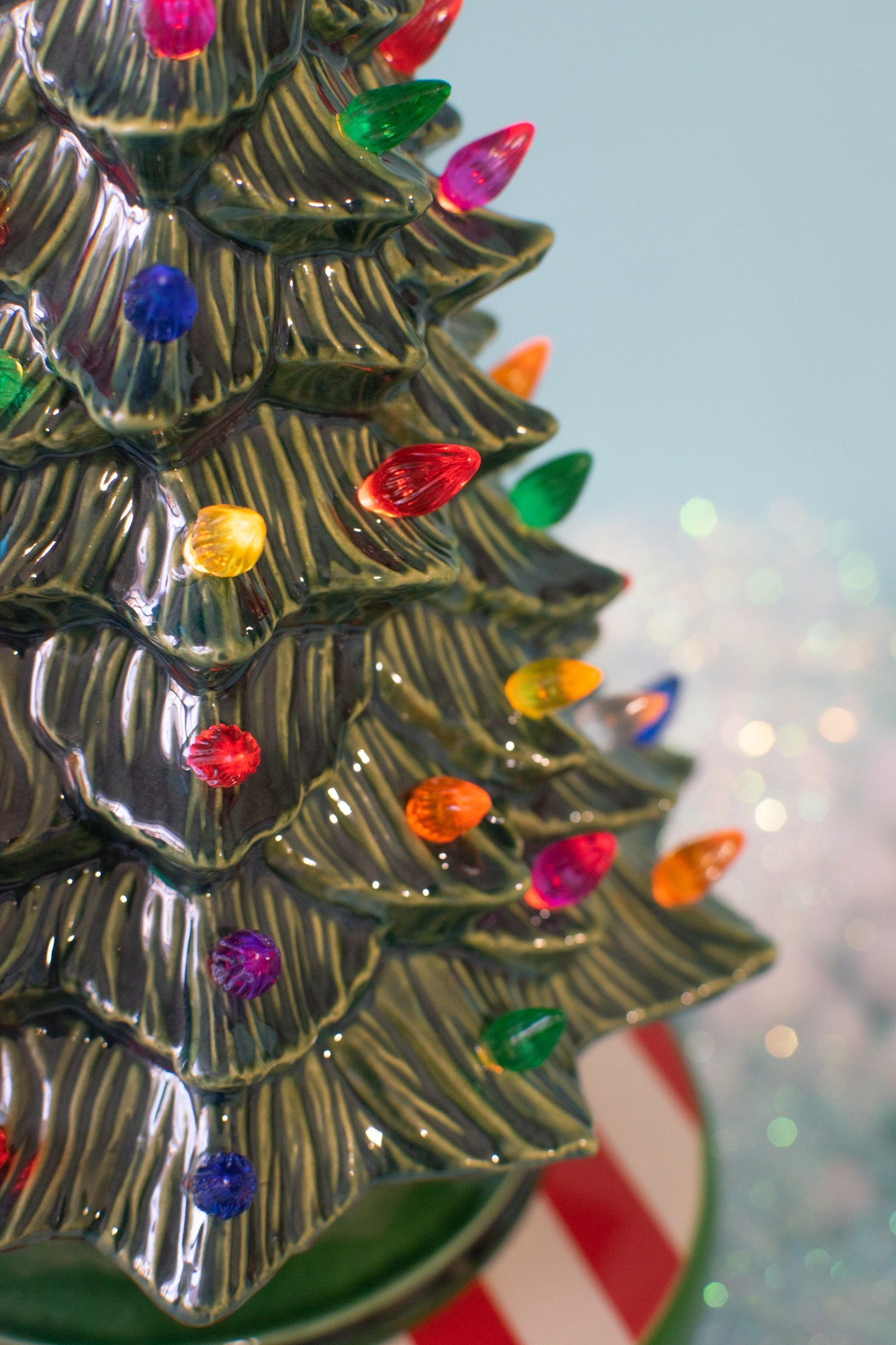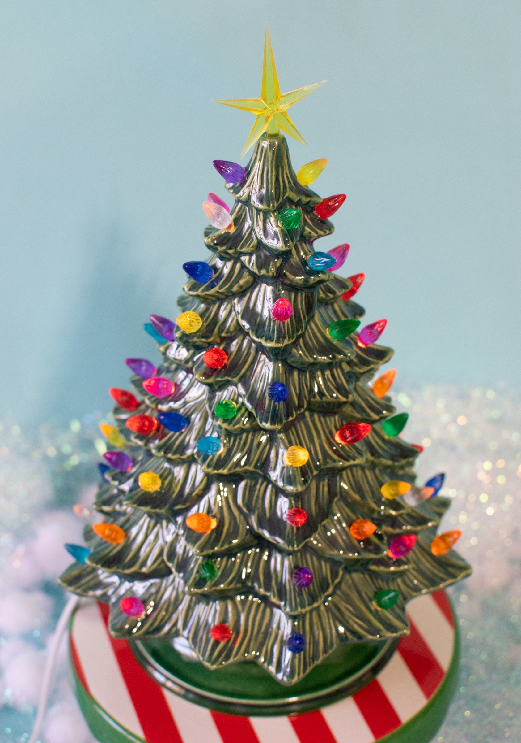 A retro American tree! Glazed a beautiful, deep green and decorated with multicolored twist lights. Classic Christmas tree is ready to light!