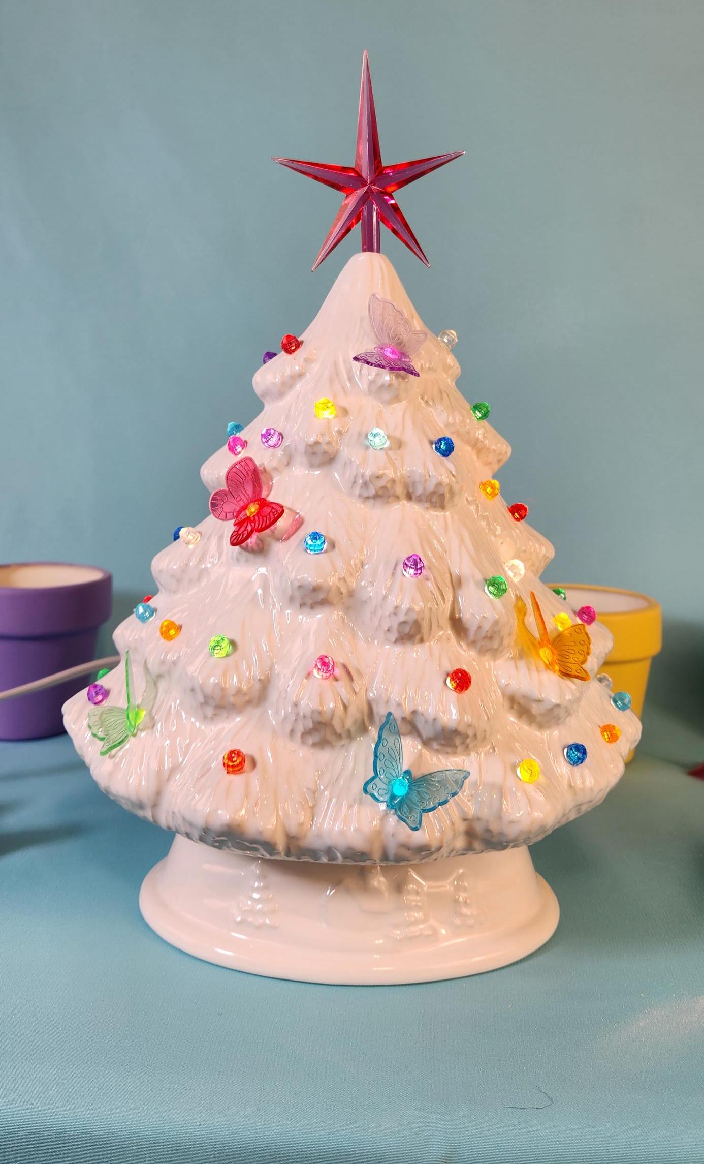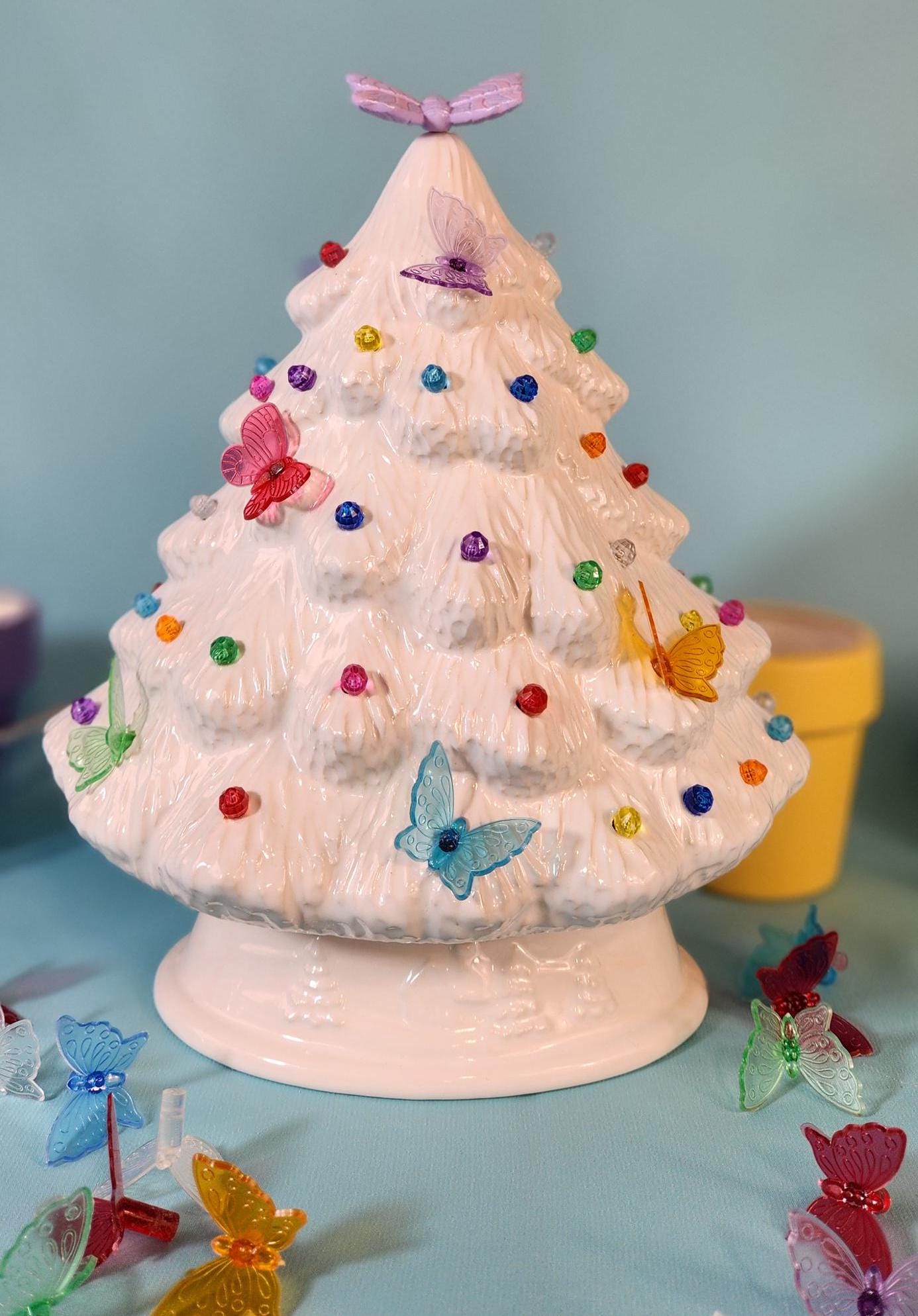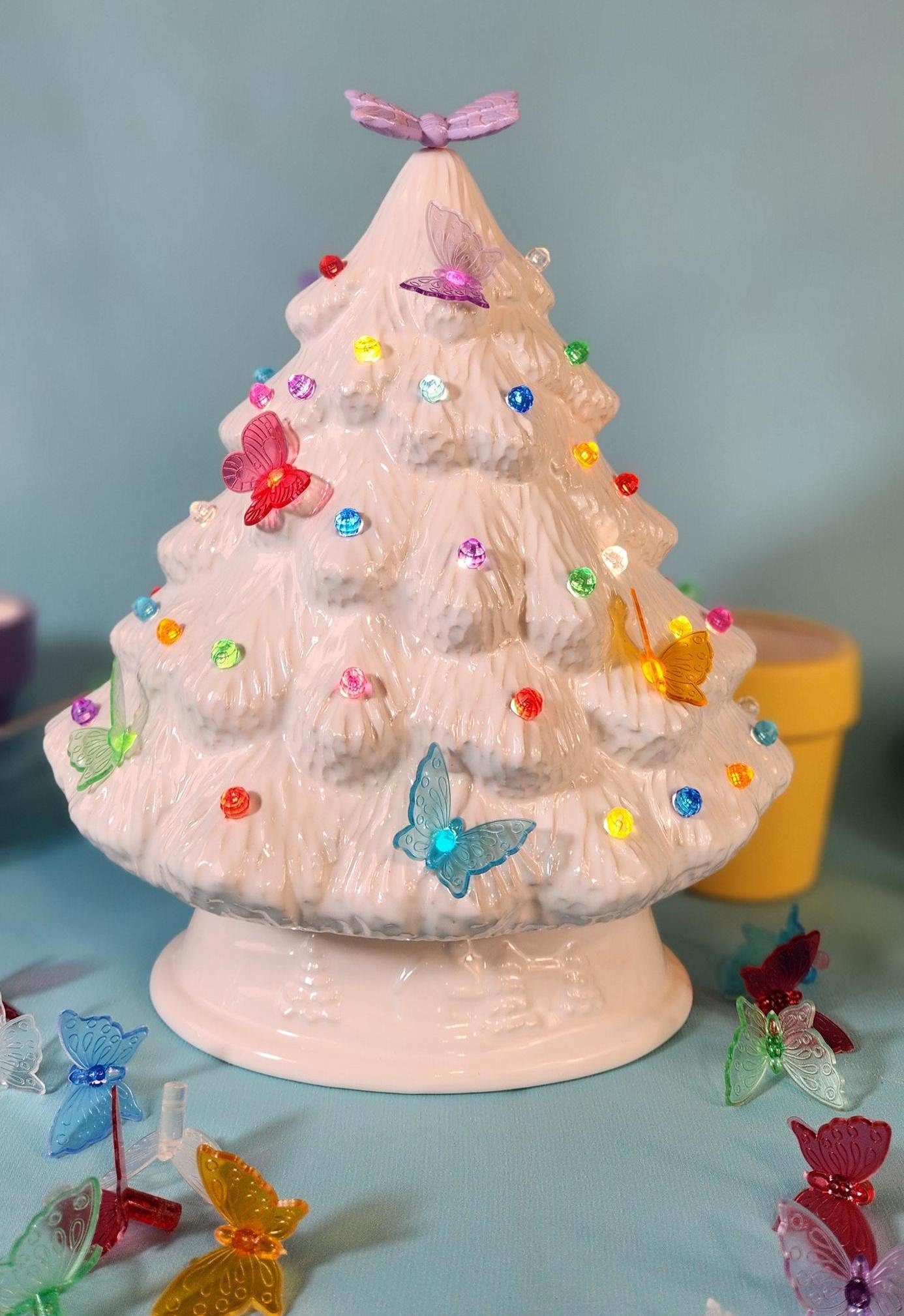 This whimsical butterfly tree is the perfect marker for the entrance of Spring! This is our popular mantle style tree glazed in white with multicolored pin lights and garnish with brilliant bright butterfly lights. And it's topped with either a pearlescent pink star or pastel ceramic butterfly. A wonderful center piece for the spring time, in the garden, or part of an elaborate diorama.