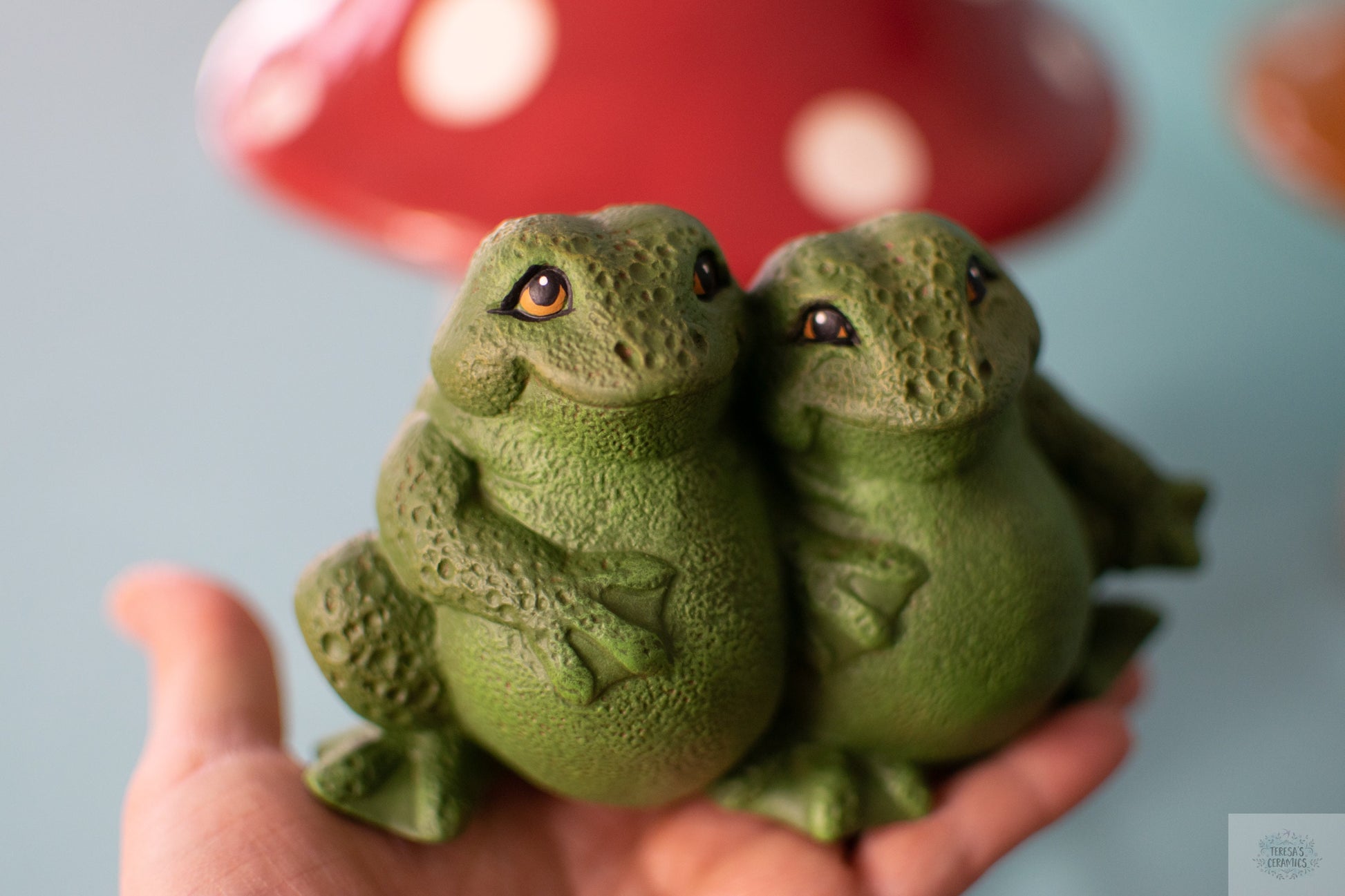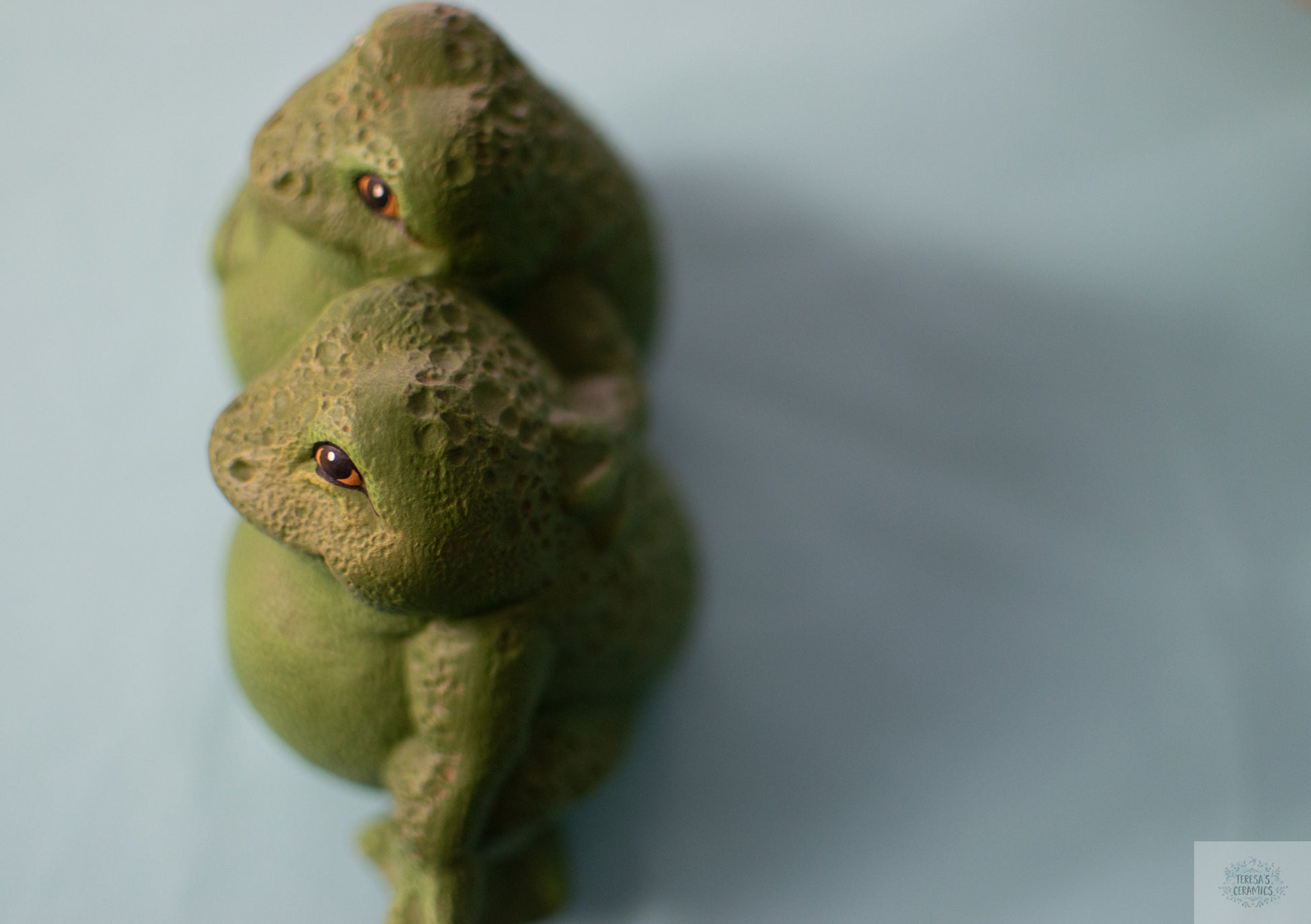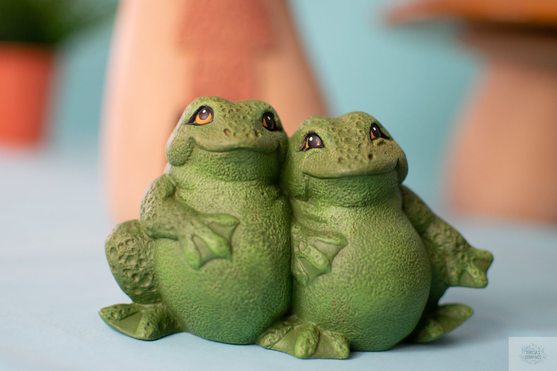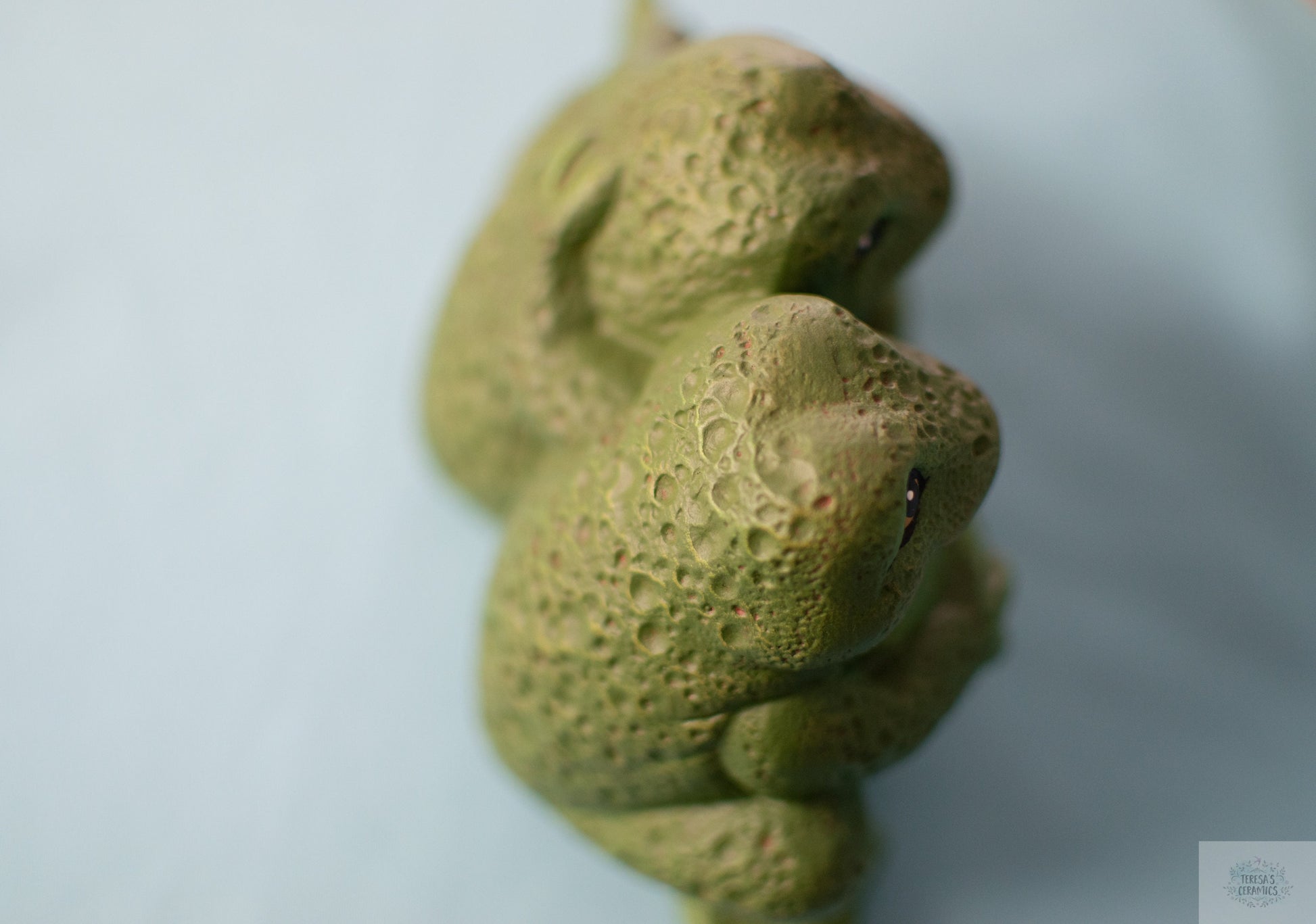 Each frog is made in my ceramic studio. They are slip casted into a ceramic mold, cleaned, fired in the kiln and cleaned once more. At this stage the frogs are in bisque and ready to paint. They receive a base coat, dry brushed top coat and lastly the detailed face is set. Every ceramic piece is sealed with a clear varnish to protect the vibrant paint color!