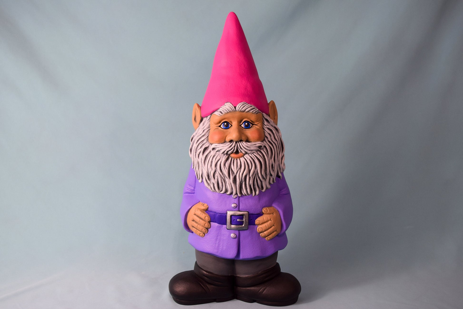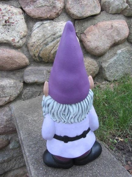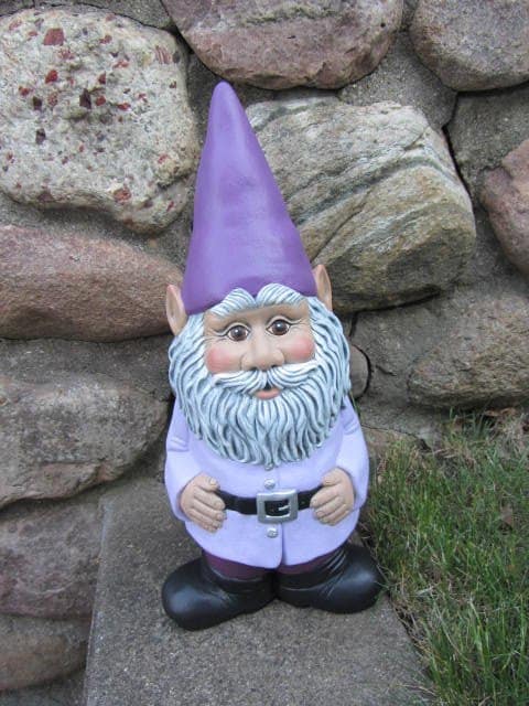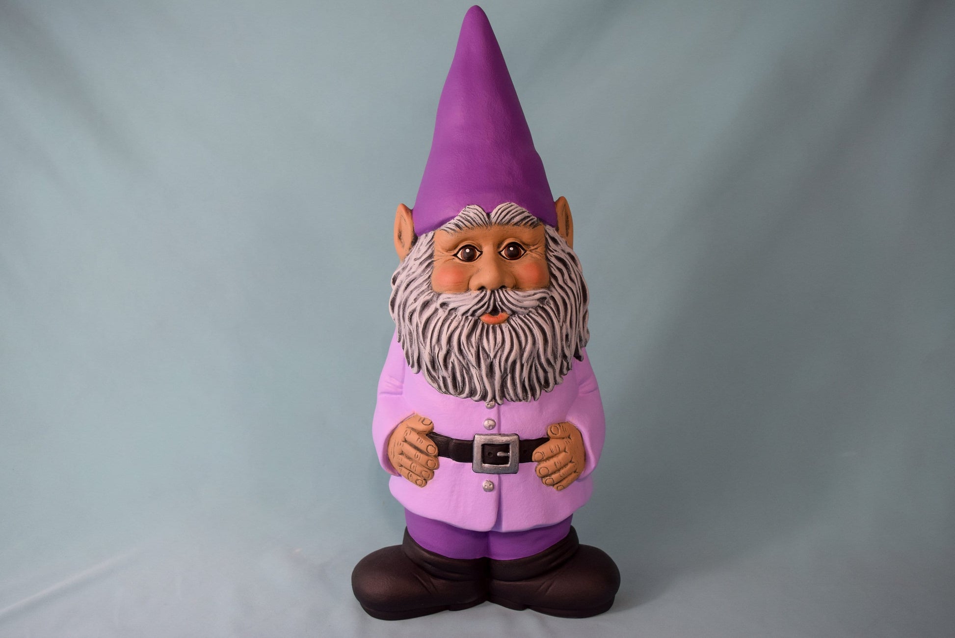 The gnome pictured is utterly charming in his bright purple hat and lighter violet jacket, complemented by a magnificent white beard and warm brown eyes. He'll be delighted to welcome all your guests with his cheerful presence!