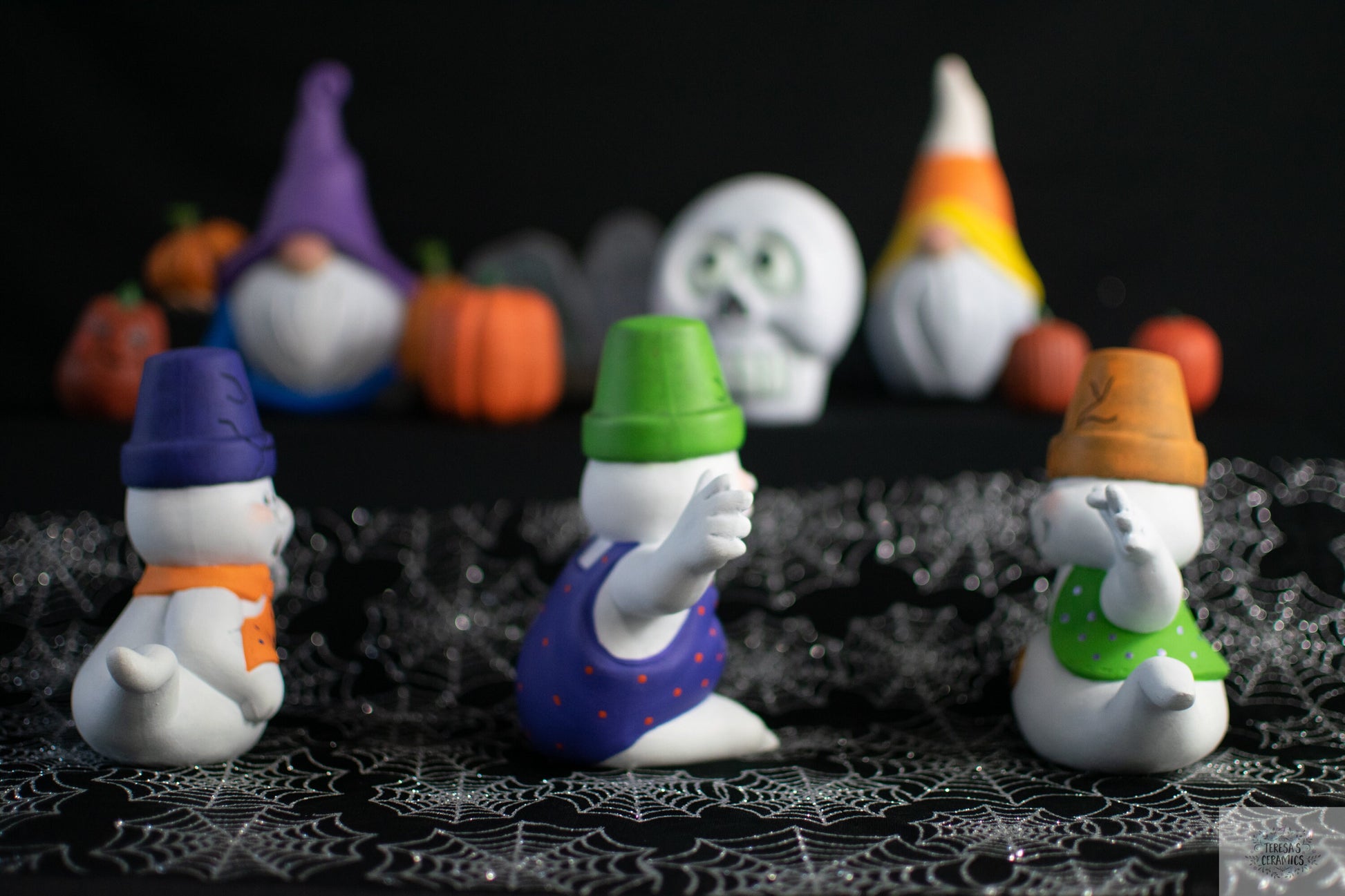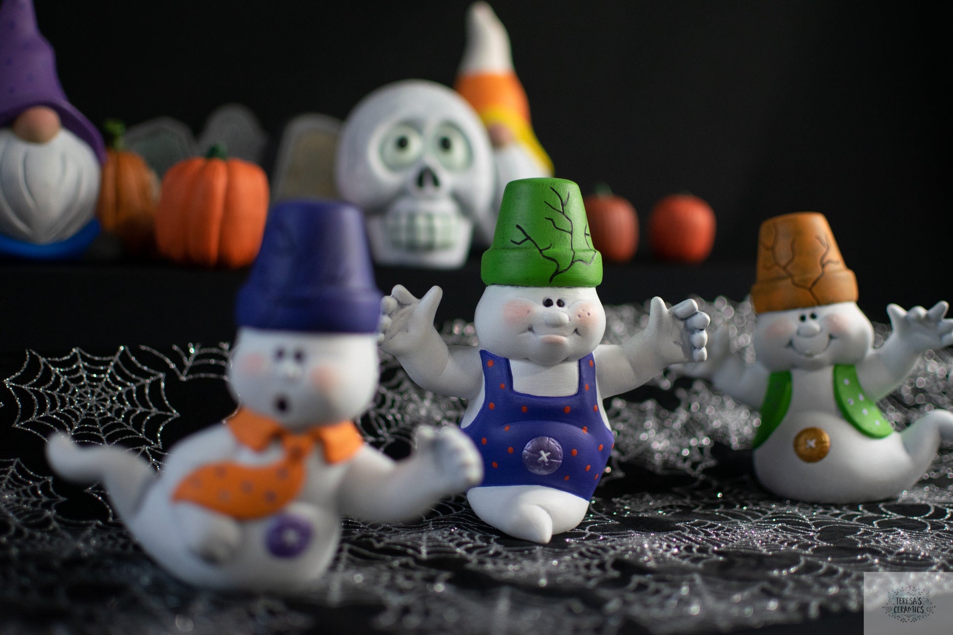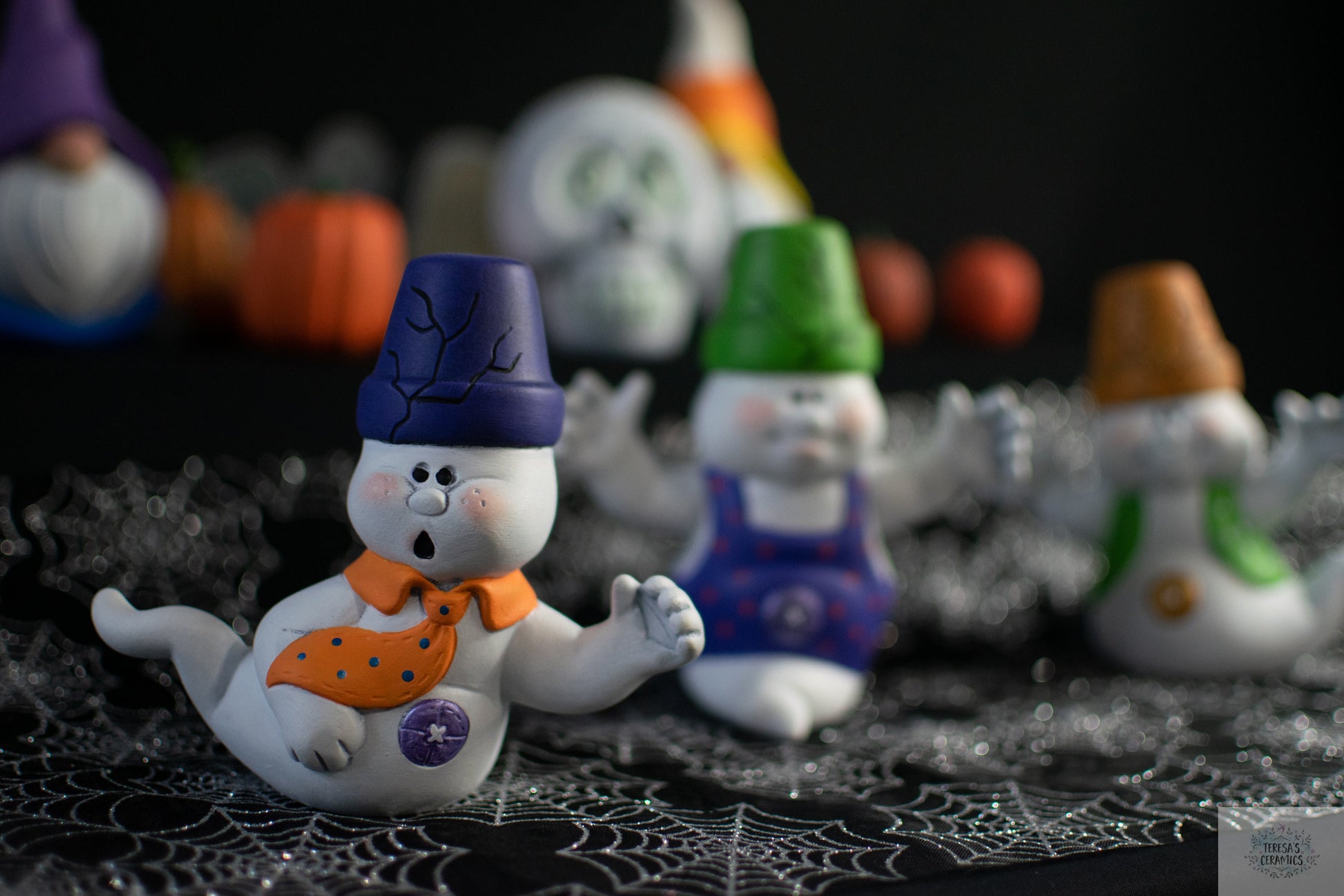 These aren't just ghosts; they're a delightful trio of hand-poured and painted ceramic spirits, ready to frolic around your garden this fall! Their adorable cracked terra cotta pots perched atop their heads show off their wonderfully goofy sense of humor, making them truly unique.