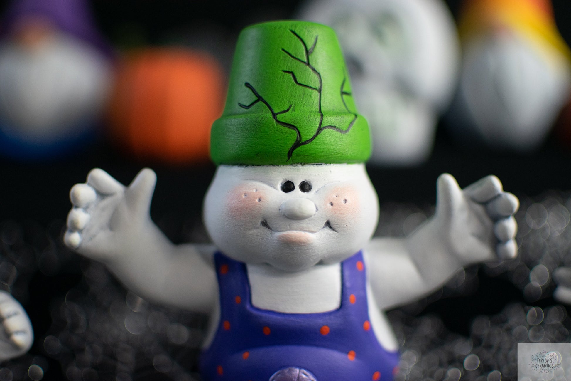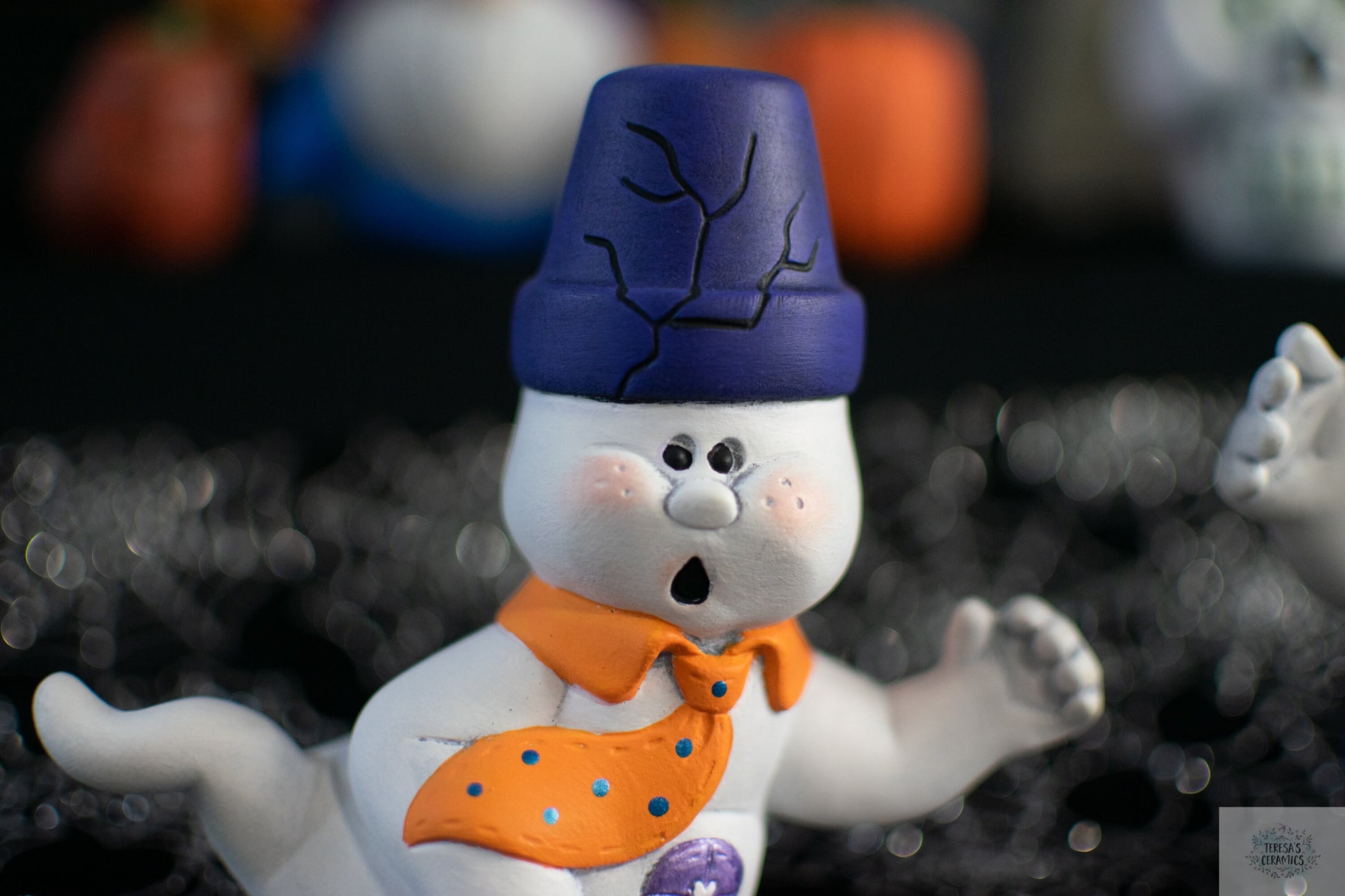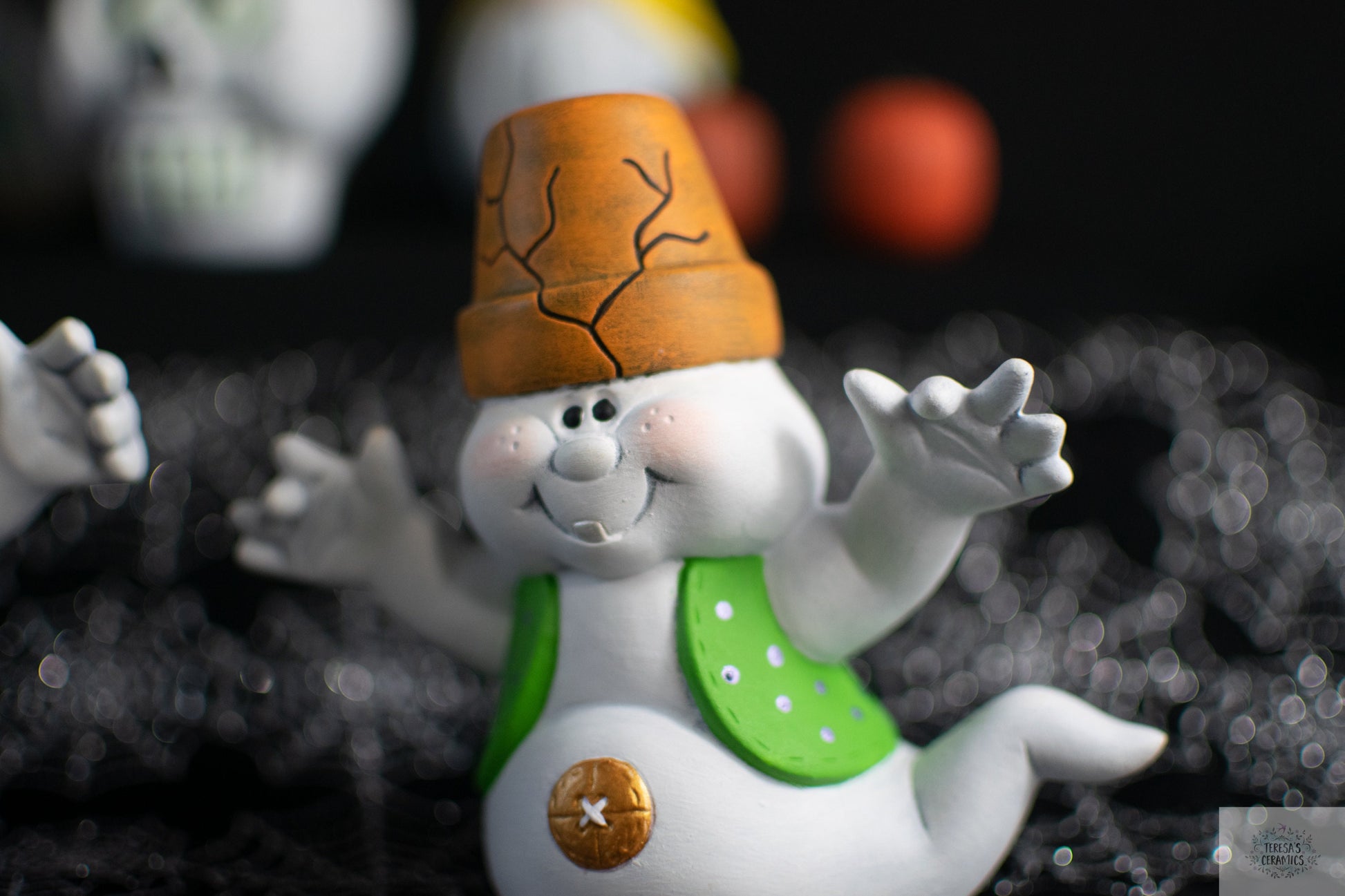 These aren't just ghosts; they're a delightful trio of hand-poured and painted ceramic spirits, ready to frolic around your garden this fall! Their adorable cracked terra cotta pots perched atop their heads show off their wonderfully goofy sense of humor, making them truly unique.