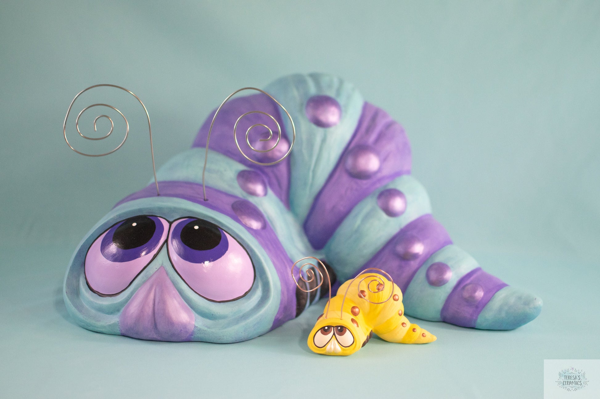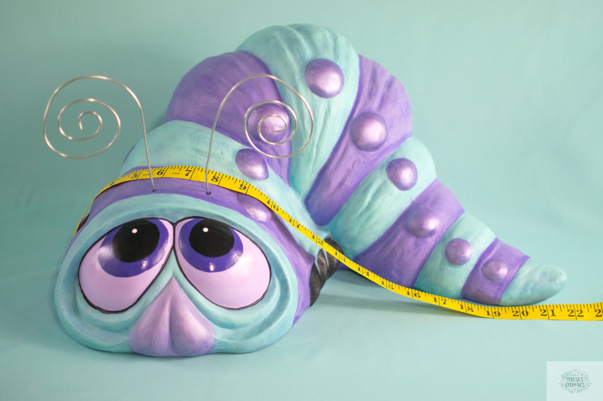 Giant Garden Wormy is handmade in my studio using the slip casting method. Wormy is a vintage mold that is newly slipcast using premium American clay slip. Once the worm is greenware, it is removed from the ceramic mold, cleaned and fired in the kiln. Once fired, giant wormy is cleaned again and painted a two-toned color palette. The worm is sealed with clear varnish to protect him from the harsh sunlight. Please take him inside during the winter months to preserve his colors and prevent breakage.