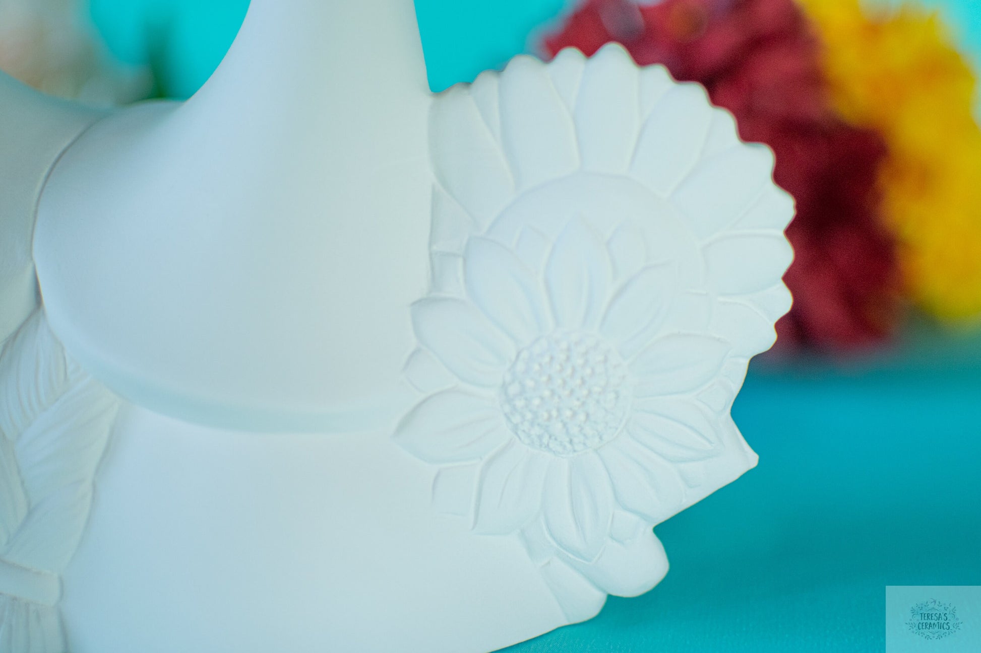 Bisque is easily painted with acrylic paint and sealed with a clear spray varnish found at your local craft shop.