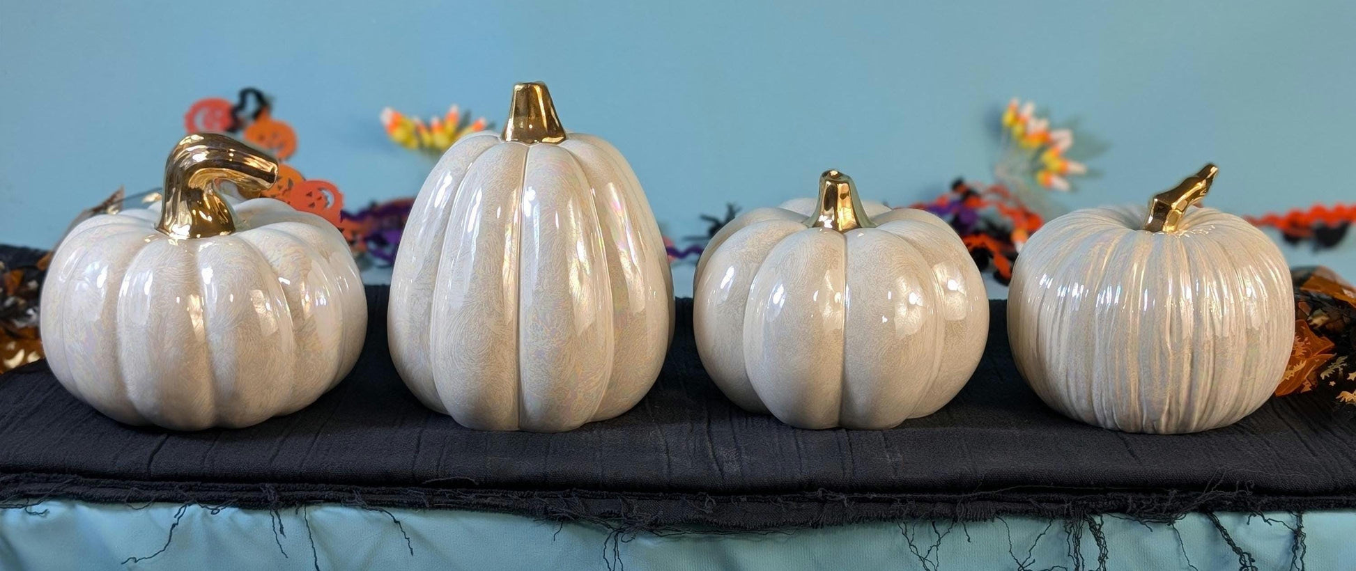 Mother of Pearl Overglaze: This special overglaze makes the pumpkins shimmer with a luminous, pearlescent glow, adding an ethereal quality to your decor.