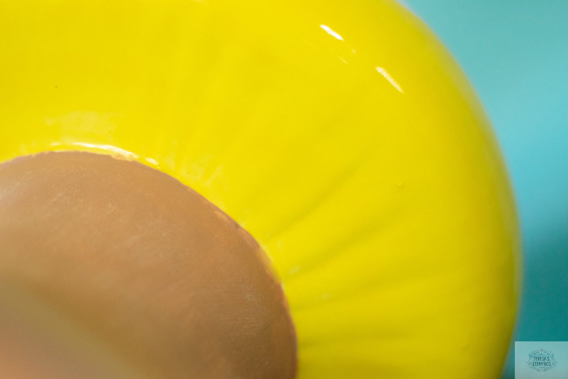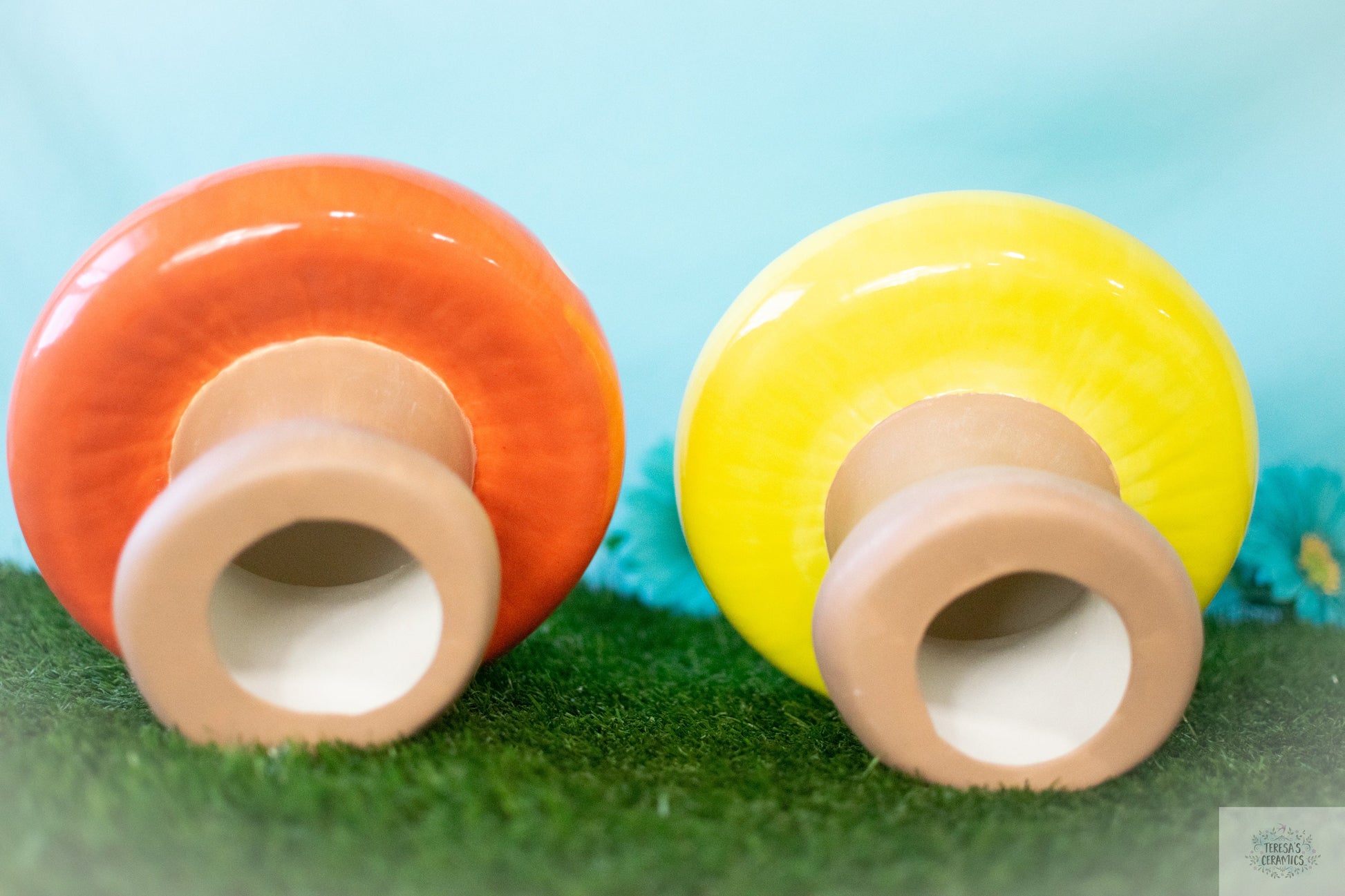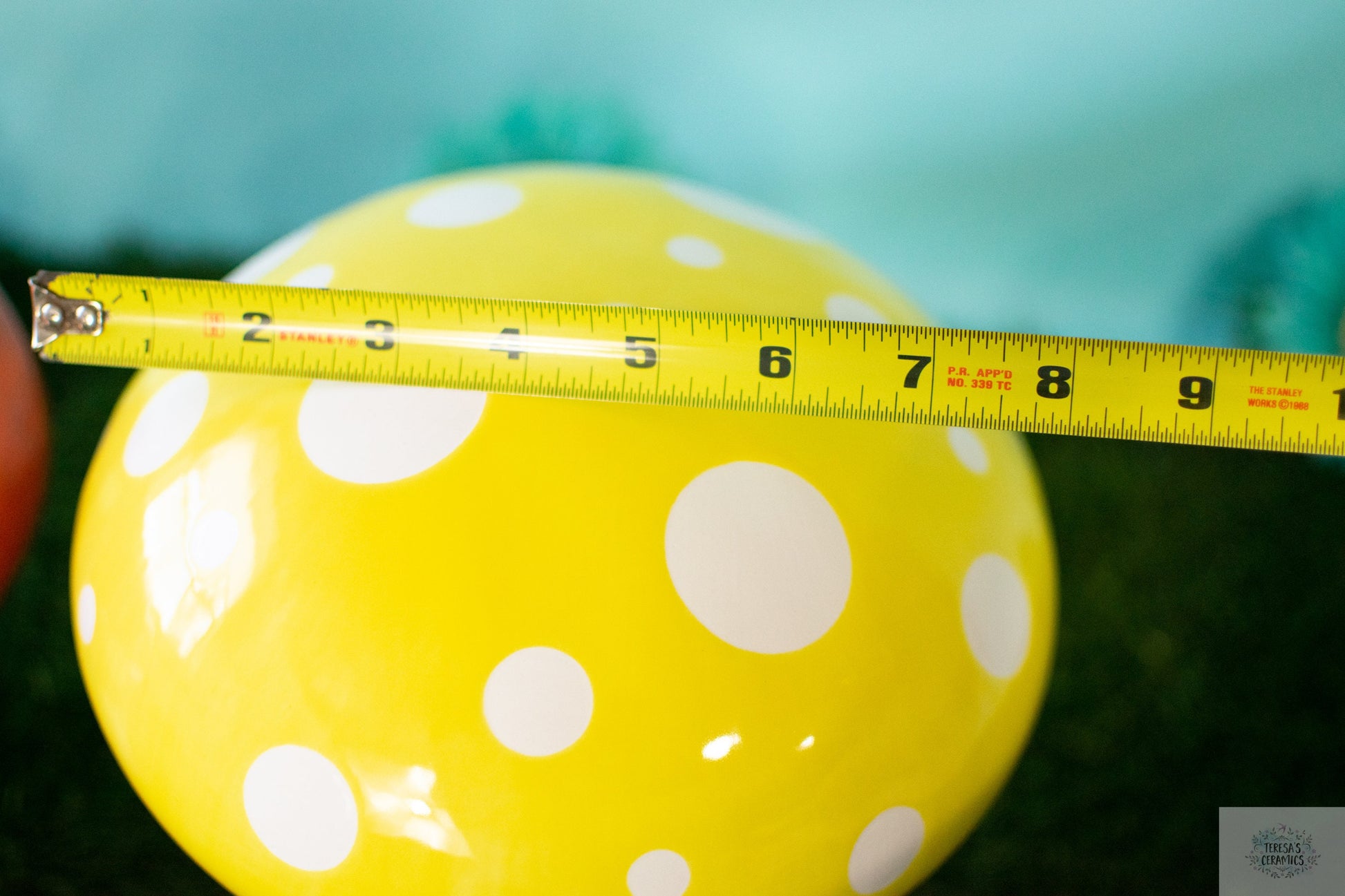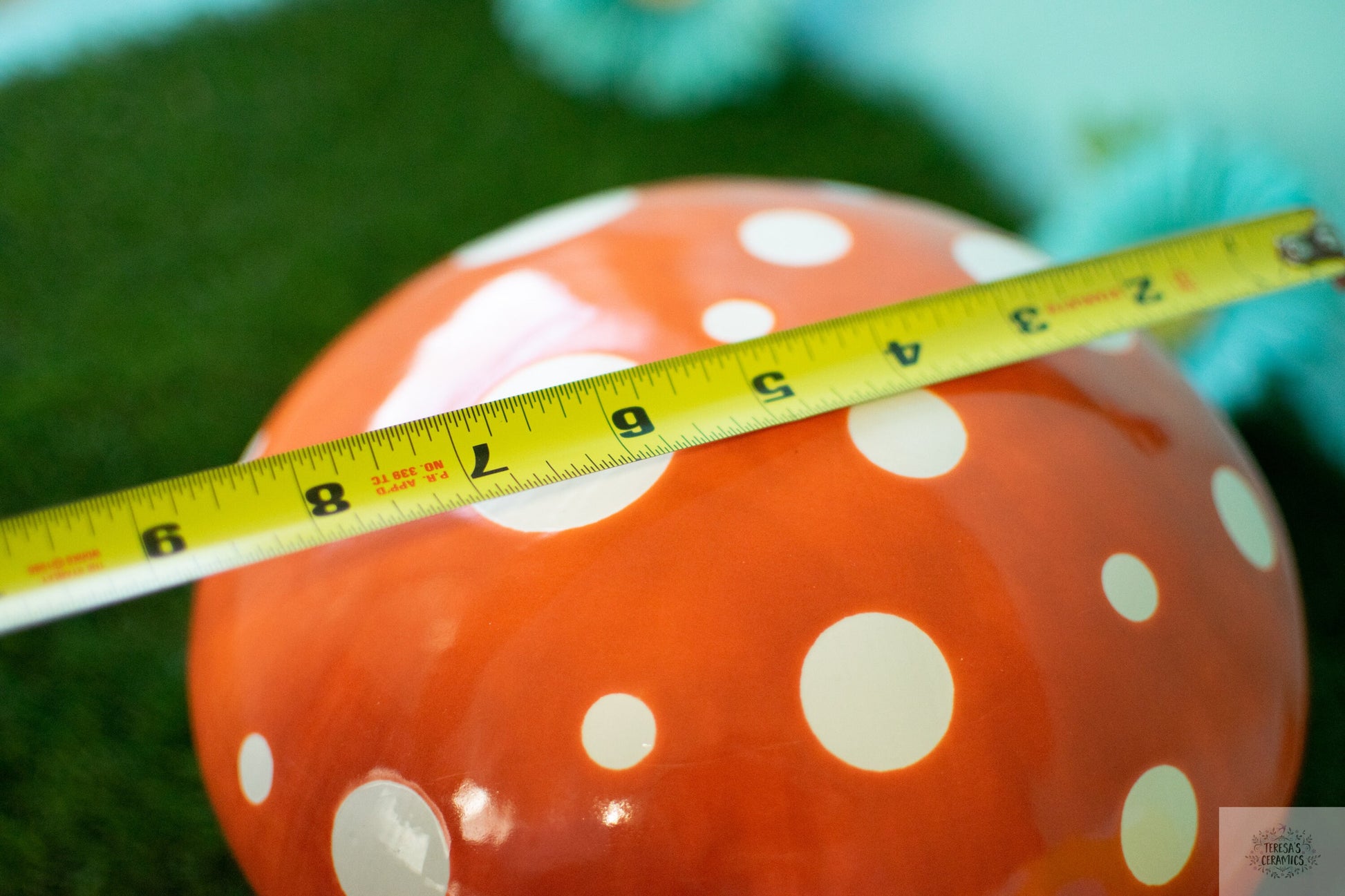 Jumbo! These plump mushrooms are round, all one solid ceramic! Each mushroom cap is shiny glazed yellow, blue, or orange polka dot style!