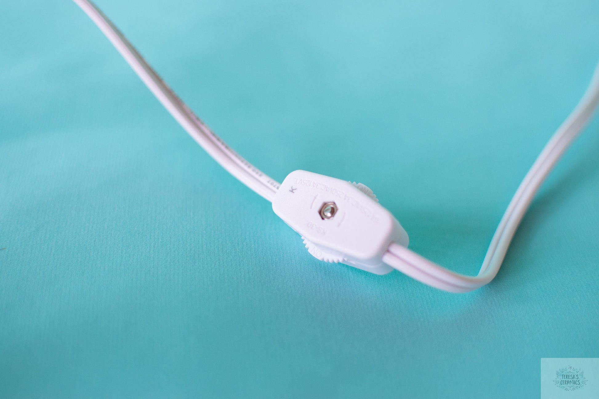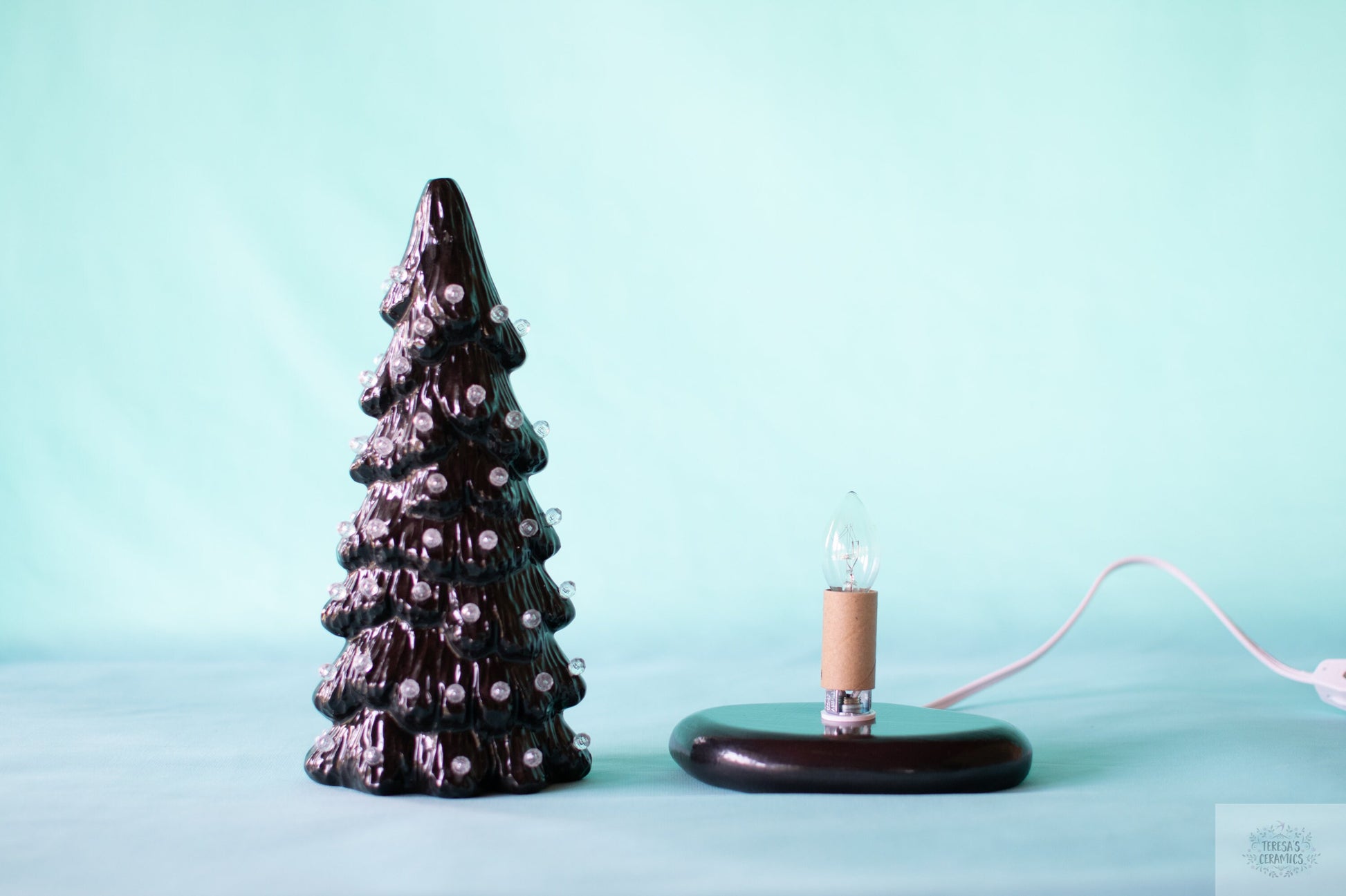 Wired & Lit: Finally, the white pin lights are securely glued in, and the ceramic base is wired with a bulb, cord, plug, and a convenient on/off switch.