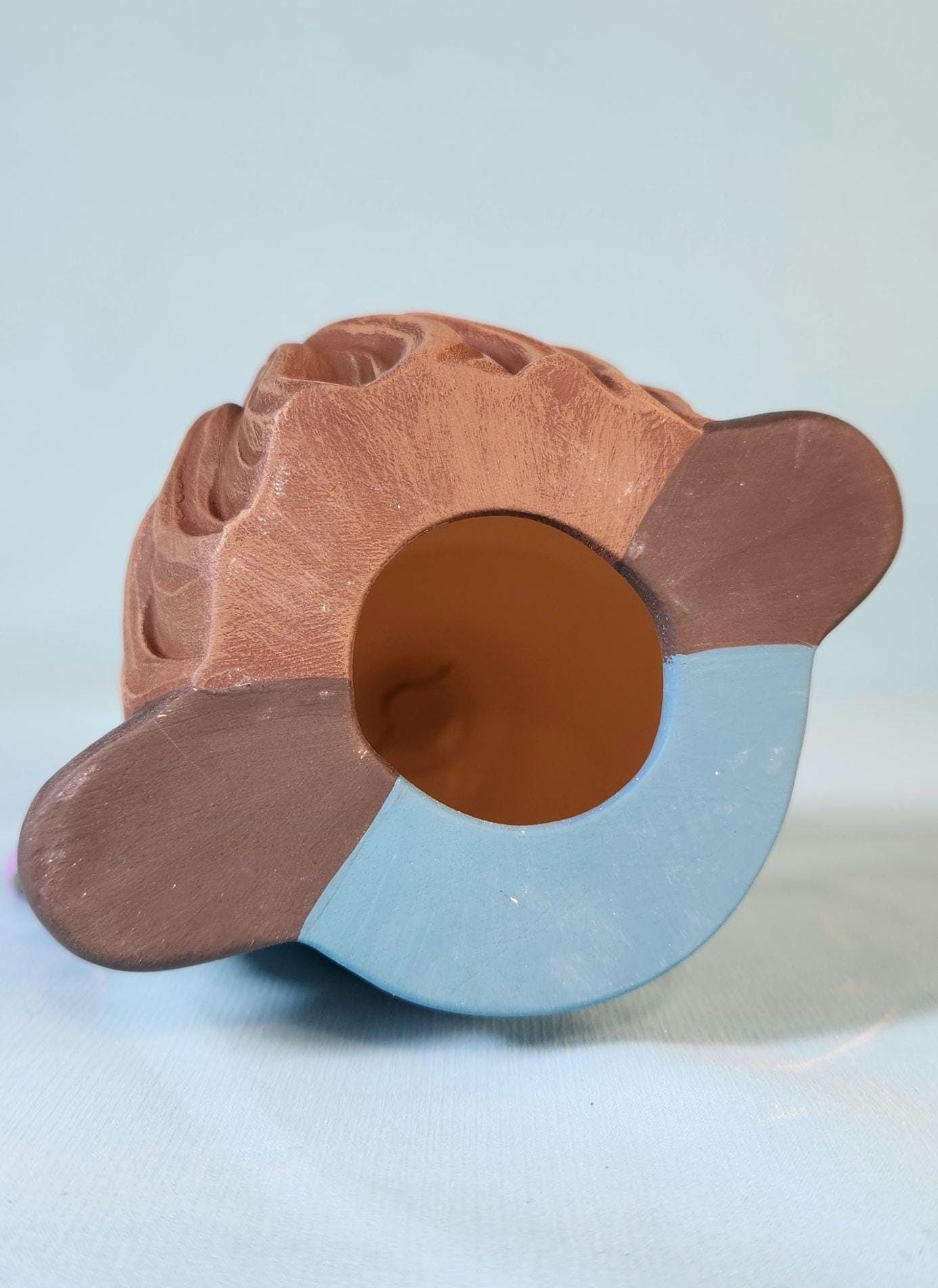 He was made using the slip casting method. Once dried the seams were meticulously cleaned and then he was fired in the kiln for about 6 hours. Left to cool for another day and finally painted using acrylic paints.
