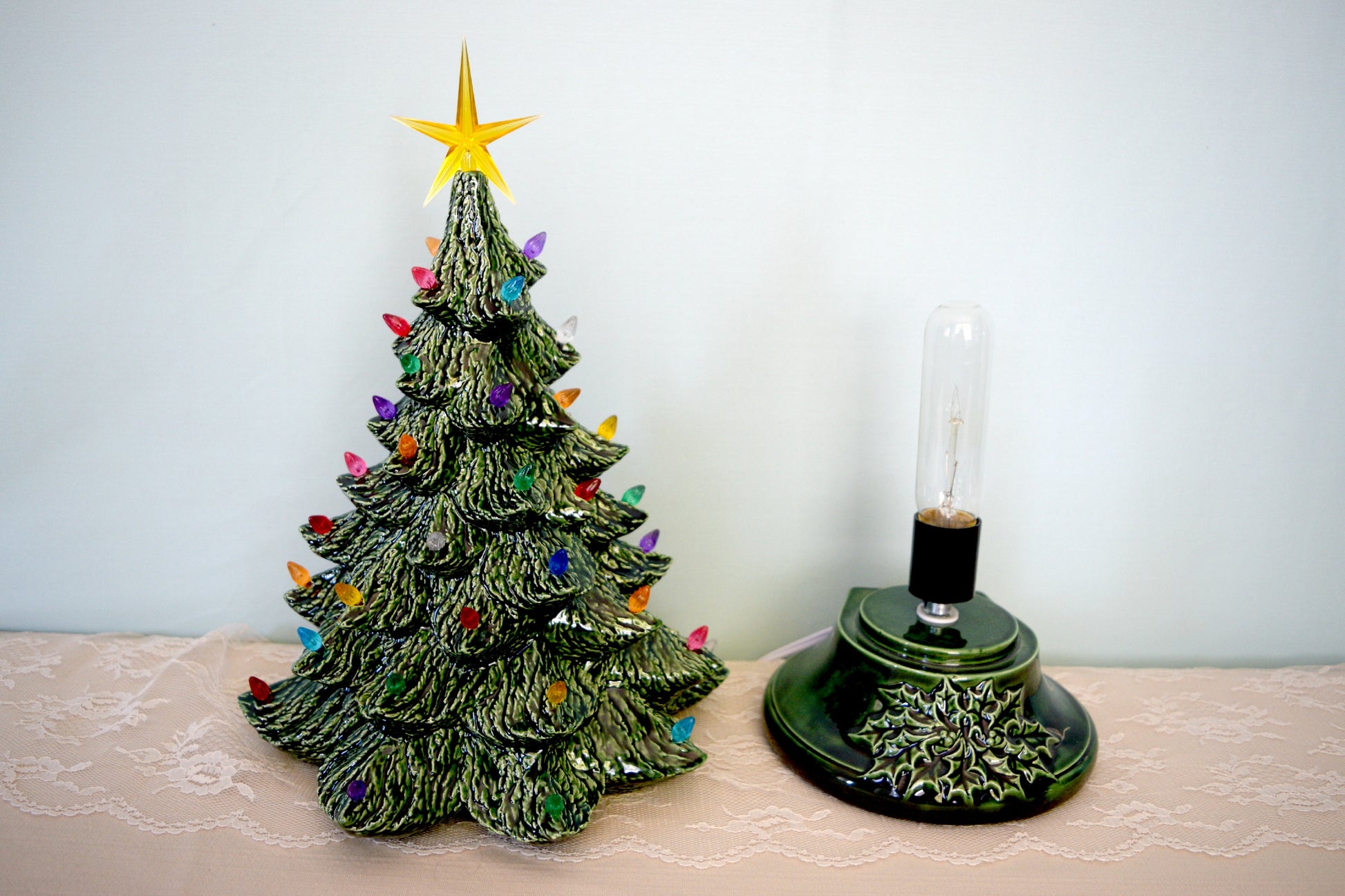 This listing is for the base only for a large Nowell Christmas tree. I will glaze it white with a green holly leaf. It will be wired and ready to plug in and use. An LED light bulb will be included.