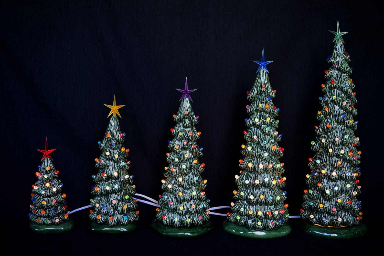 This listing is for all 5 trees pictured measuring 16, 13 and 10.5, 9 and 5.75 inches tall and features your choice of top stars and multi-colored round bulbs.
