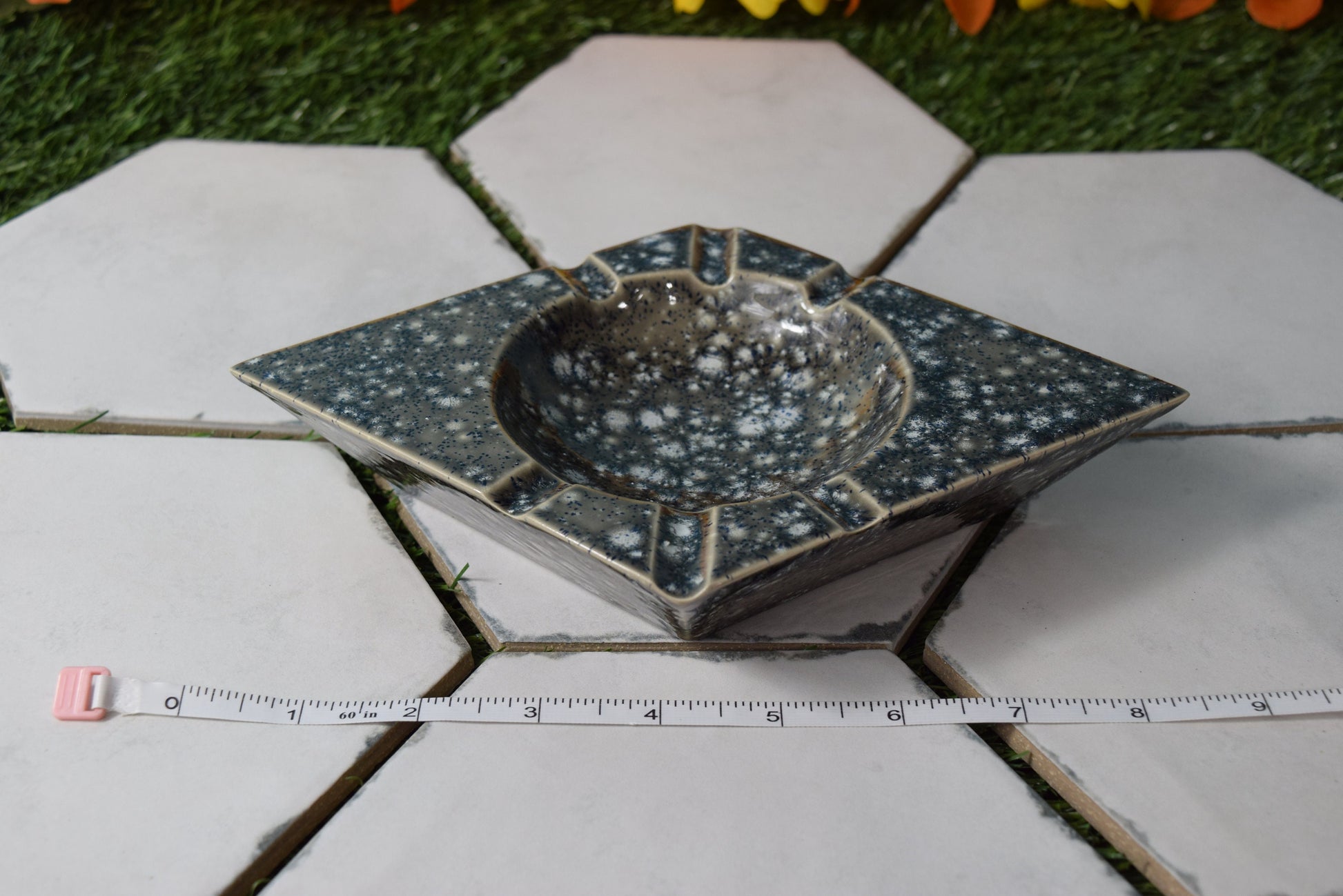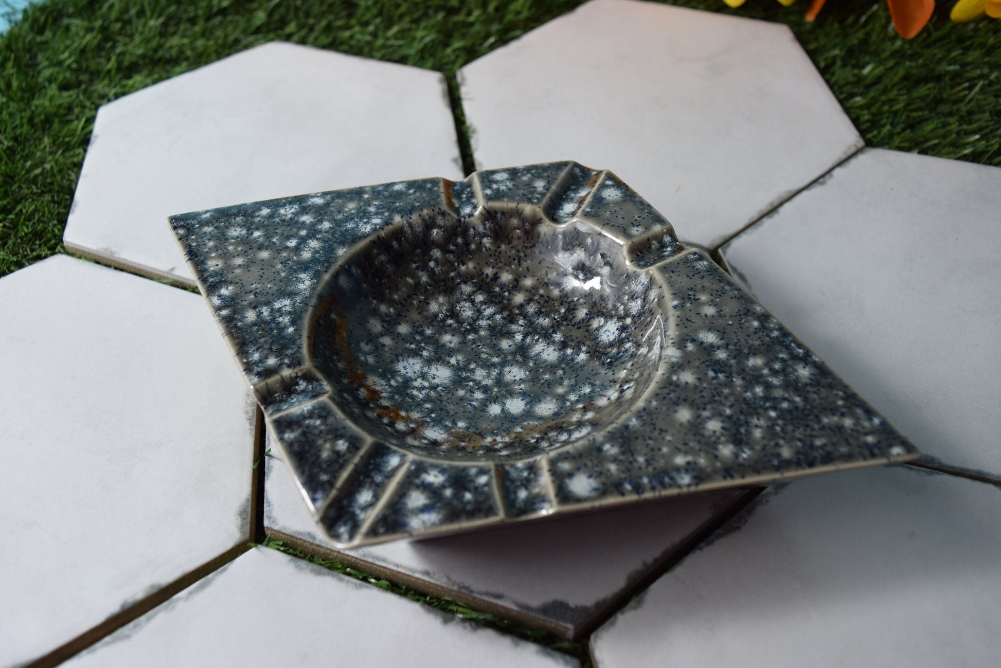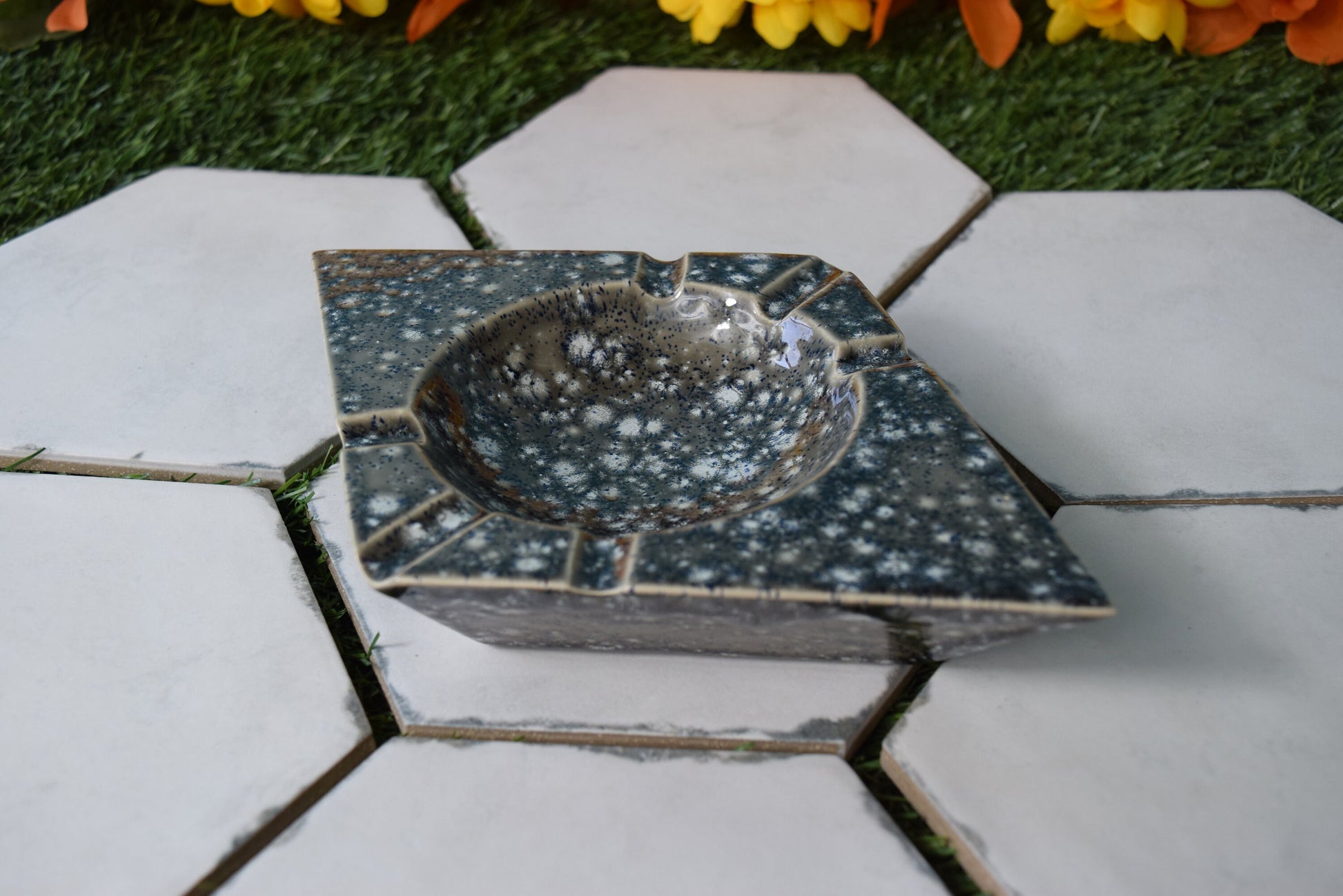 Add this rare geometric ashtray to your collection or give as gift to any hobbyist. This unique dish would make a great catchall, keyholder and ashtray. This one of a kind piece features a cosmic black glaze that has a charcoal gray base with pops of white and flecks of dark blue.