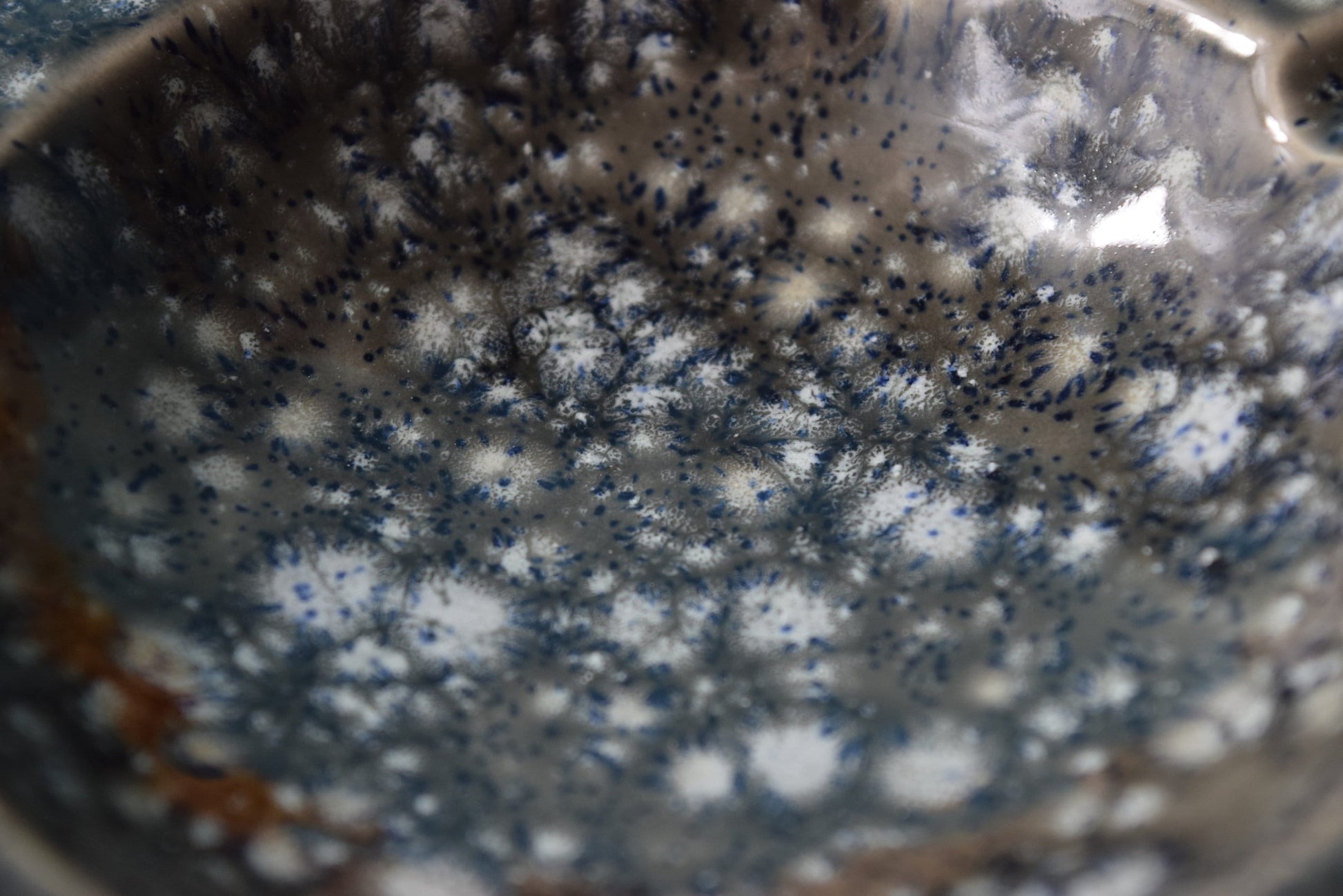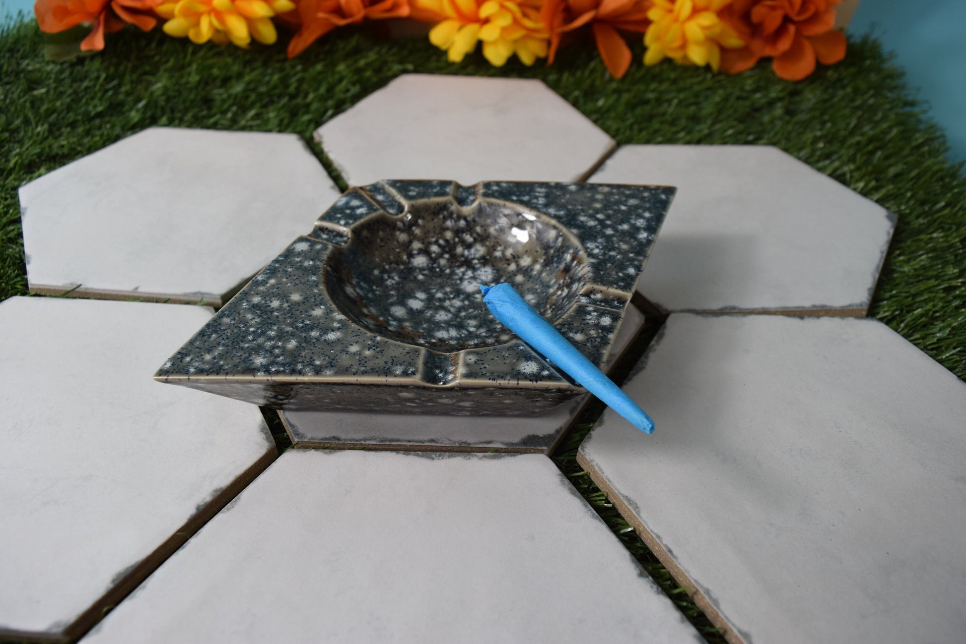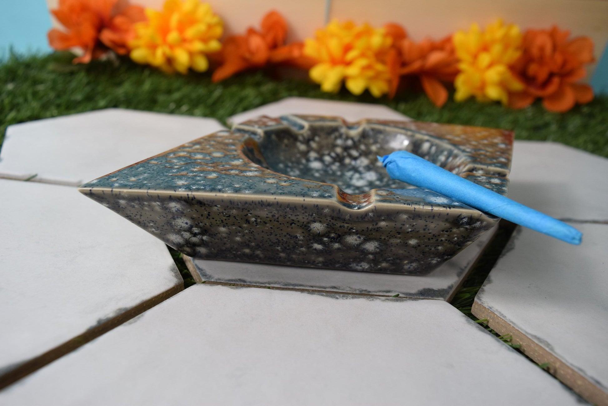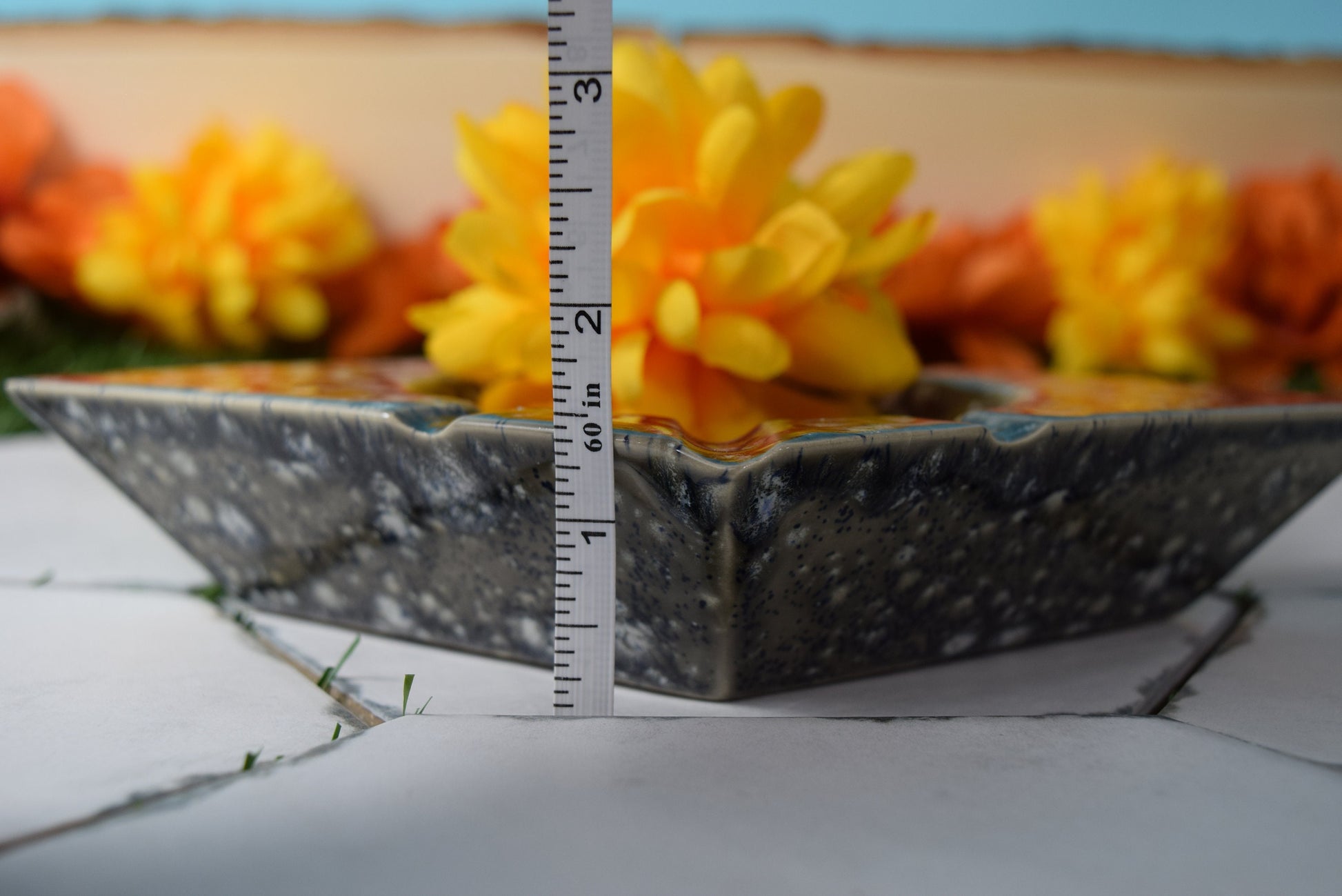 Add this rare geometric ashtray to your collection or give as gift to any hobbyist. This unique dish would make a great catchall, keyholder and ashtray. This one of a kind piece features a cosmic black glaze that has a charcoal gray base with pops of white and flecks of dark blue.