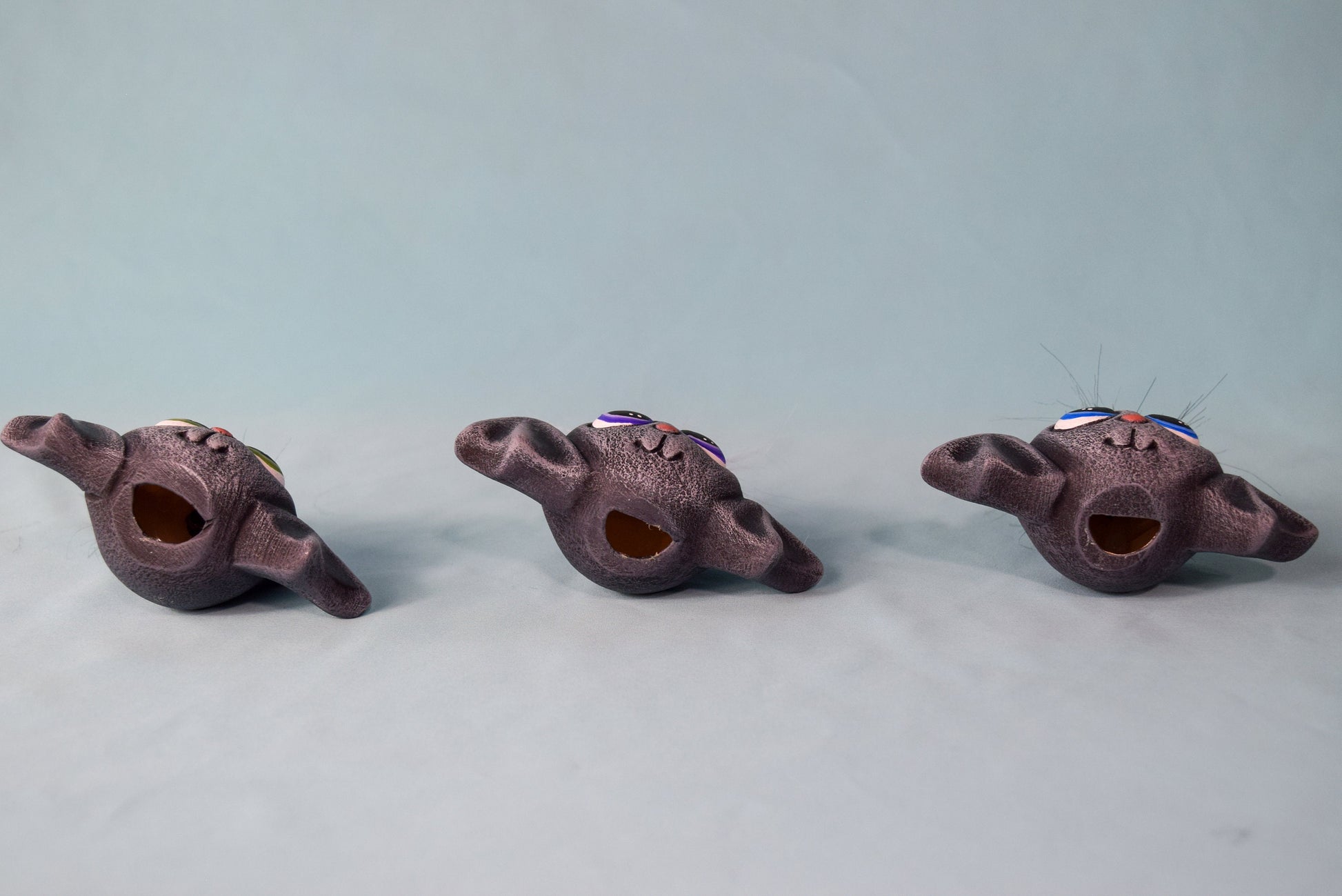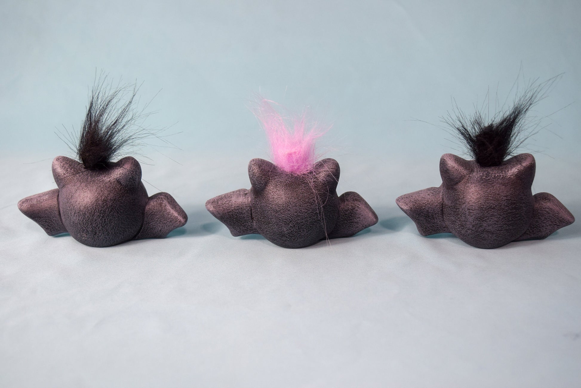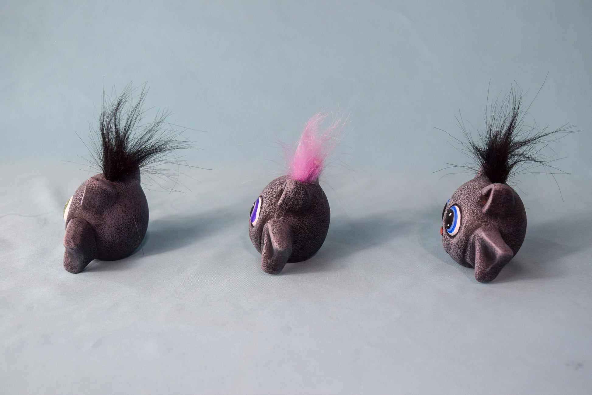 They can also be ordered with different eye and felt color so you can mix and match to however you feel. We offer them with purple, green, or blue eyes. We can do either black or purple hair for them as well! Mix and match!