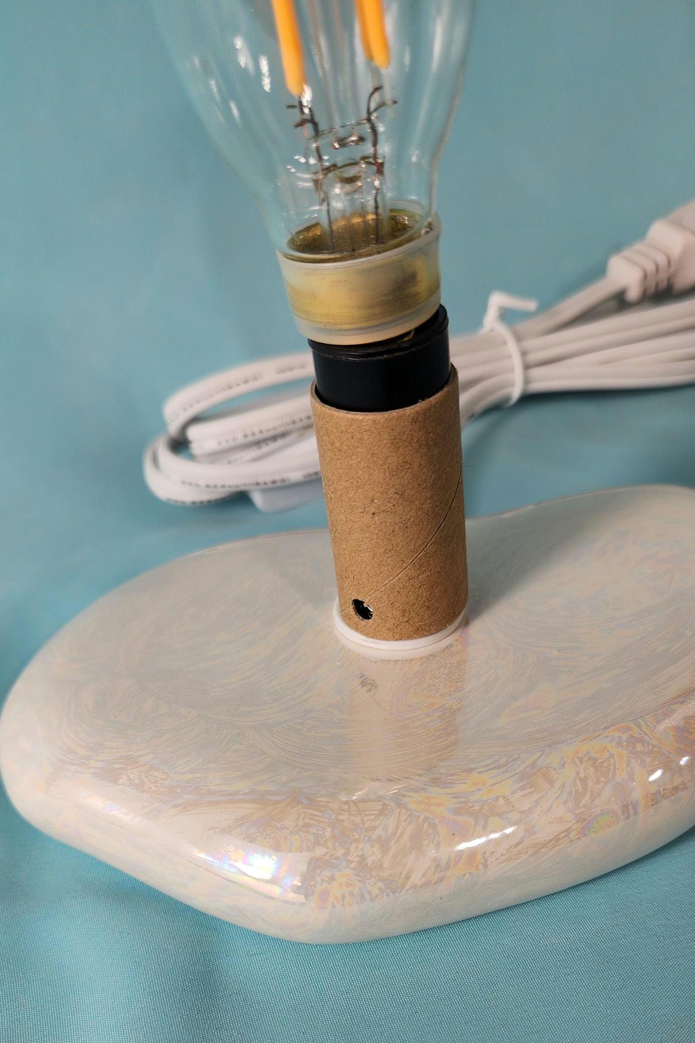 This is one of our popular 13 inch slim Christmas trees. It is glazed white, and finished with Mother of Pearl. The Mother of Pearl gives it a beautiful swirly iridescent shine to it that pictures just don't justice.