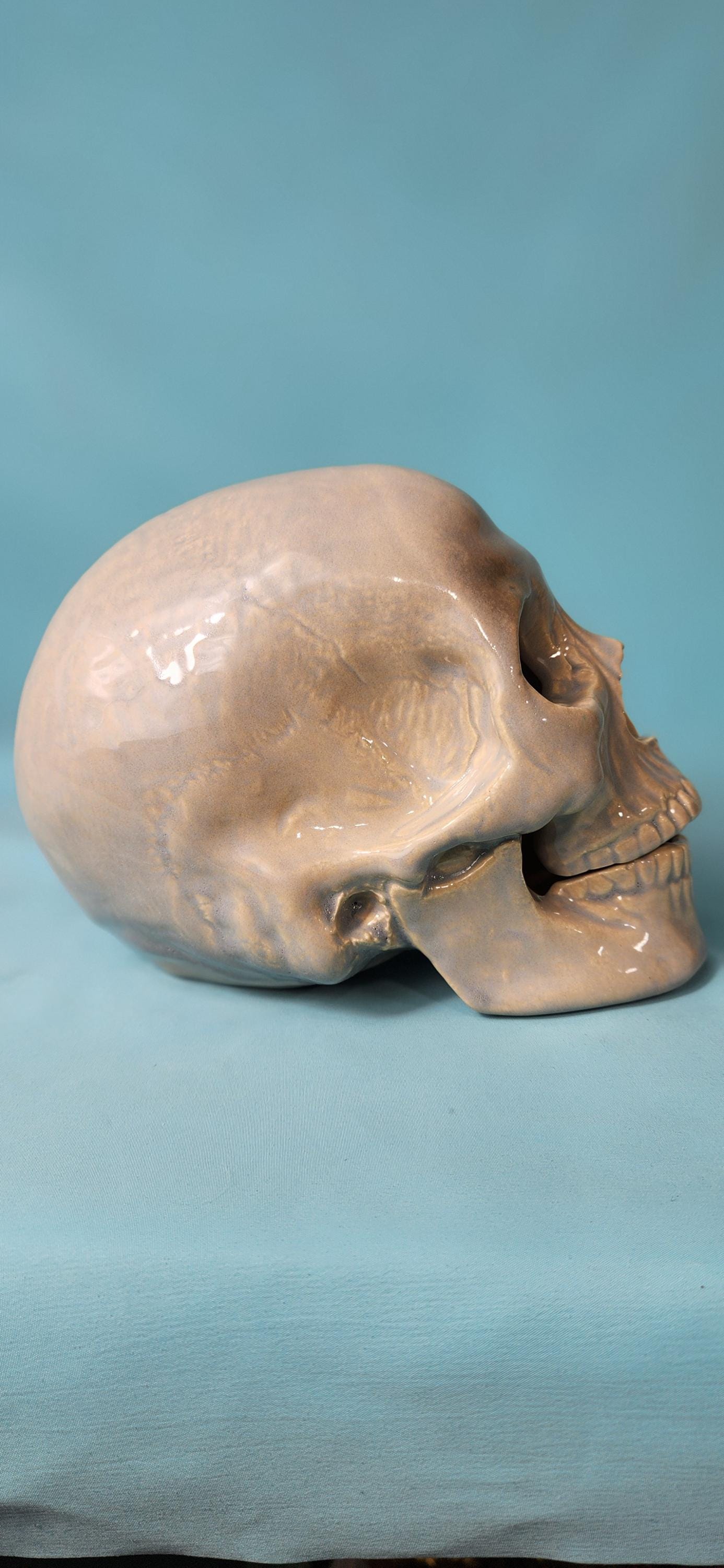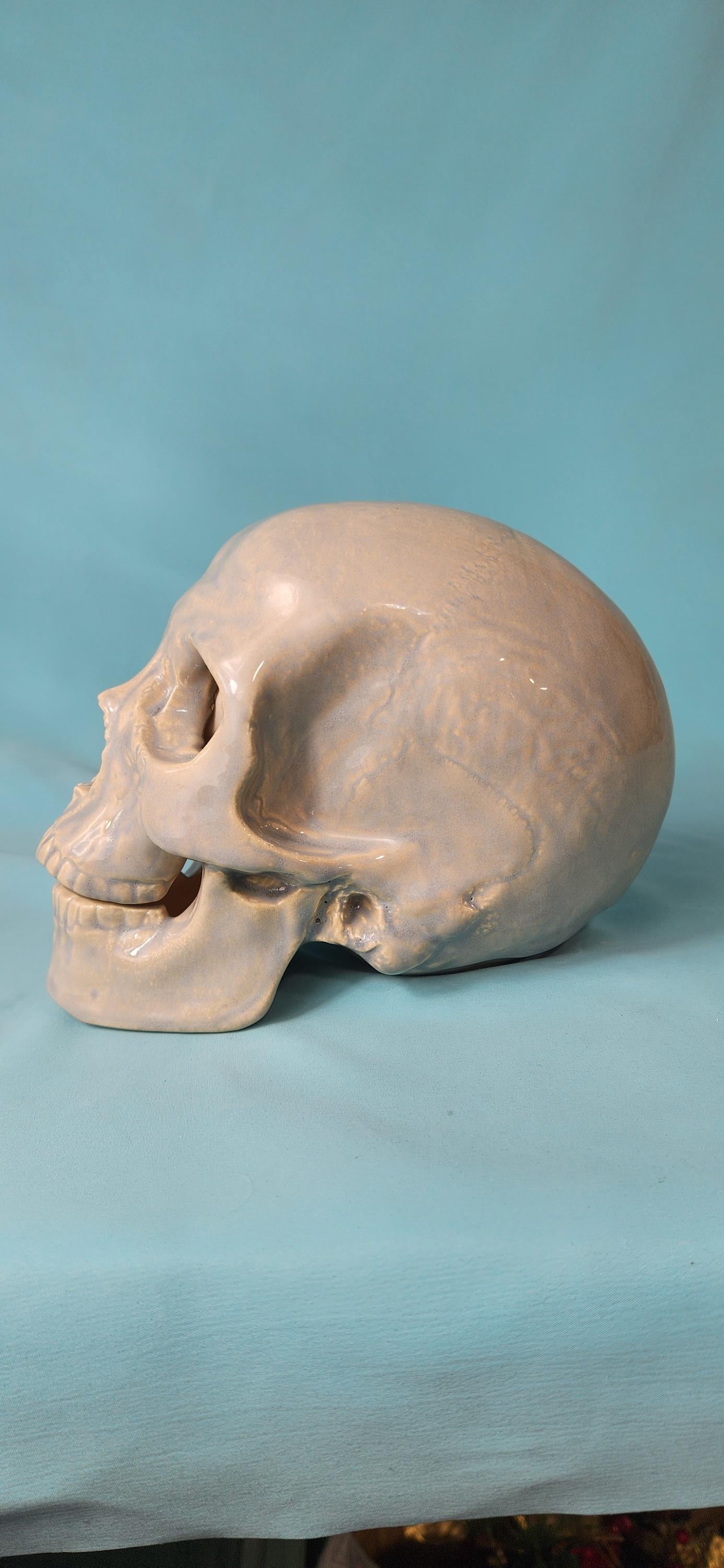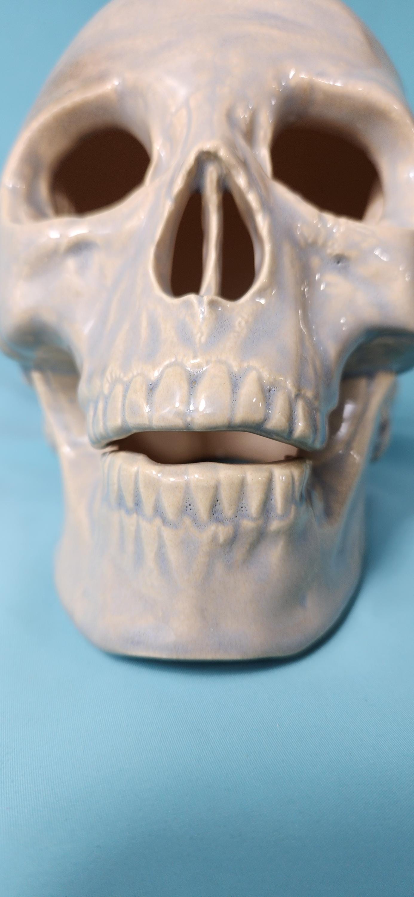 This skull is very cool, very spooky, and pretty realistic. It is cleaned fired and finished in our shop, then glazed and fired again with an oyster shell glaze which makes this thing POP! It's a great Halloween entry way piece, dining room piece, and really, it belongs anywhere to spook someone out!