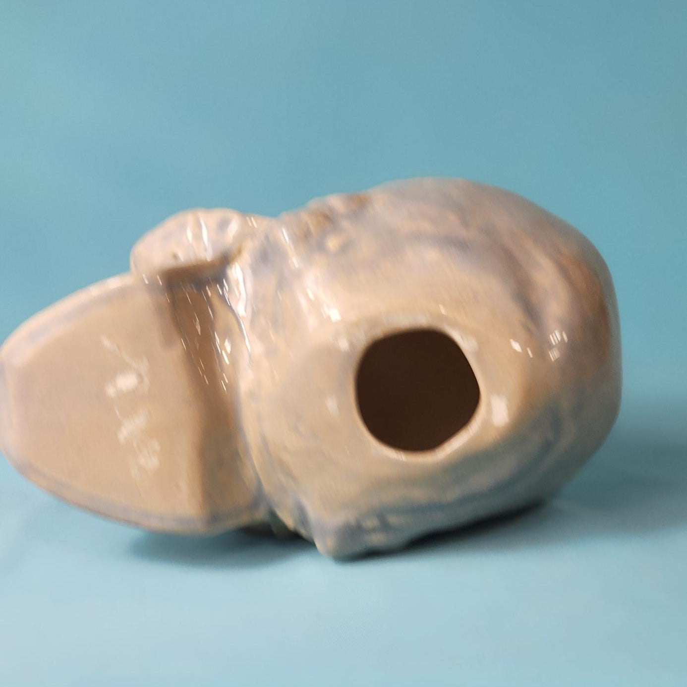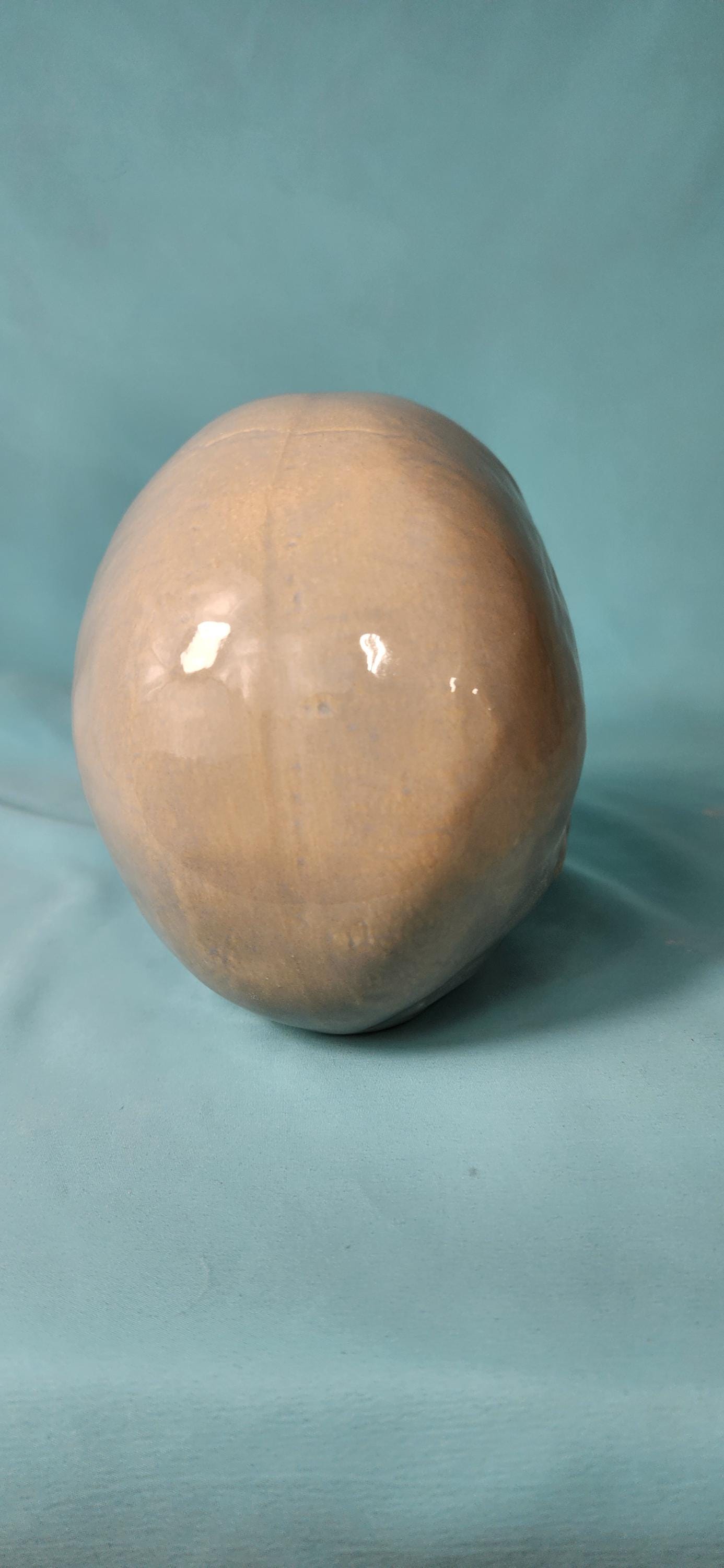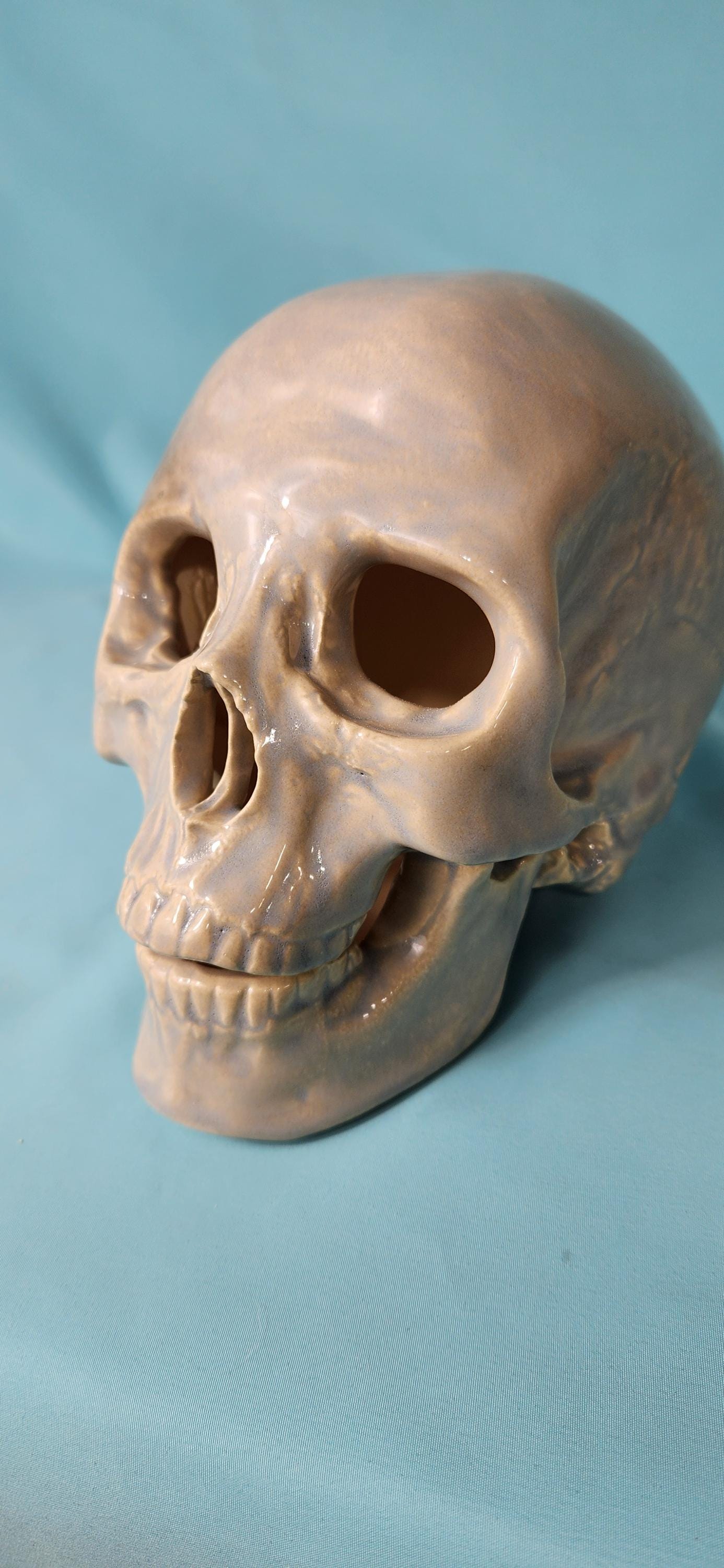 This skull is very cool, very spooky, and pretty realistic. It is cleaned fired and finished in our shop, then glazed and fired again with an oyster shell glaze which makes this thing POP! It's a great Halloween entry way piece, dining room piece, and really, it belongs anywhere to spook someone out!