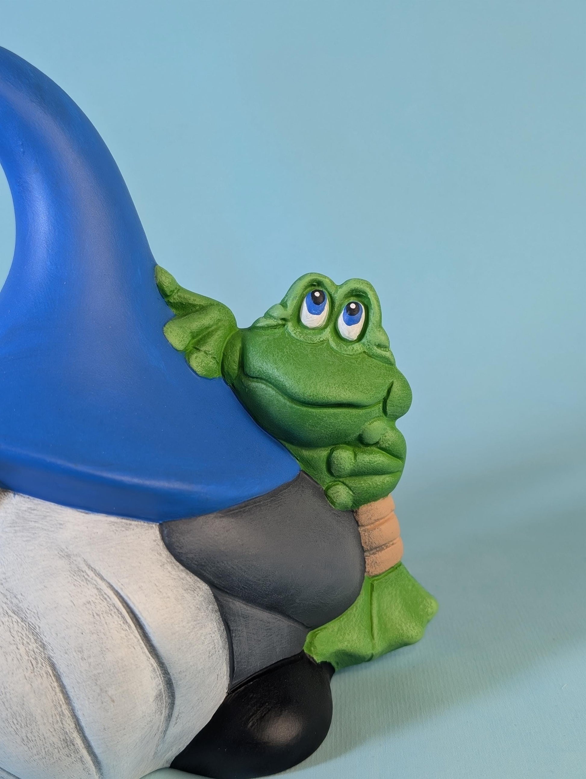 A super cute frog perches on the wizard's arm, adding a touch of enchantment.