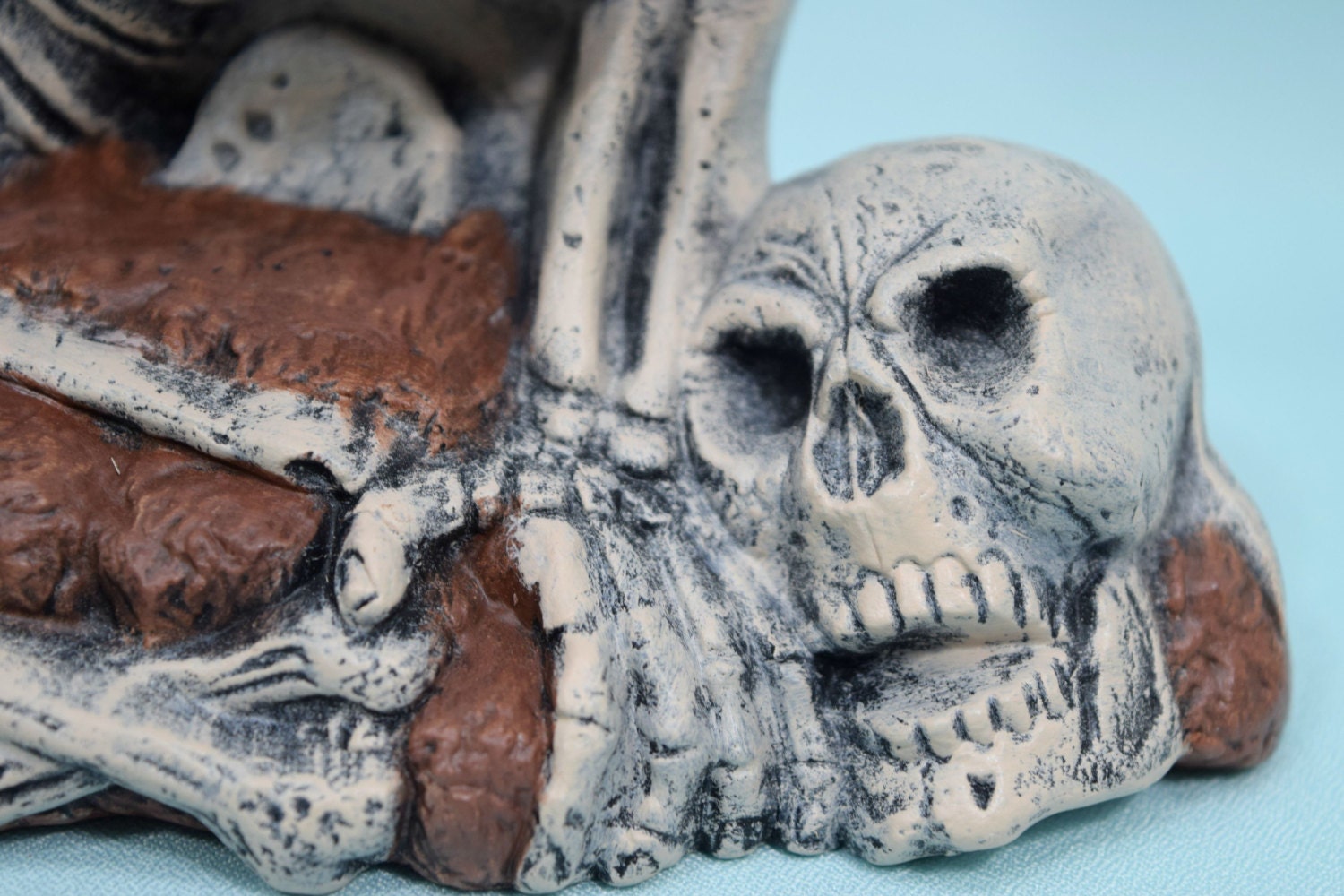 A take on a scary Halloween prop, this hand-painted ceramic can be placed indoors or outdoors.