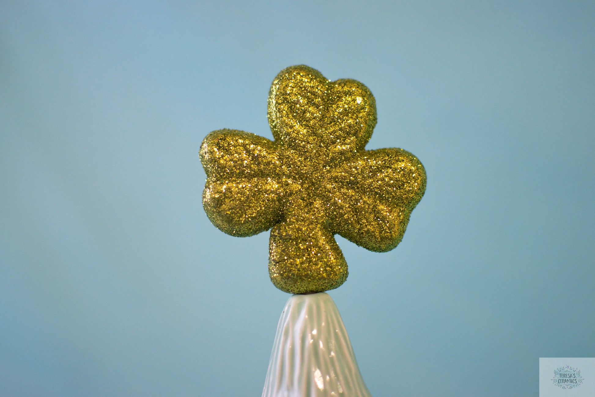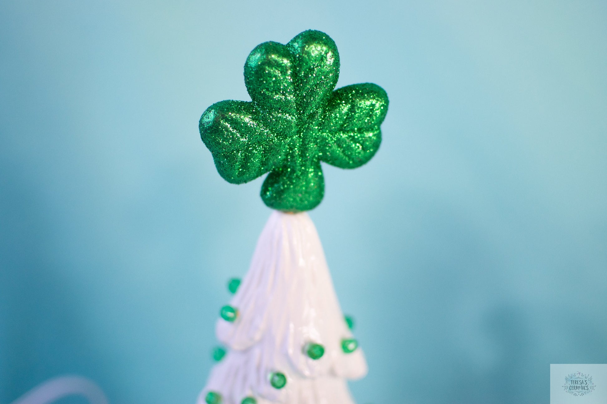 **PLEASE choose between a mint-green glaze with multi March colored pin lights, or white glaze with green pin lights from the drop-down menu!