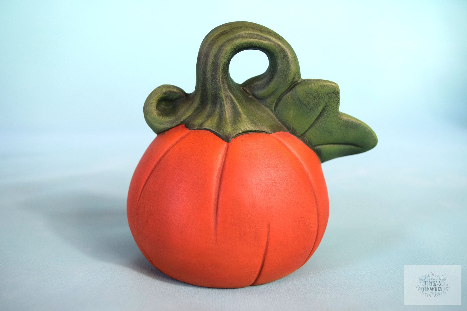 Fired & Painted: Once fired in the kiln, I hand-paint the pumpkin a very bold orange and the leaf up top a beautiful shade of green.