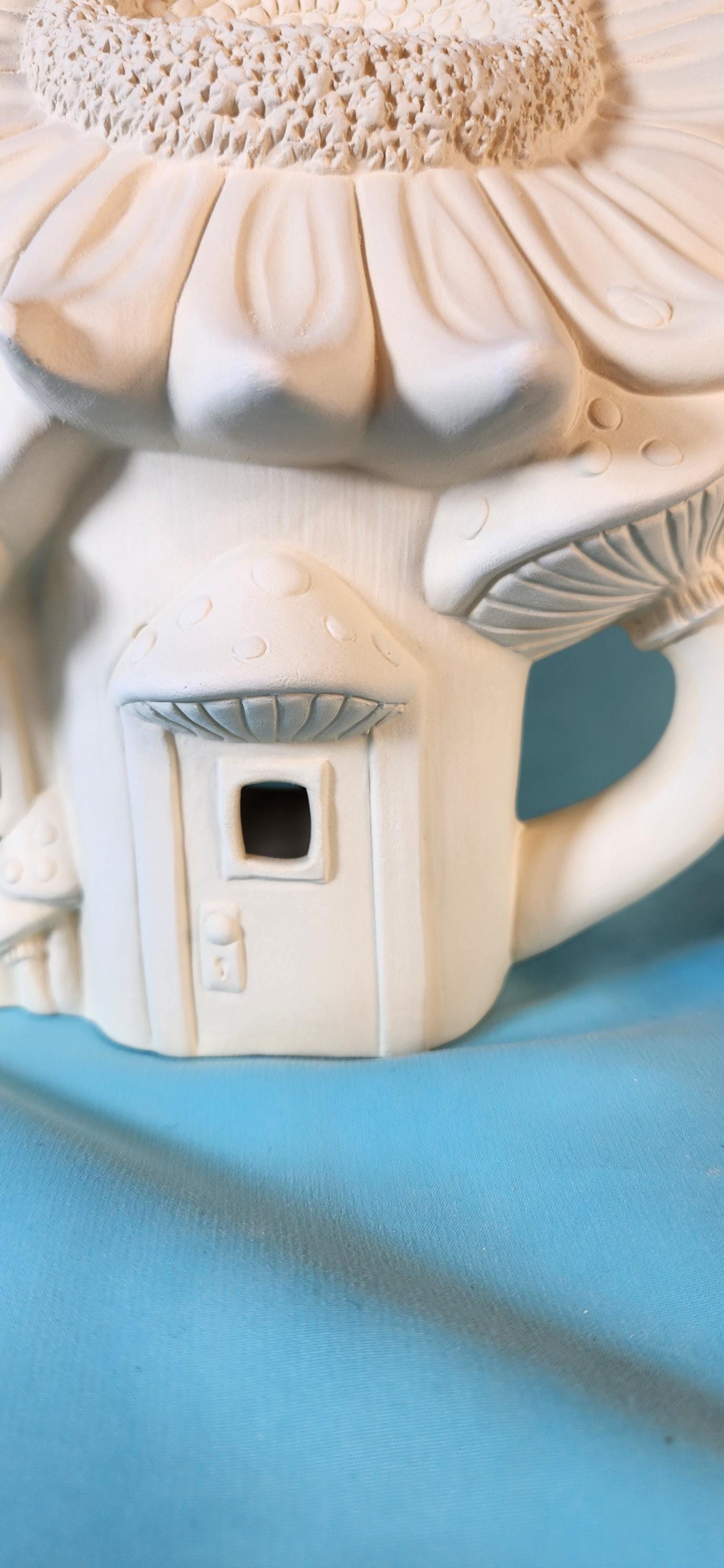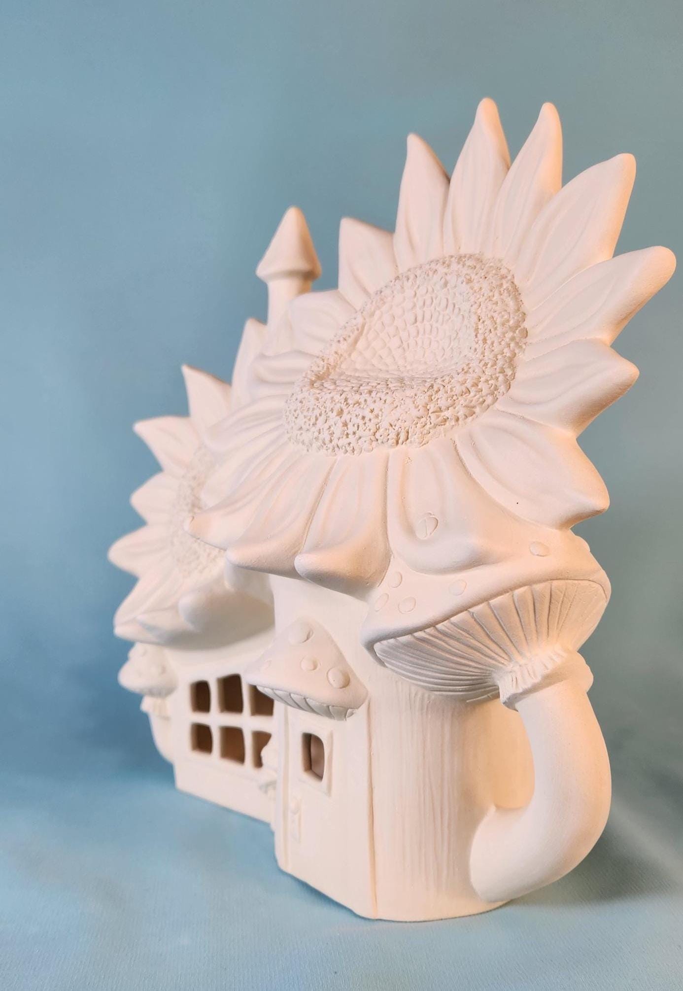Unpainted Ceramic Sunflower Mushroom Fairy House - Handmade Garden Miniature Bisque Gift for Outdoor Decor