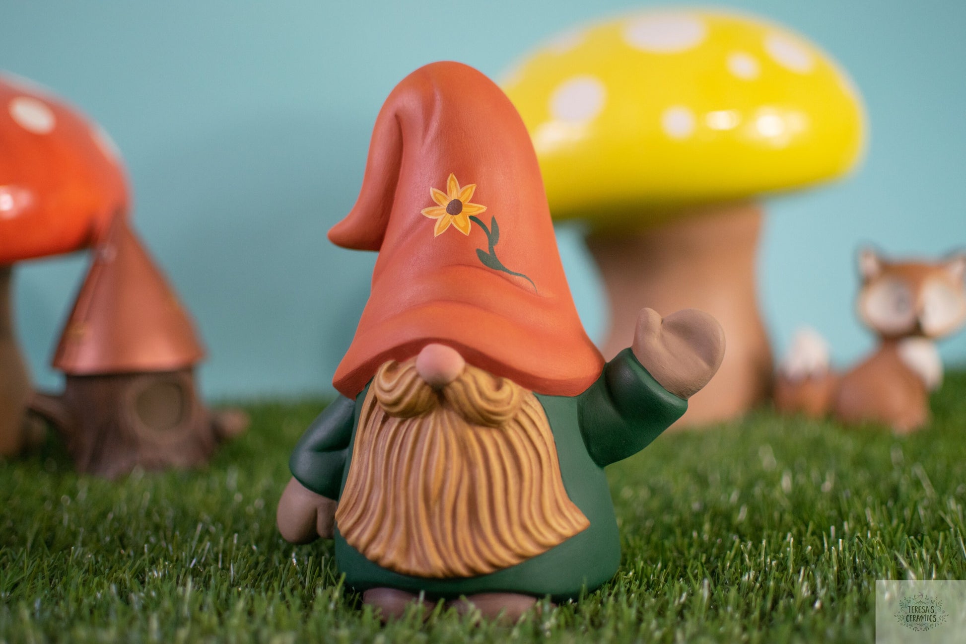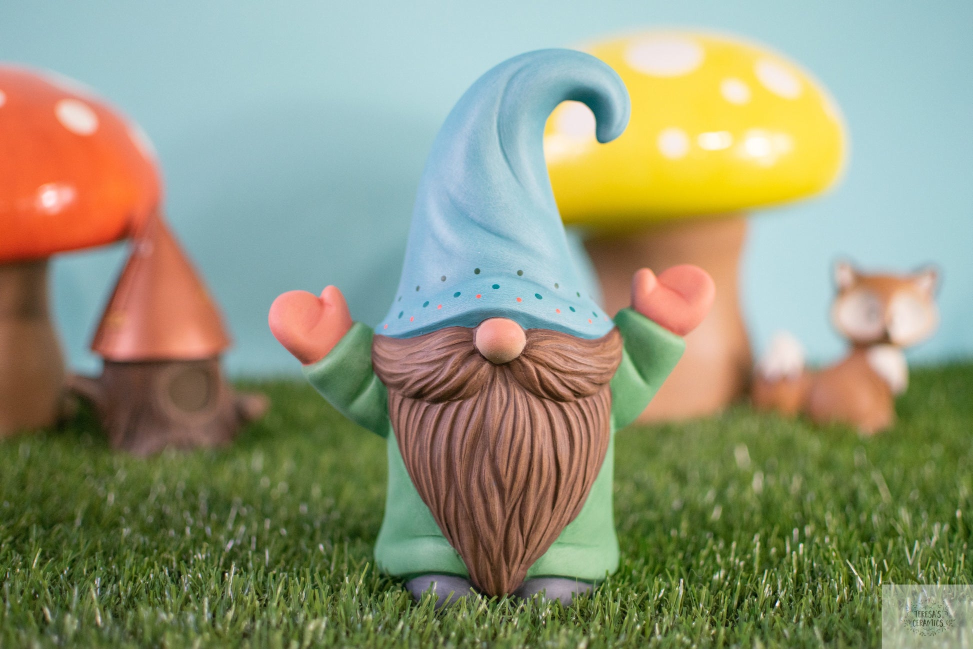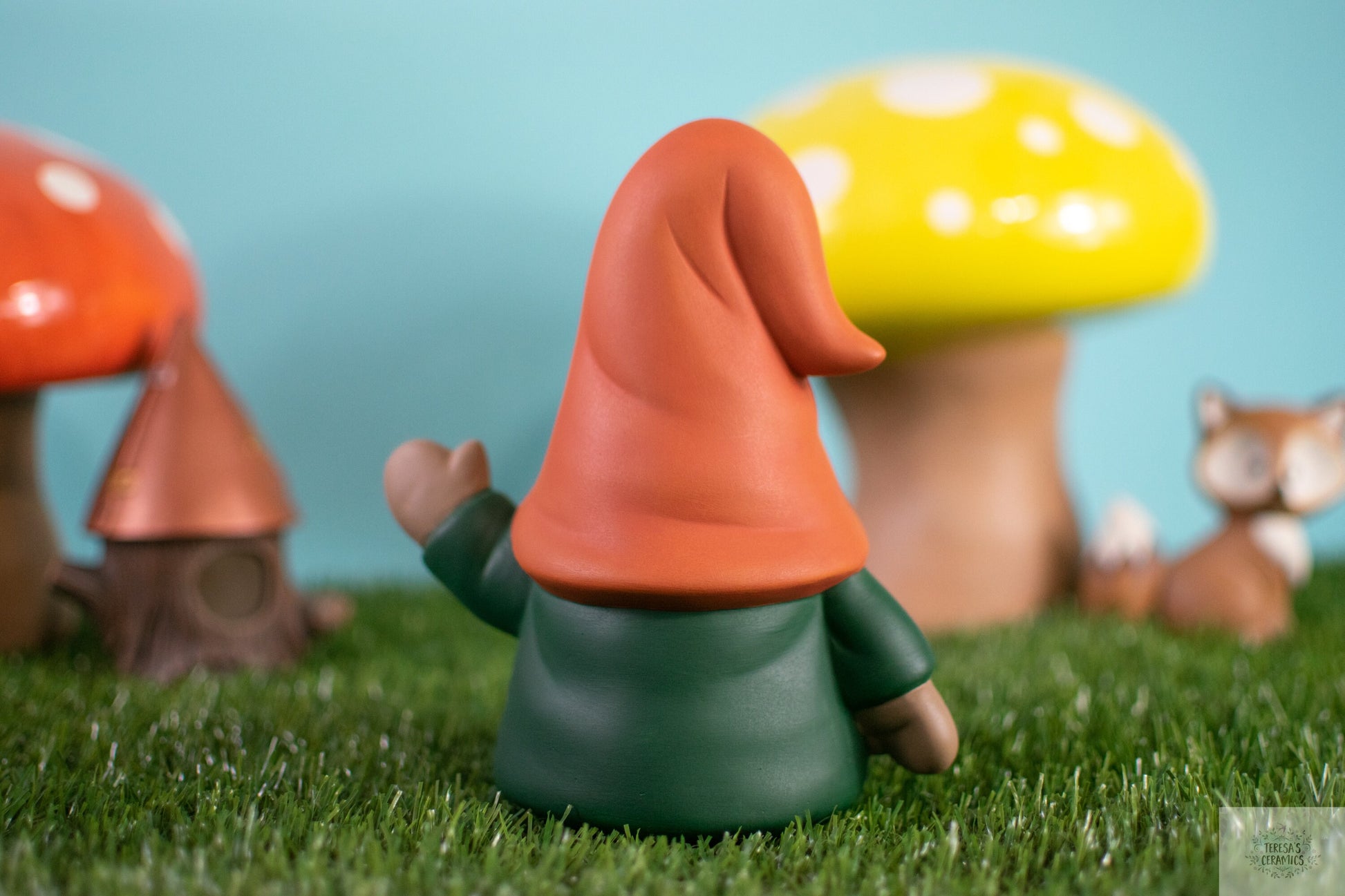 All gnomes are handmade using the slip casting method. Each whimsical woodland gnome is removed from the ceramic mold, cleaned, fired in the kiln and removed once cooled. After the piece cools, which takes half of a day, they are cleaned once more and then painted to be shipped off to your doorstep!