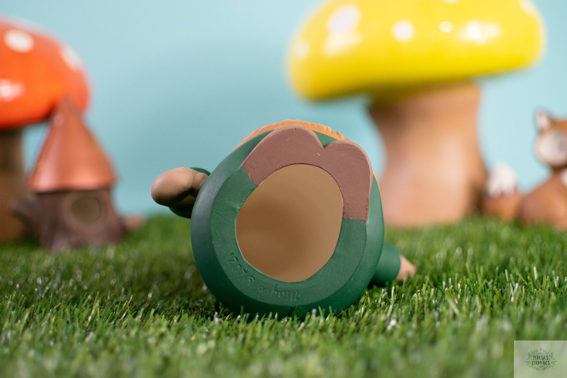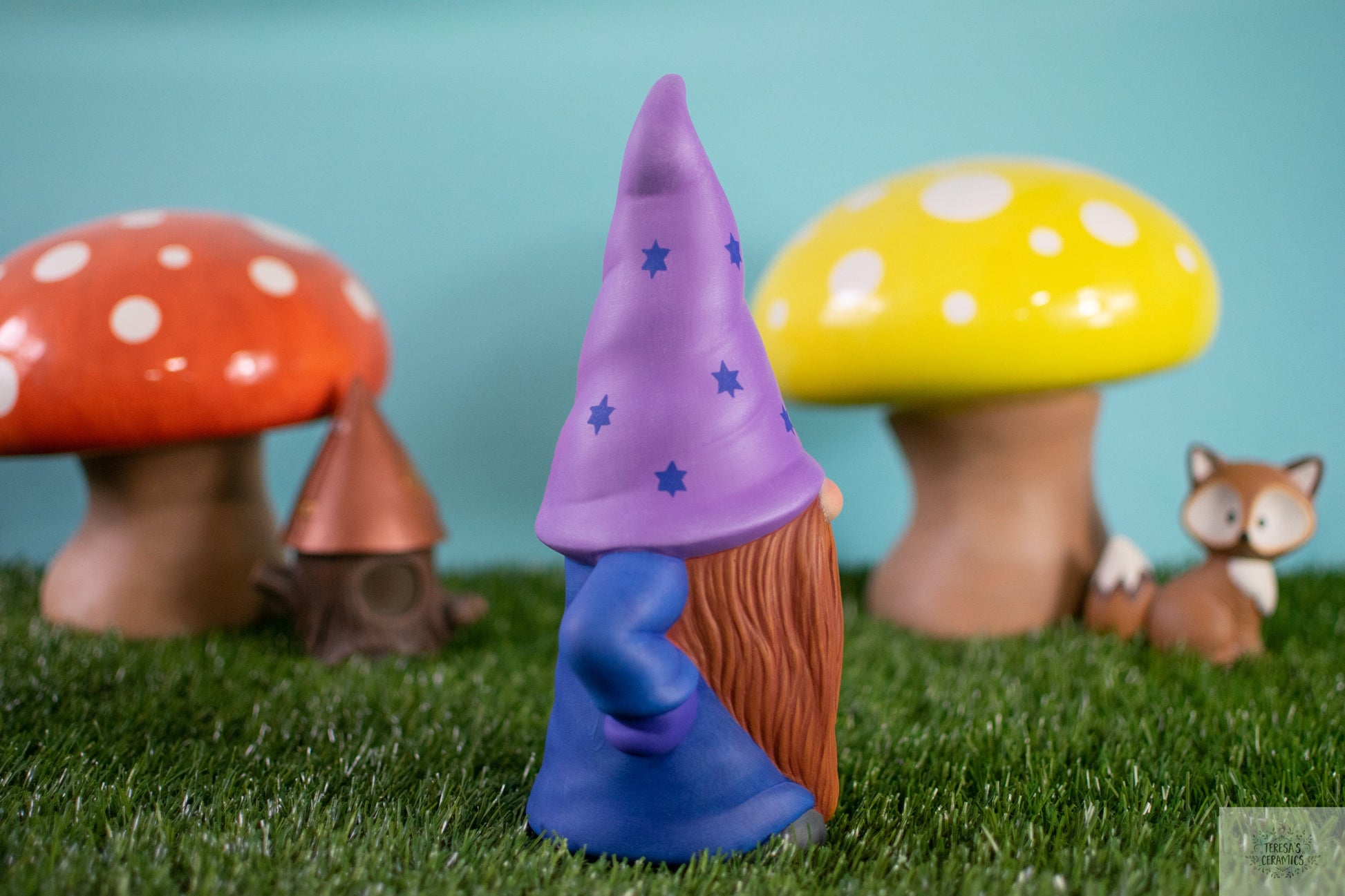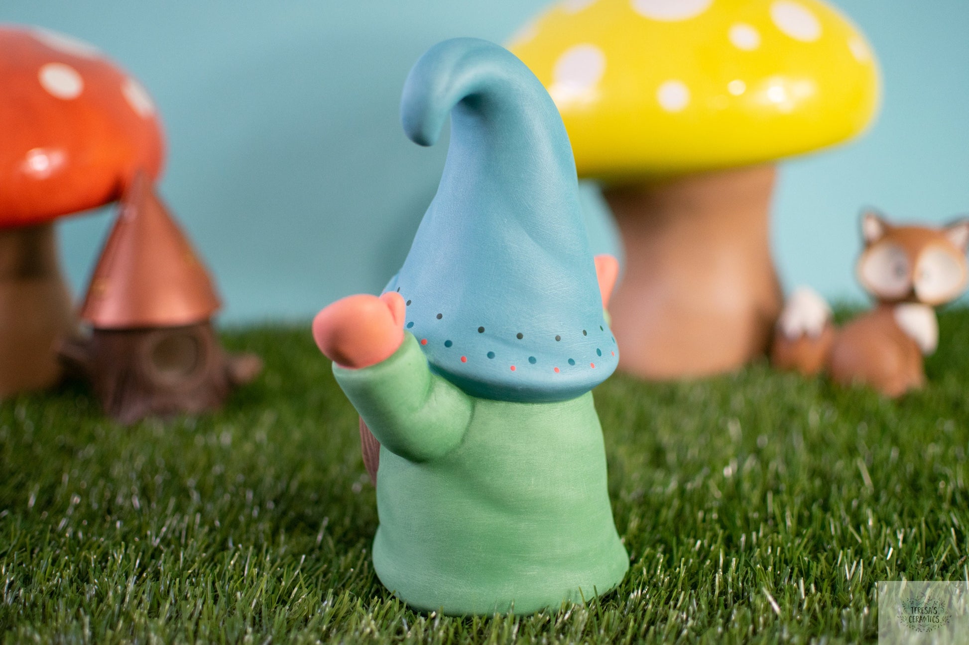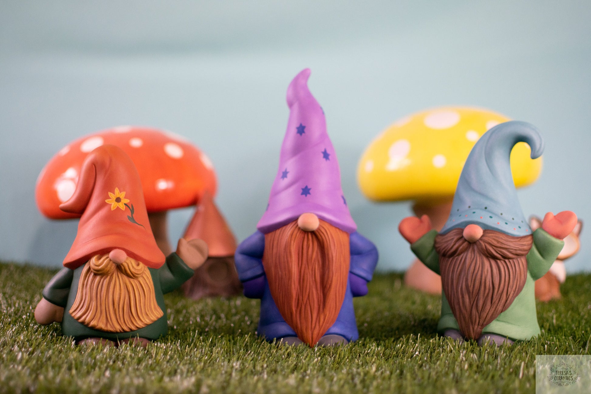 All gnomes are handmade using the slip casting method. Each whimsical woodland gnome is removed from the ceramic mold, cleaned, fired in the kiln and removed once cooled. After the piece cools, which takes half of a day, they are cleaned once more and then painted to be shipped off to your doorstep!